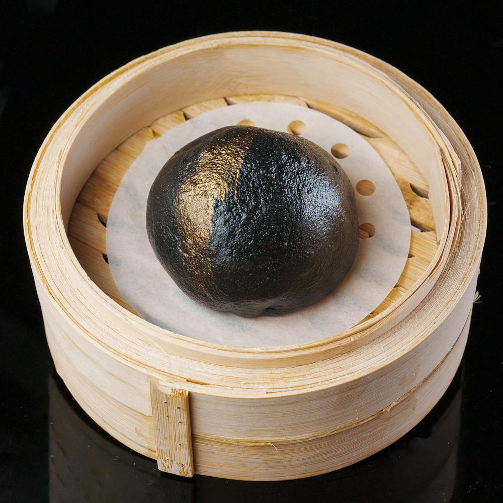 Pane leggermente dolce al vapore, farina 00 e carbone vegetale, ripieno con la crema di tarro