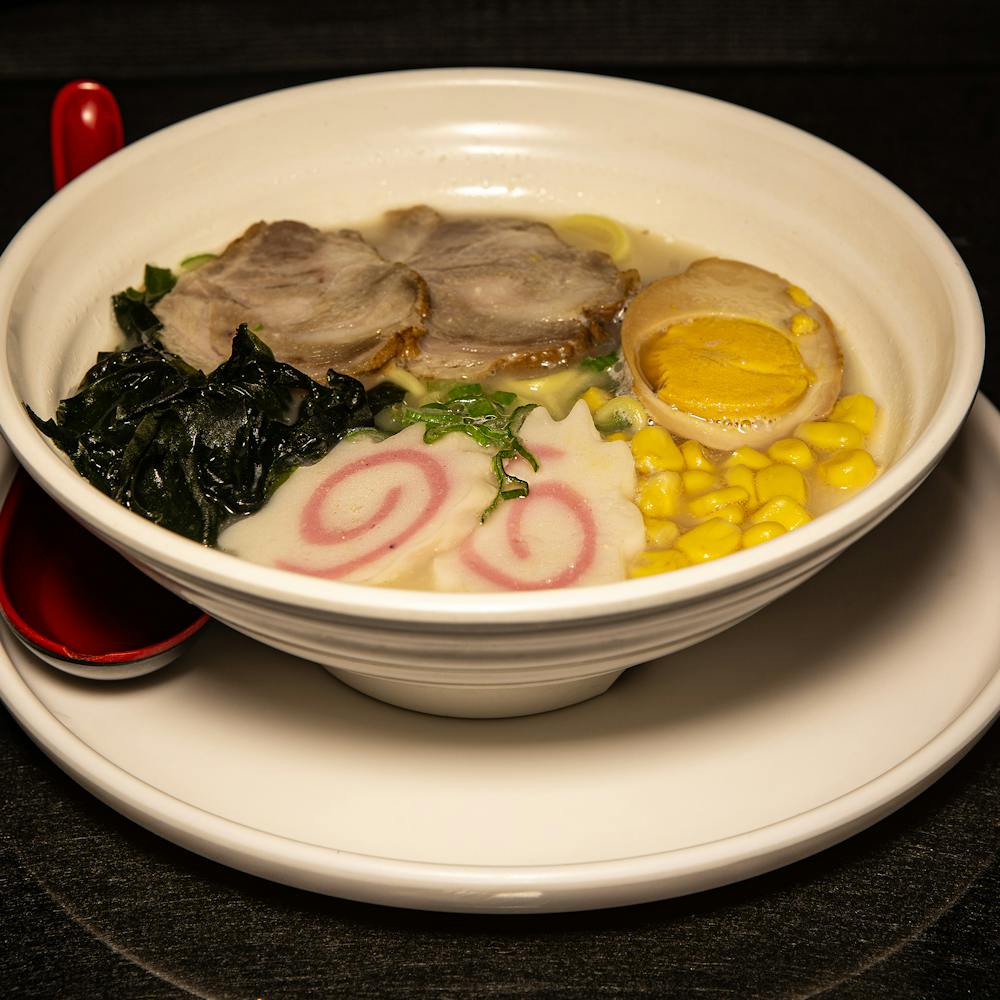 Noodles, brodo di miso, mais, olio di sesamo, uovo sodo, cipollotto, verdure, noce di burro, naruto, salsa tantan, leggermente piccante, rapa giapponese