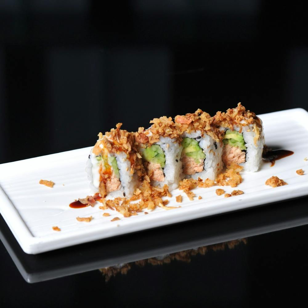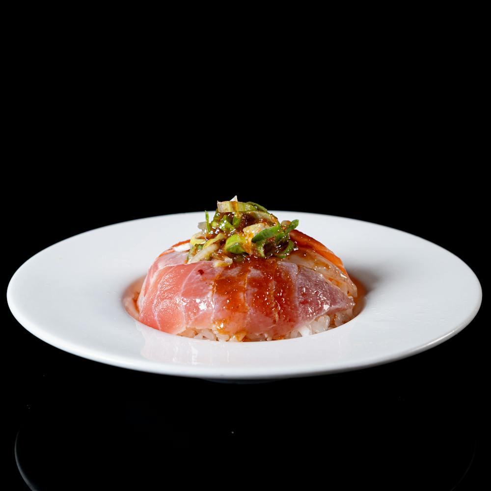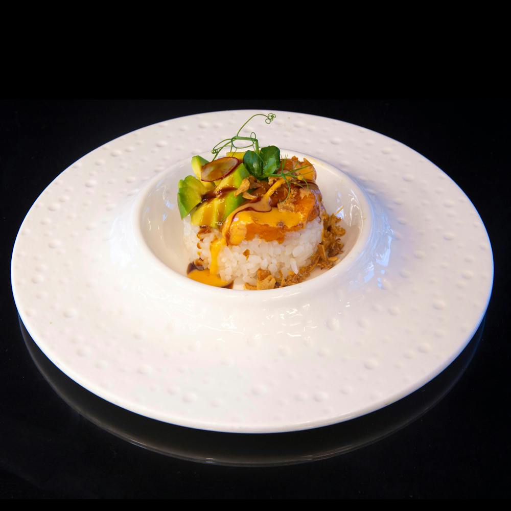 Riso bianco, tartare salmone piccante, avocado, onion crunch, salsa teriyaki