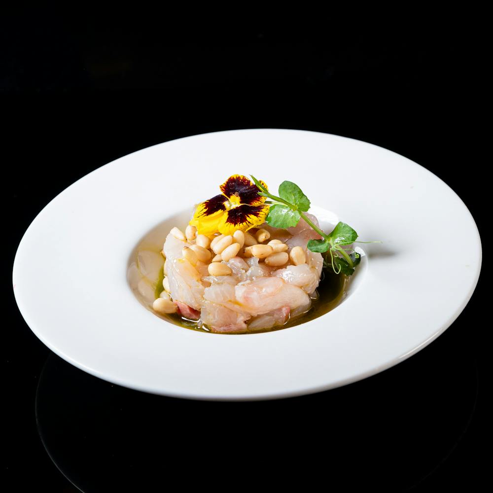 Filetto di ricciola fresco tagliato a coltello, guarnito con pinoli, salsa al basilico, limone EVO, sale e pepe
