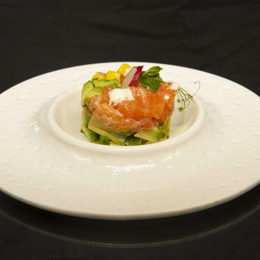 Tartare di salmone e avocado condito con maionese kompie e punta di wasabi, guarnito con chicchi di mais