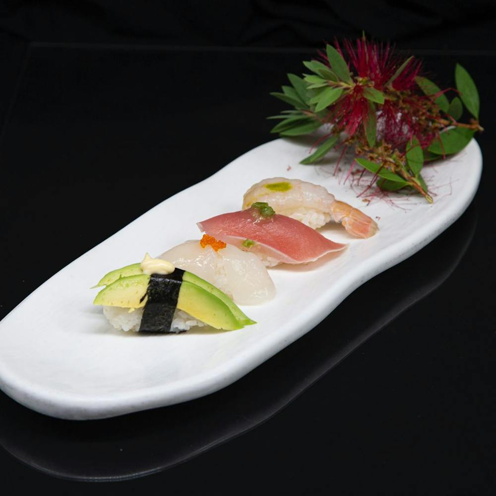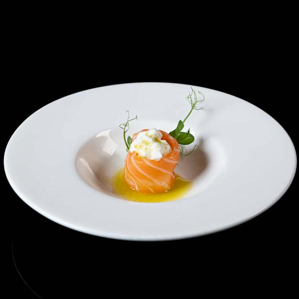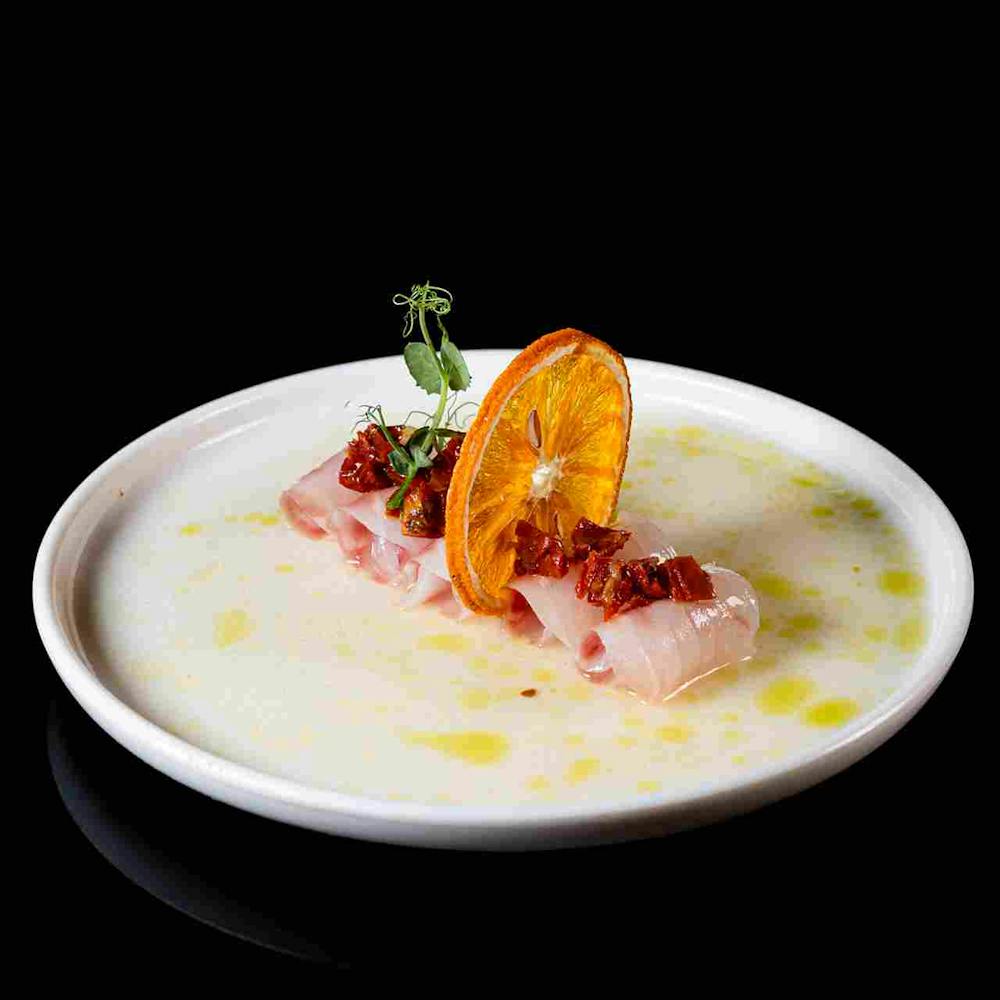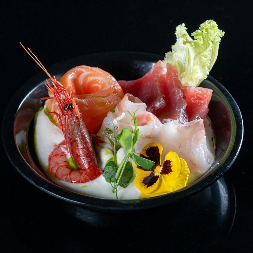 3 sashimi di salmone, 3 sashimi di tonno, 3 sashimi di branzino, 1 gambero rosso di Mazara, crema di burrata, estratto di basilico all'oriente