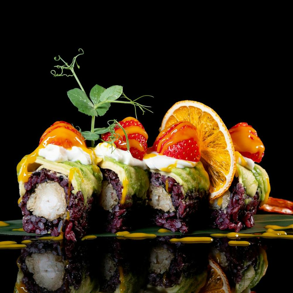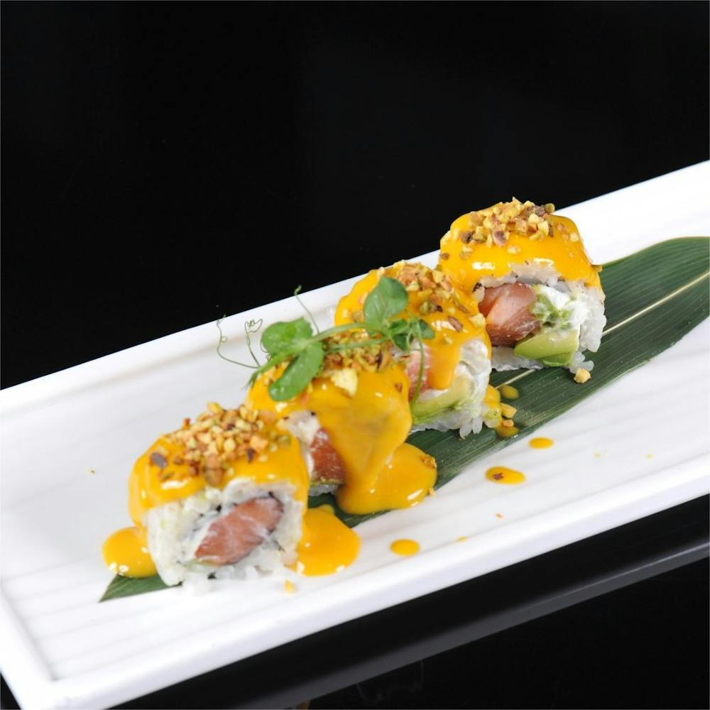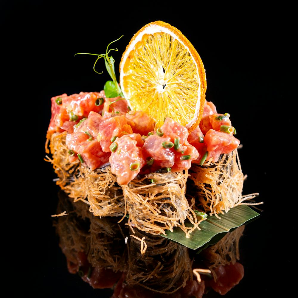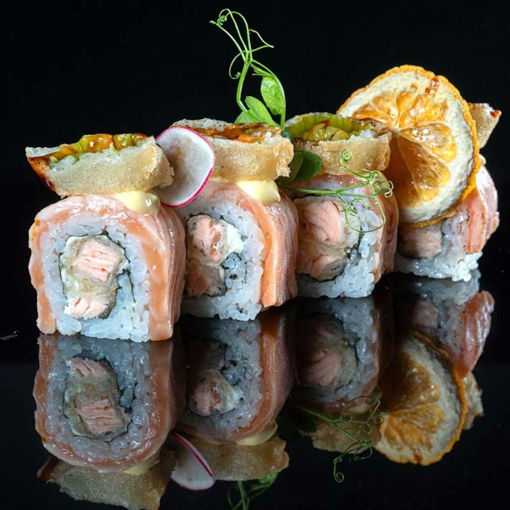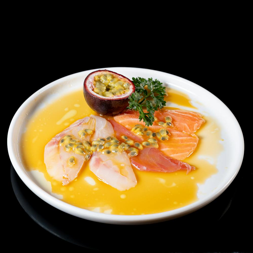 Un connubio di sapori: agrumi del ponzu, la ricchezza del sesamo e la cremosità del goma, con il tocco piccante del wasabi e la dolcezza esotica della frutta della passione.