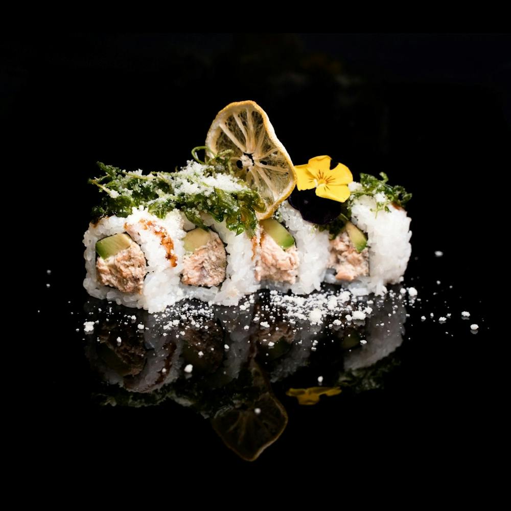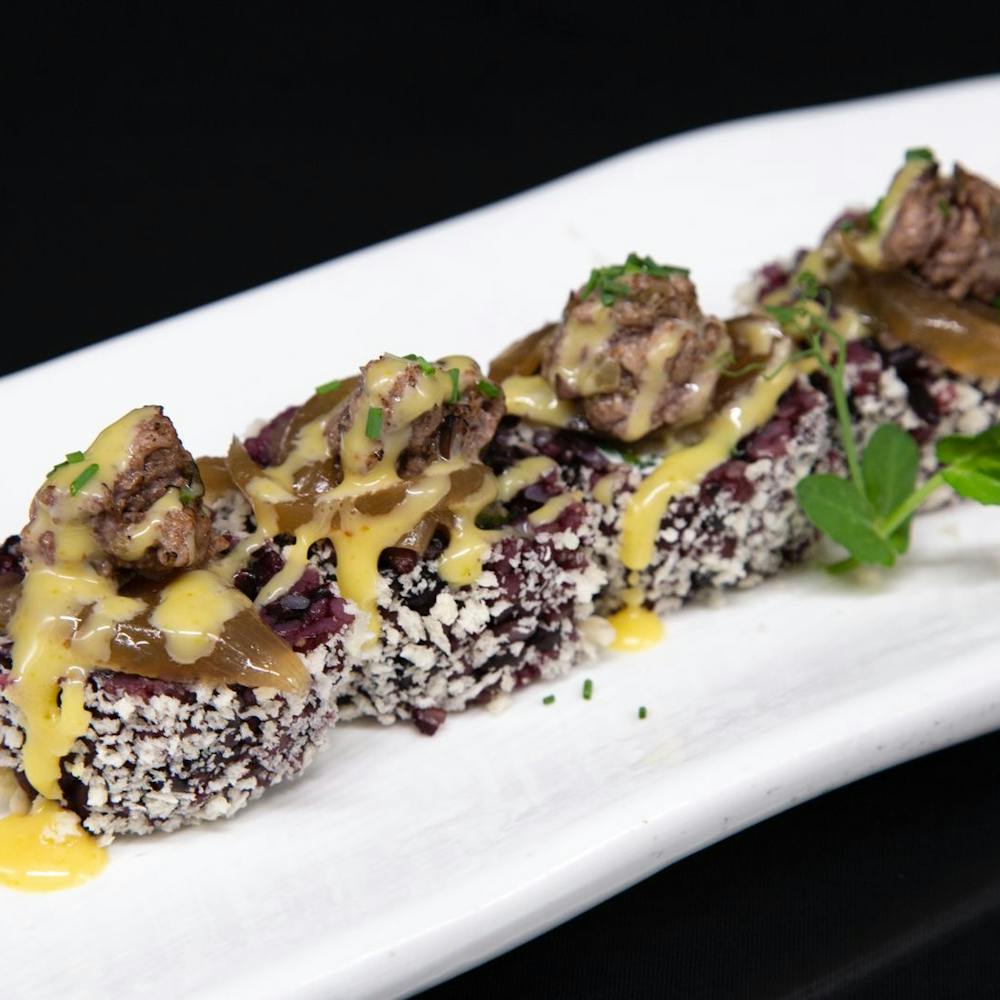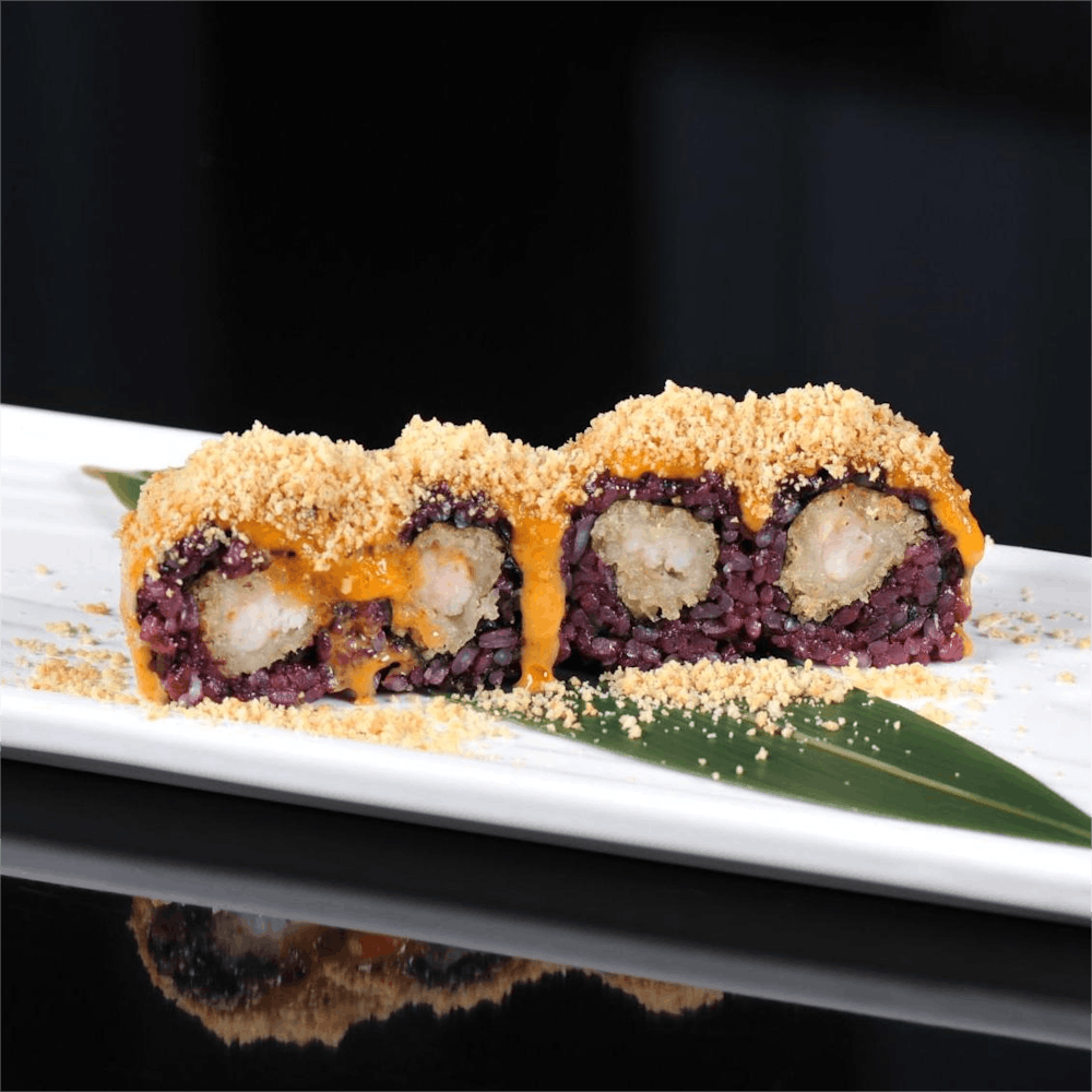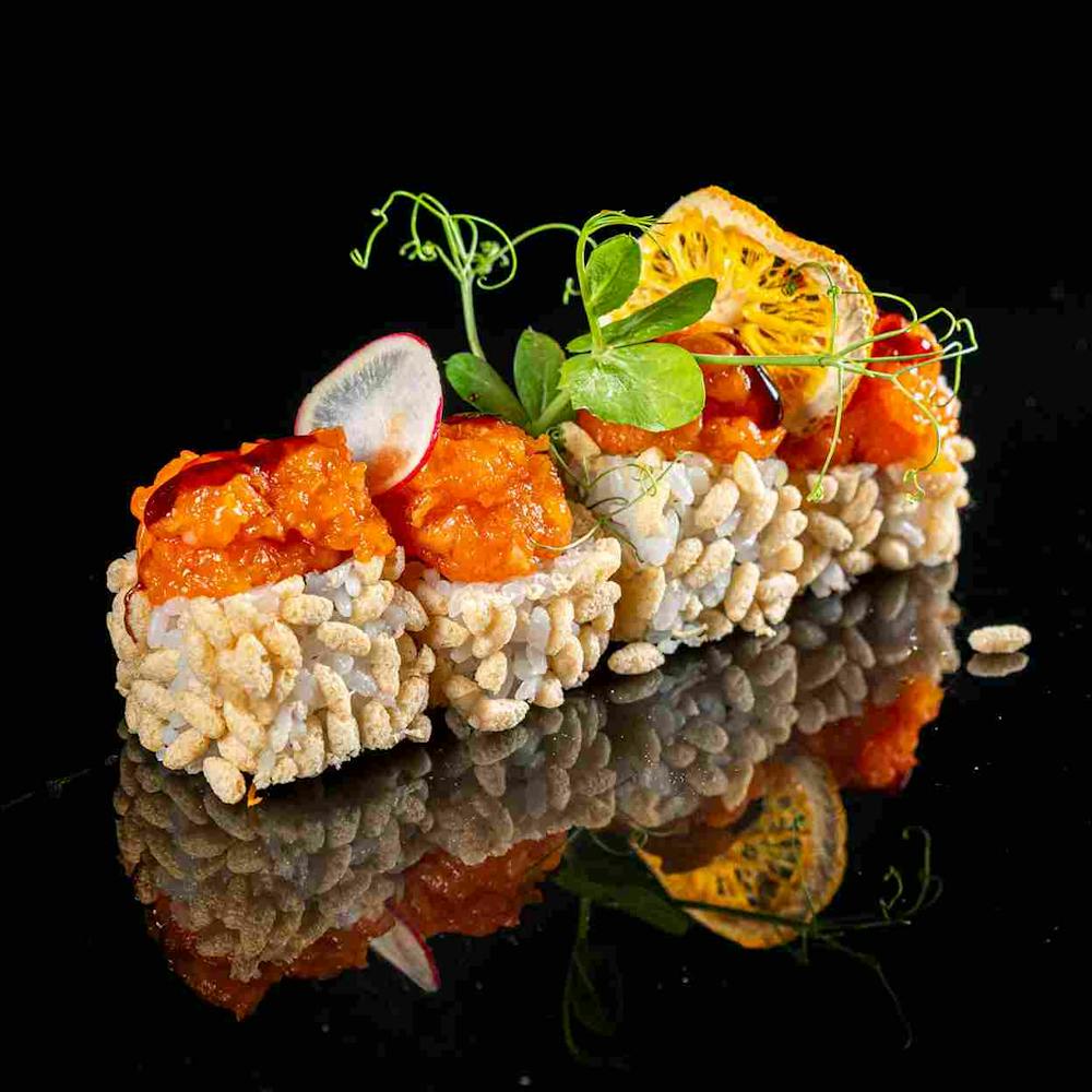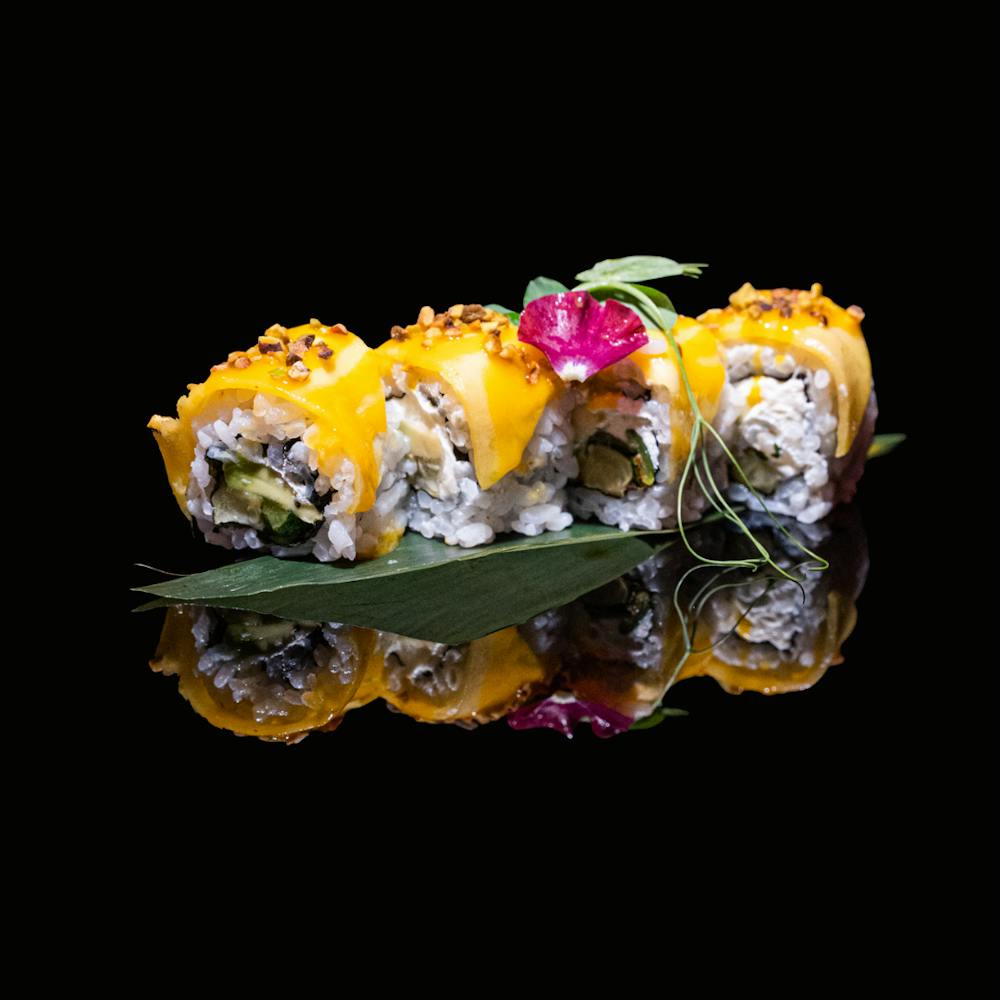 Un connubio di sapori: agrumi del ponzu, la ricchezza del sesamo e la cremosità del goma, con il tocco piccante del wasabi e la dolcezza esotica della frutta della passione.