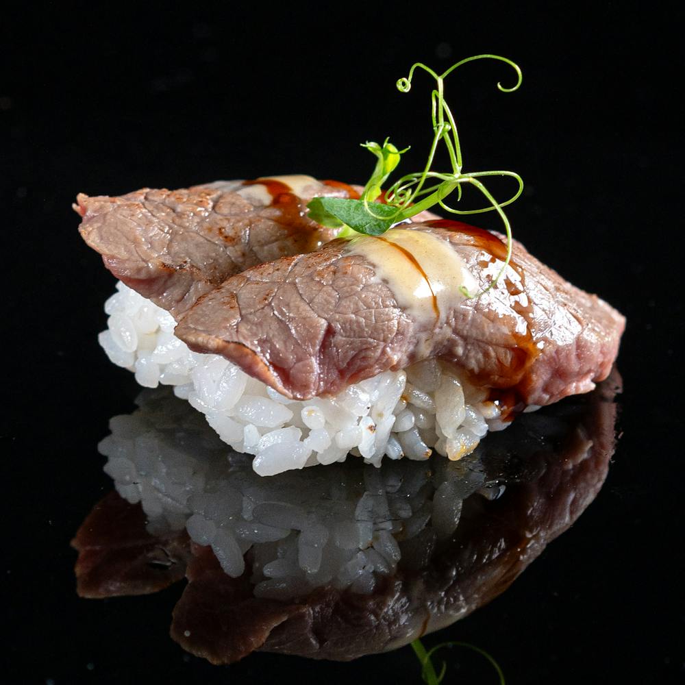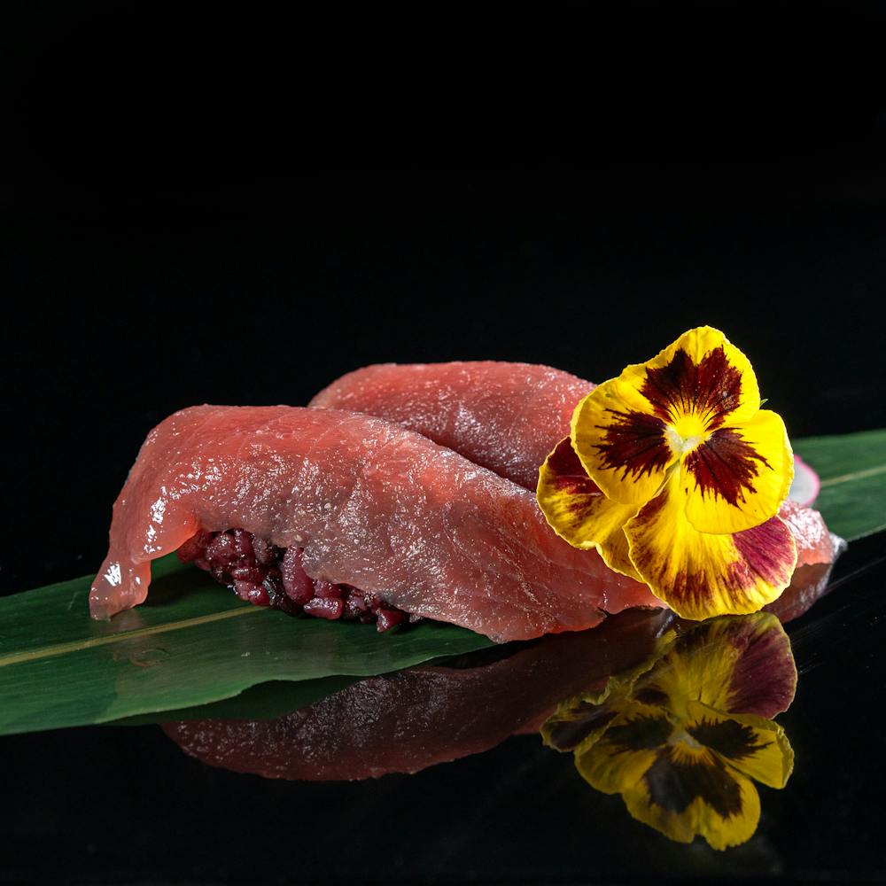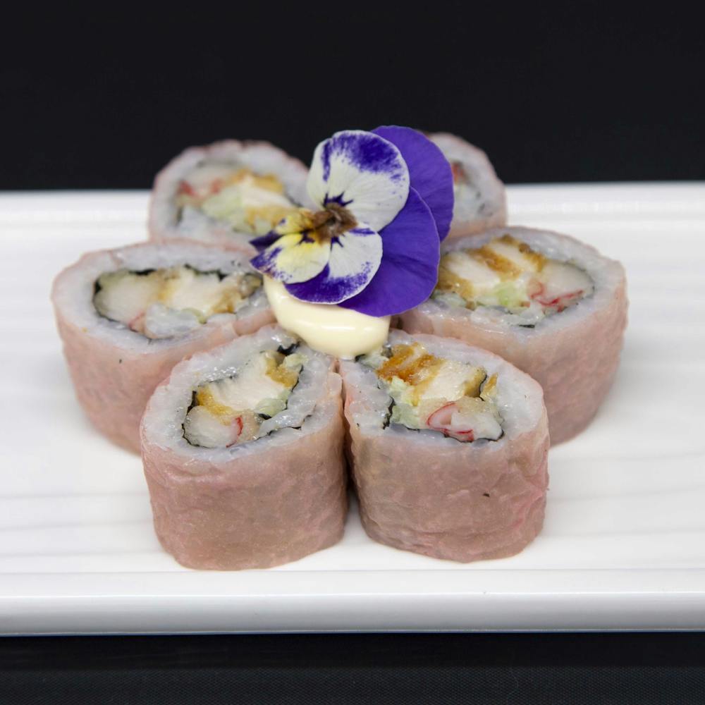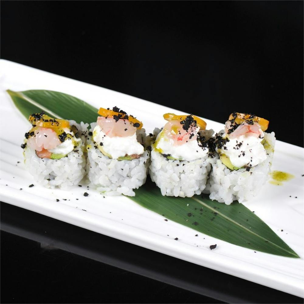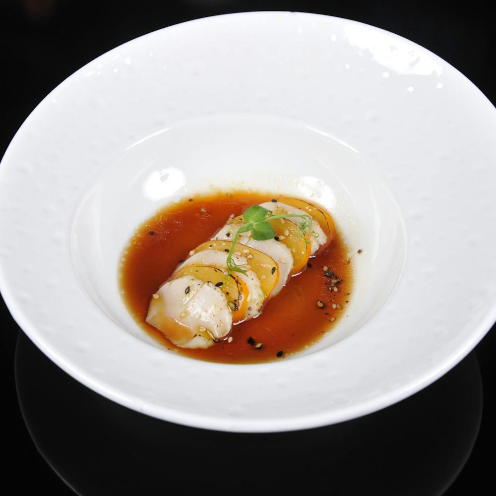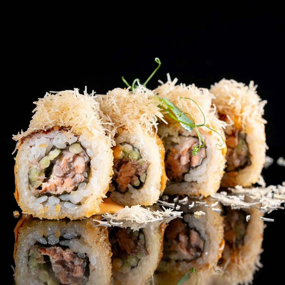 Un connubio di sapori: agrumi del ponzu, la ricchezza del sesamo e la cremosità del goma, con il tocco piccante del wasabi e la dolcezza esotica della frutta della passione.