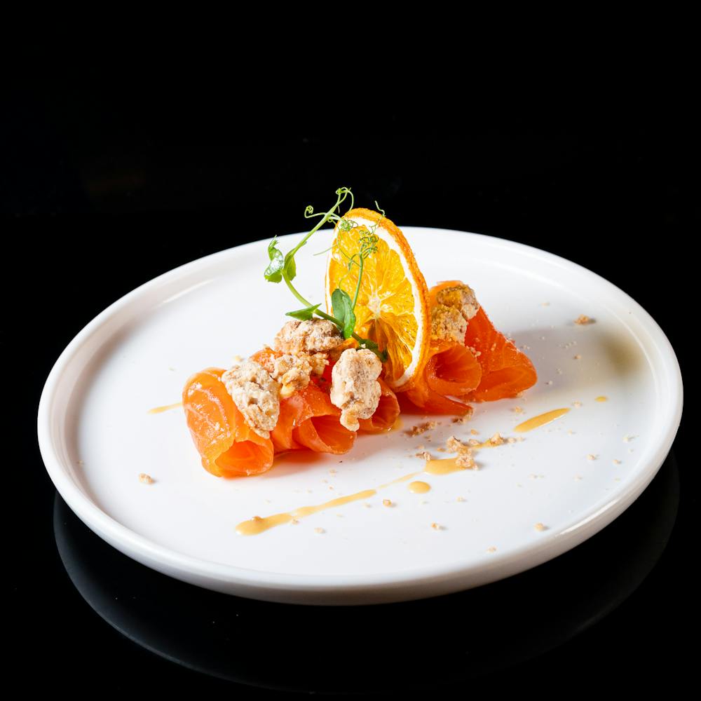 FETTE DI SALMONE SCOTTATO, SALSA DI MANGO, GRANELLI DI PISTACCHIO