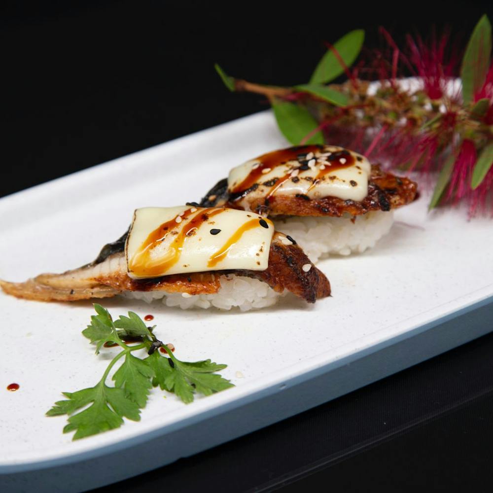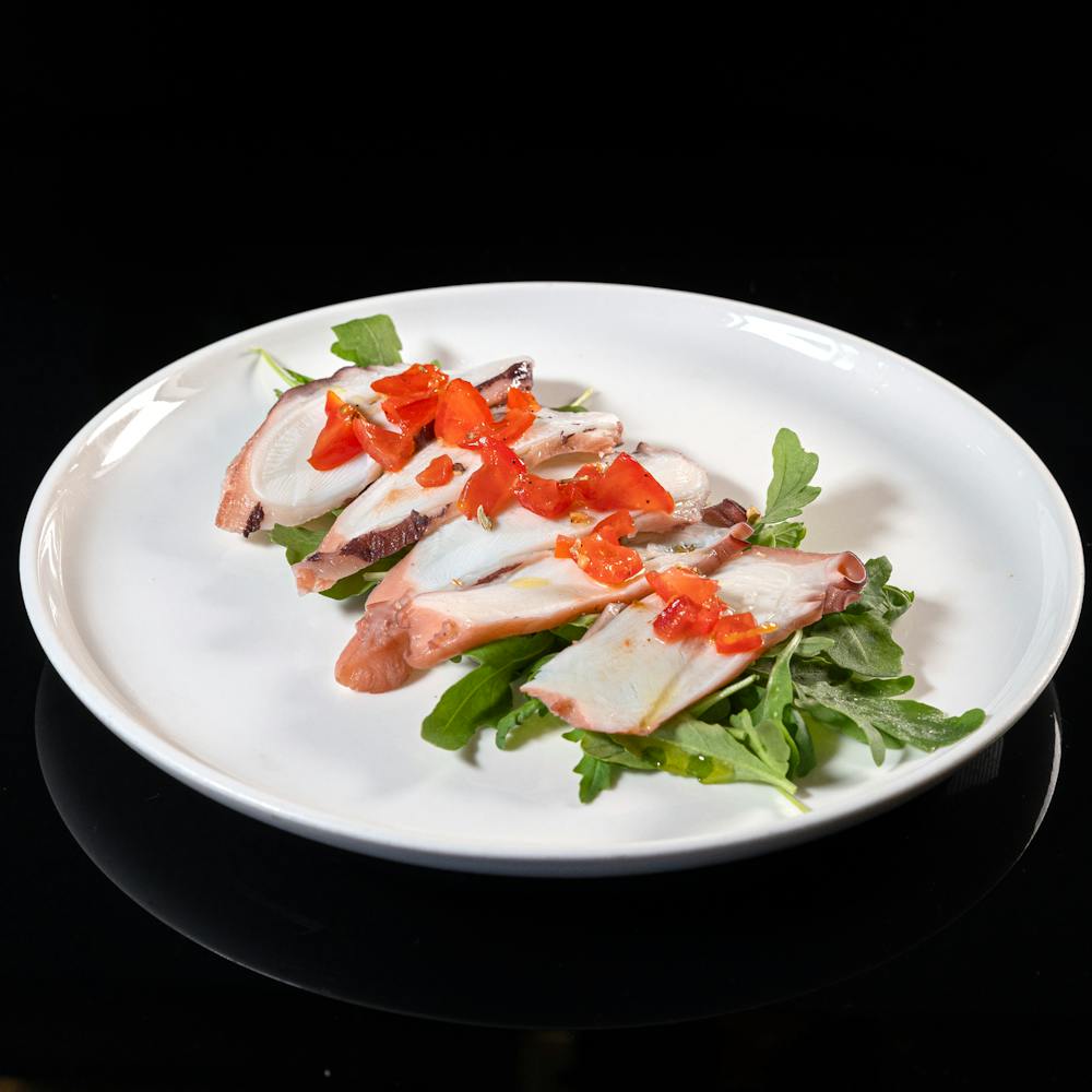 seppia grigliata servito con salsa teriyaki. questo piatto pupo essere ordinato anche dalle persone celiaci specificando senza salsa teriyaki