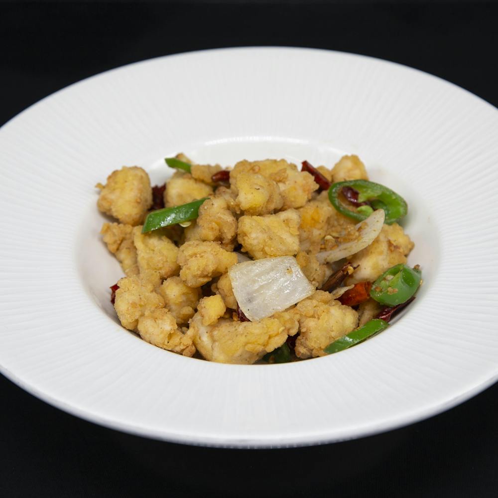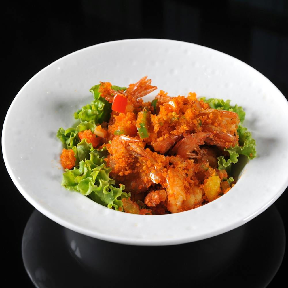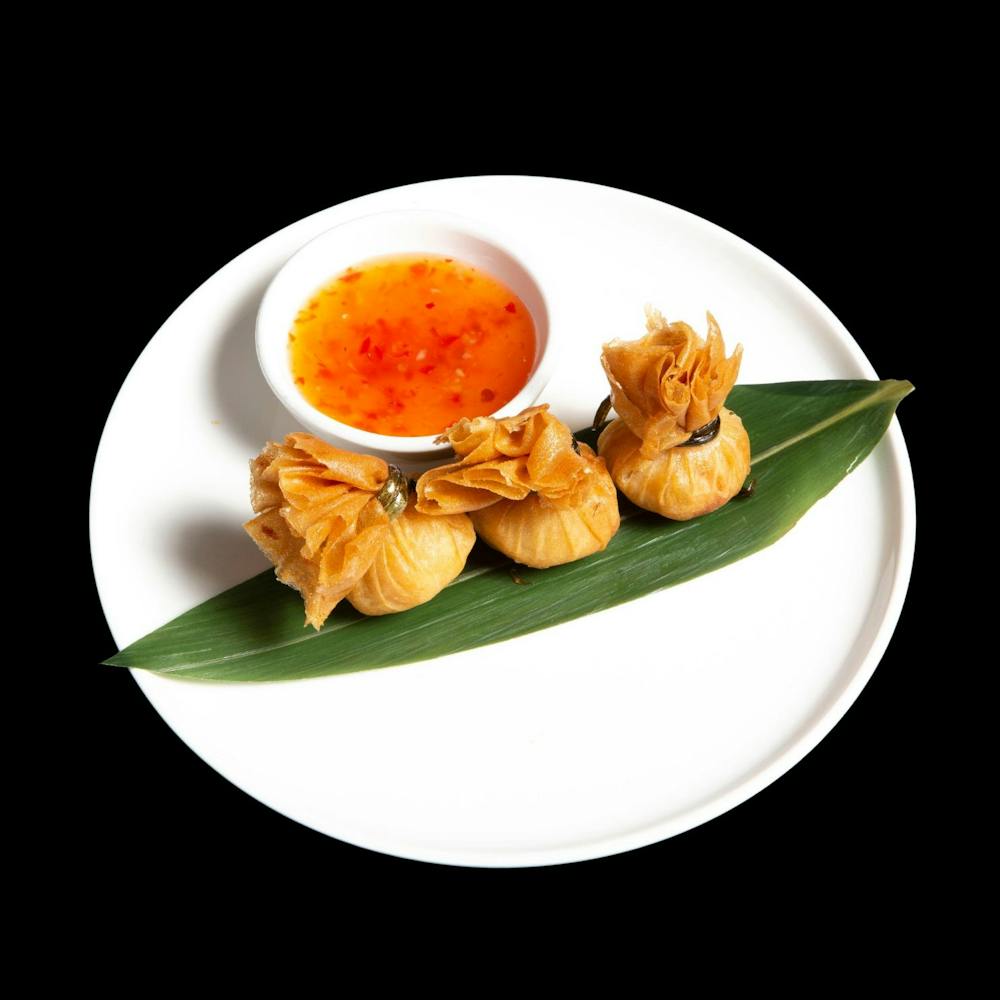 Sfoglia di soia fritta con ripieno di zucca, carote e gamberi