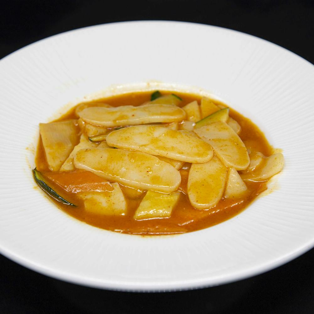 Riso bianco saltato con verdure miste, gamberi al latte di cocco e salsa curry