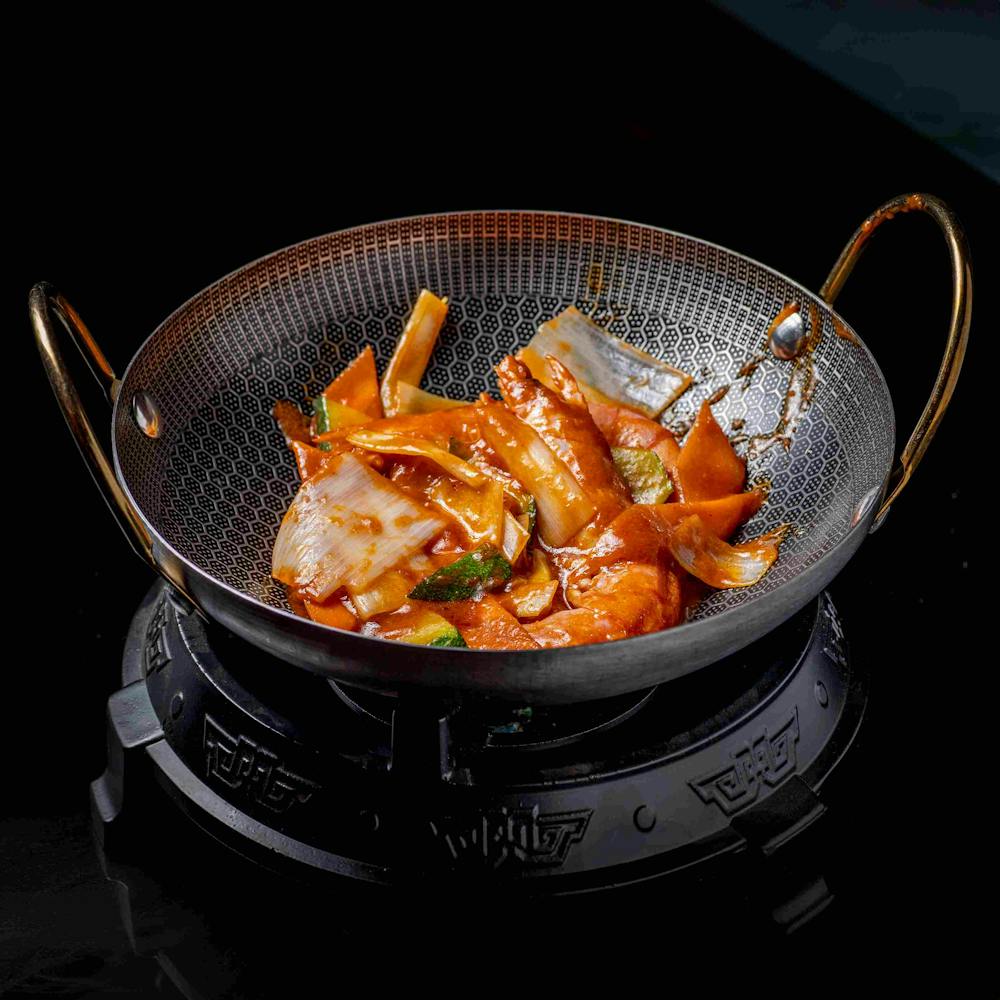 Mare misto con verdure alla salsa dello chef leggermente piccante, servito al tavolo nel wok con fornetto