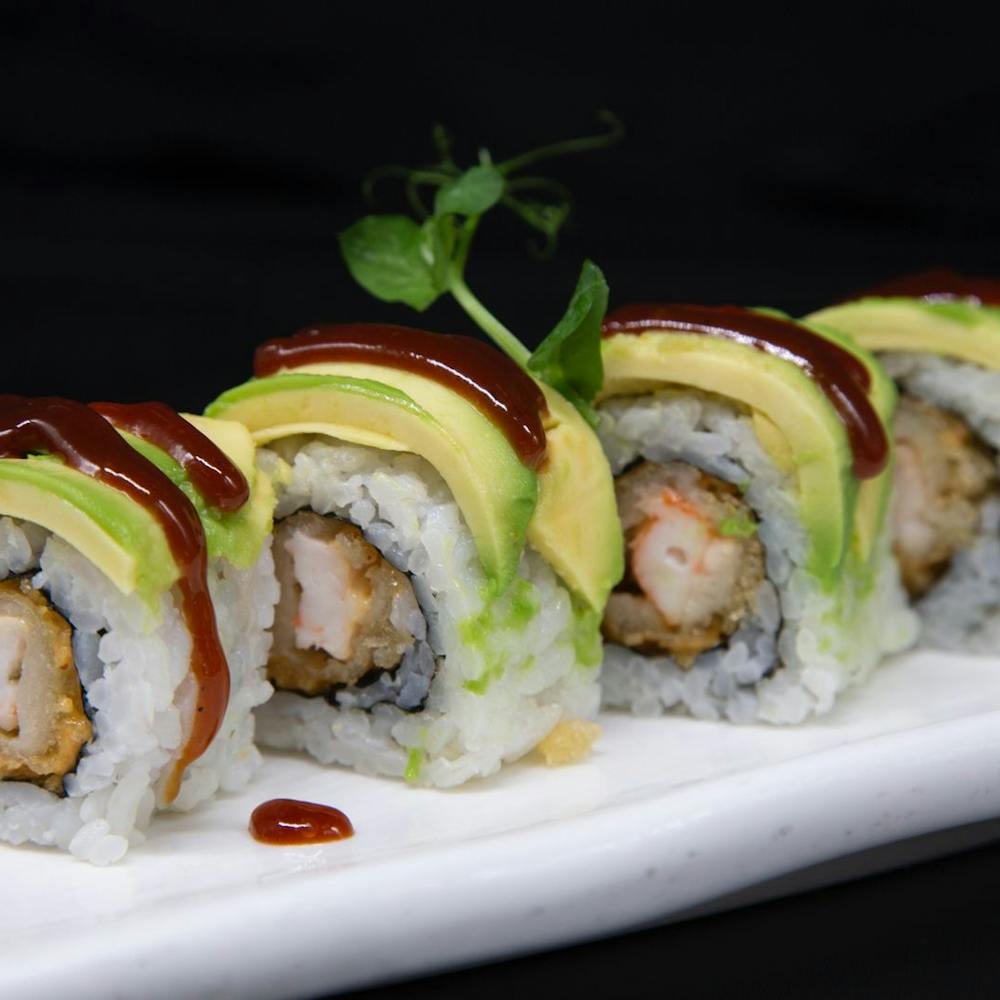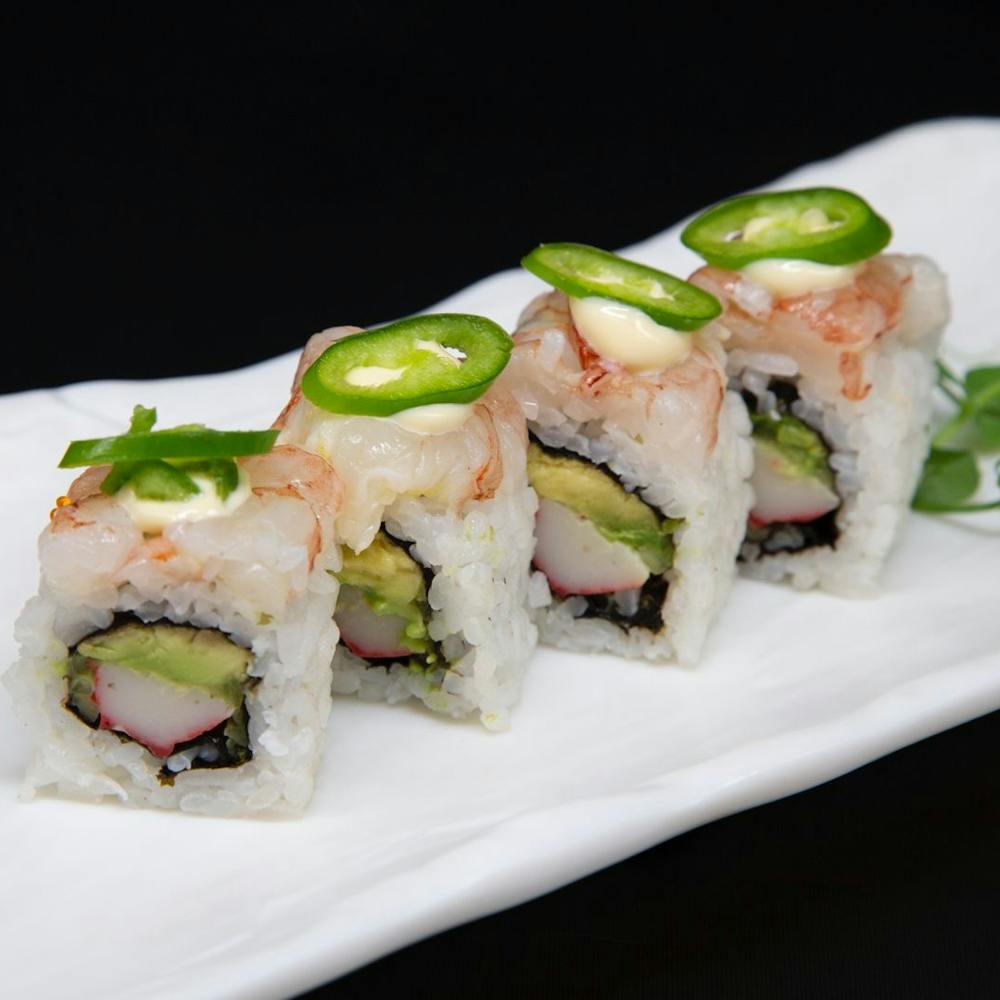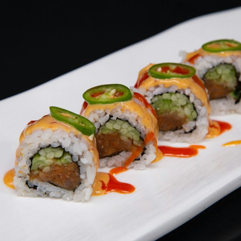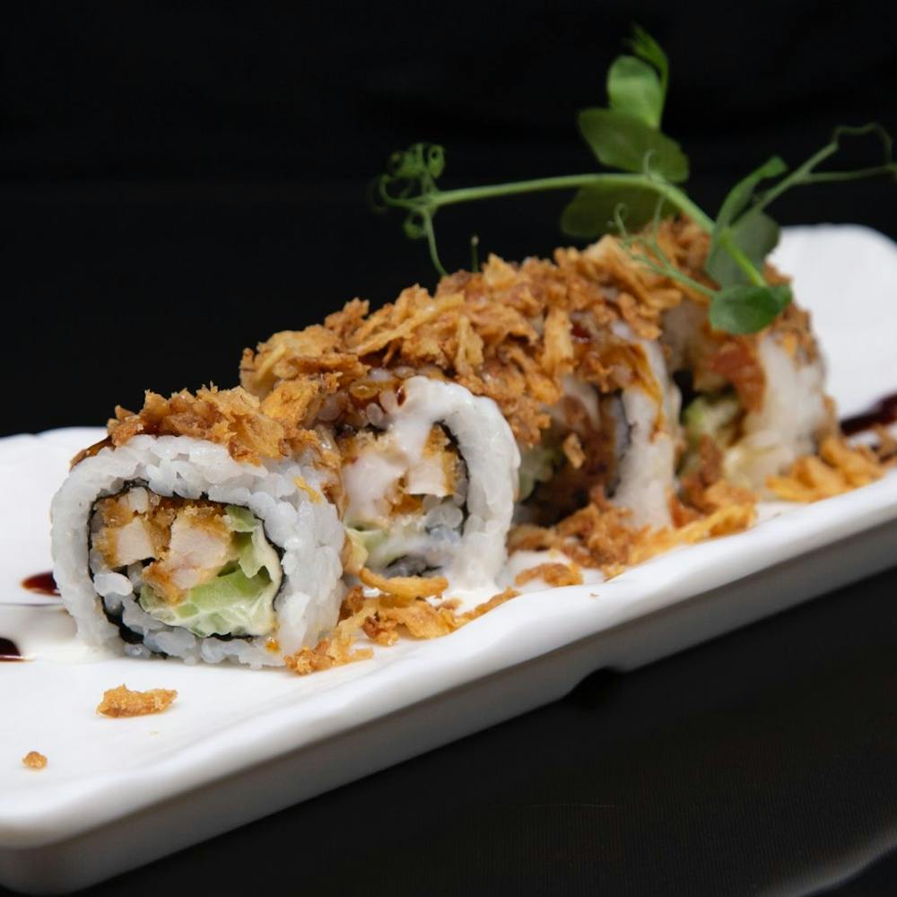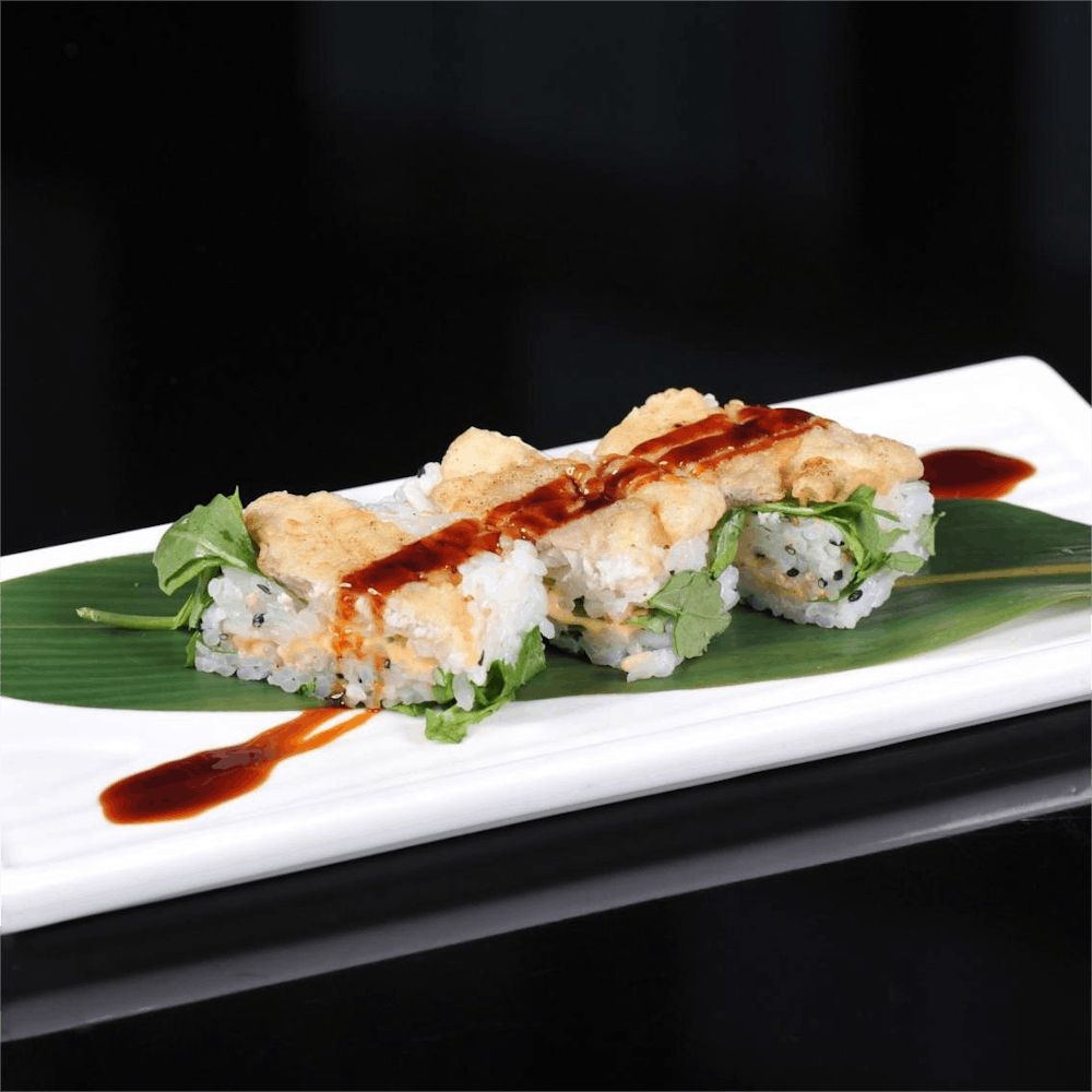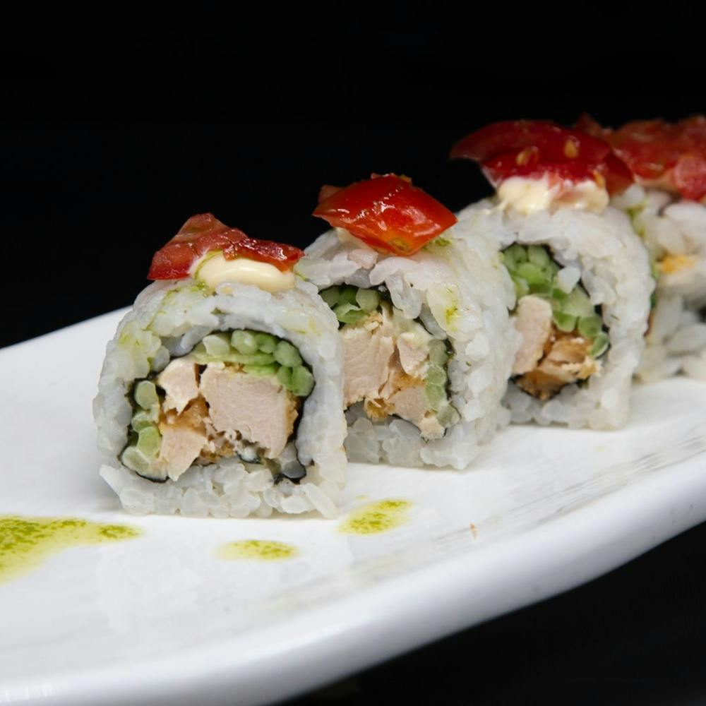 Petto di pollo grigliato, carote, edamame, avocado, mais, cetriolo, salsa cheese su riso da sushi selezionato.