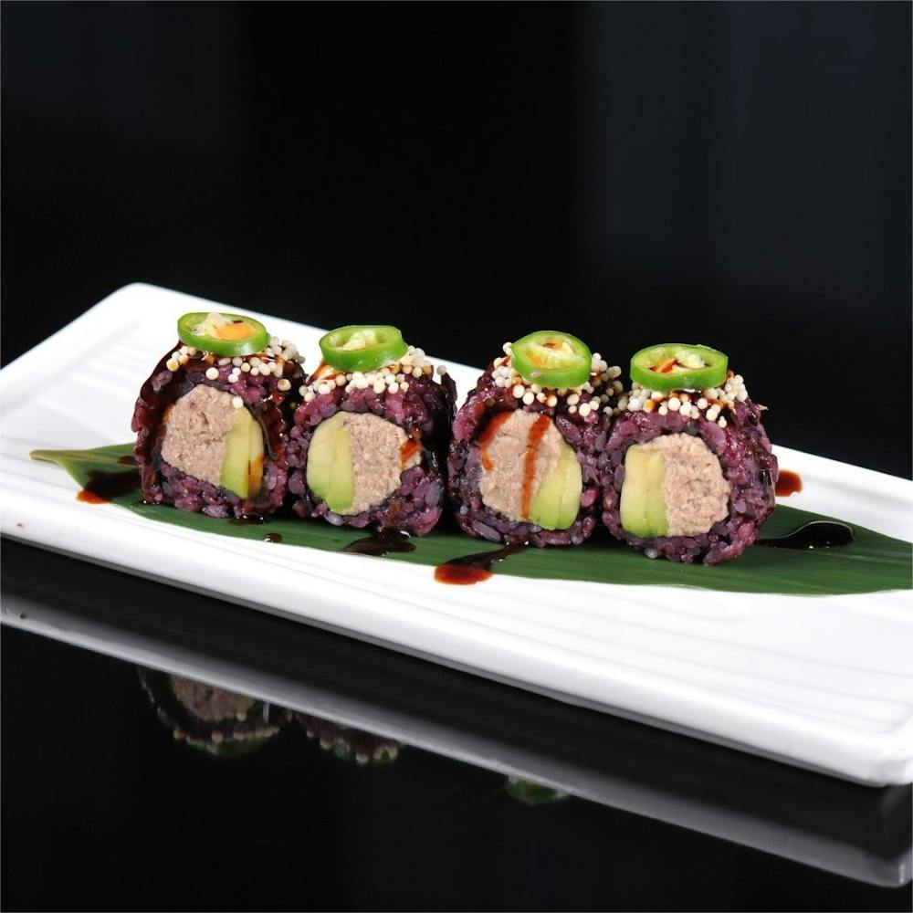 Tonno tataki in crosta di sesami, pomodorini, rucola, cetrioli, avocado, salsa tataki, su riso da sushi selezionato.