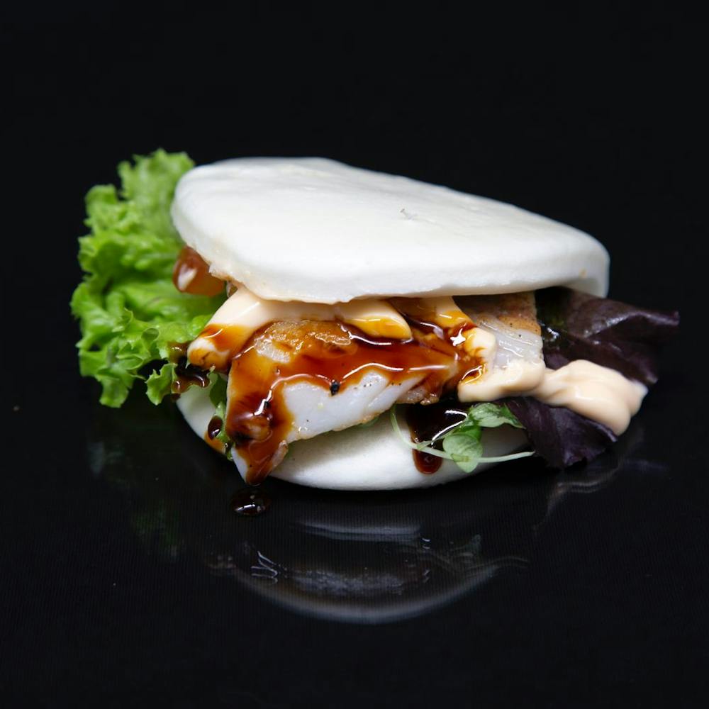 Pane al vapore ripieno di branzino alla piastra, salsa cheese e bbq, teriyaki e insalata