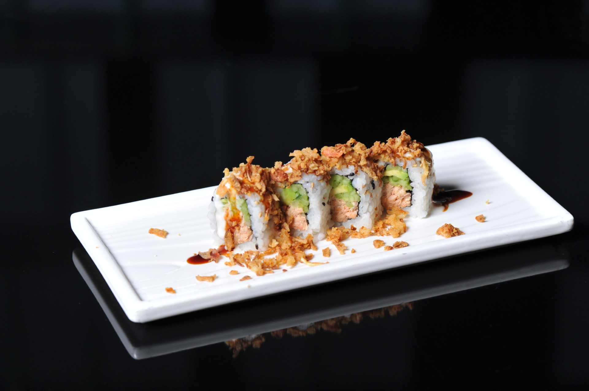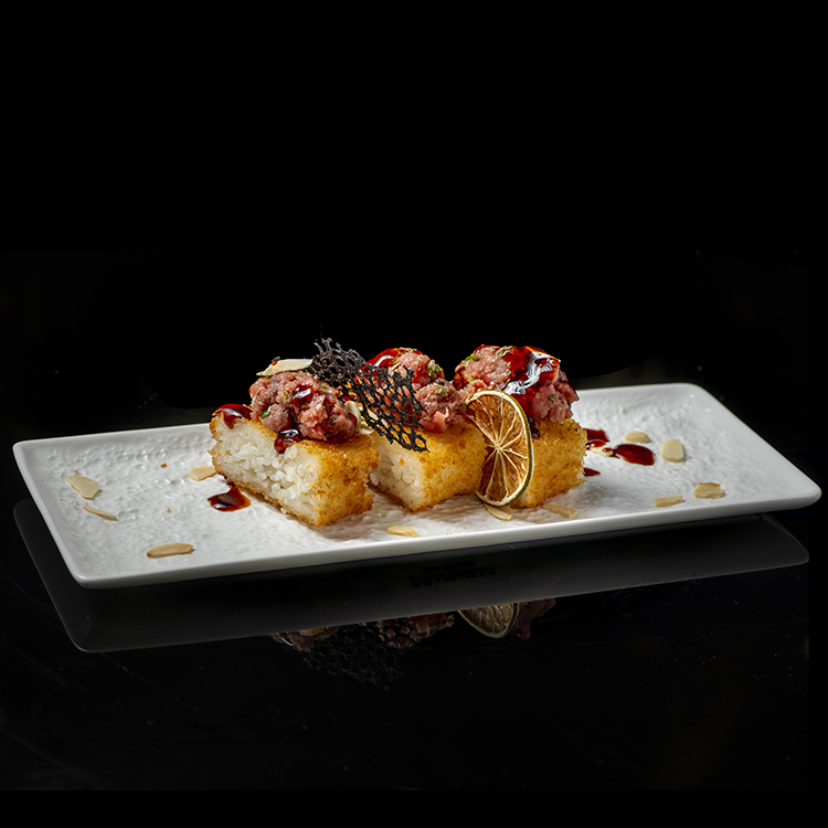 Riso bianco, tartare salmone piccante, avocado, onion crunch, salsa teriyaki
