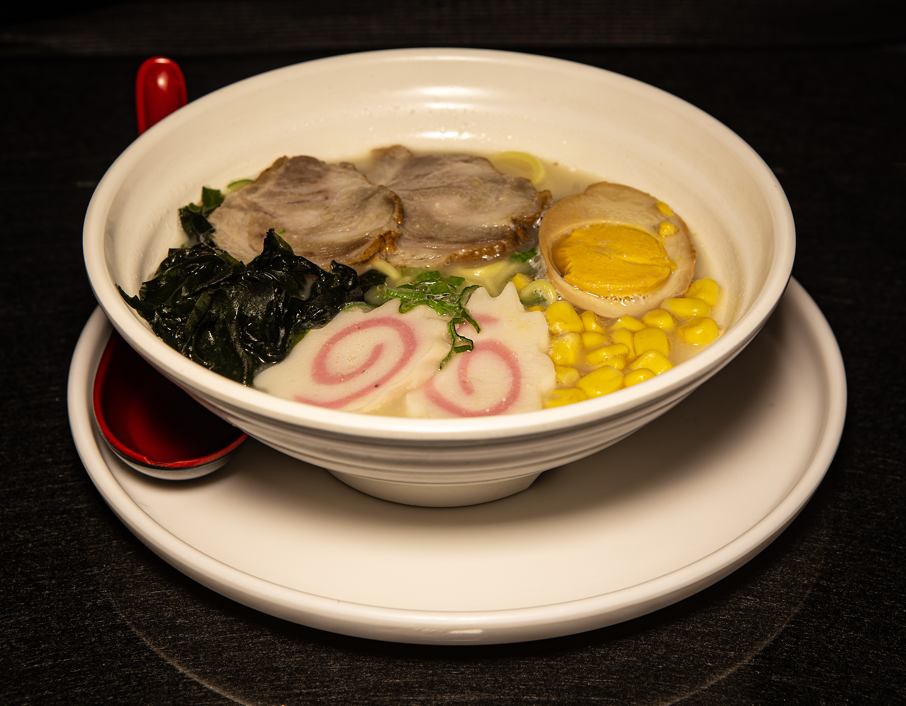 Noodles, brodo di miso, mais, olio di sesamo, uovo sodo, cipollotto, verdure, noce di burro, naruto, salsa tantan, leggermente piccante, rapa giapponese