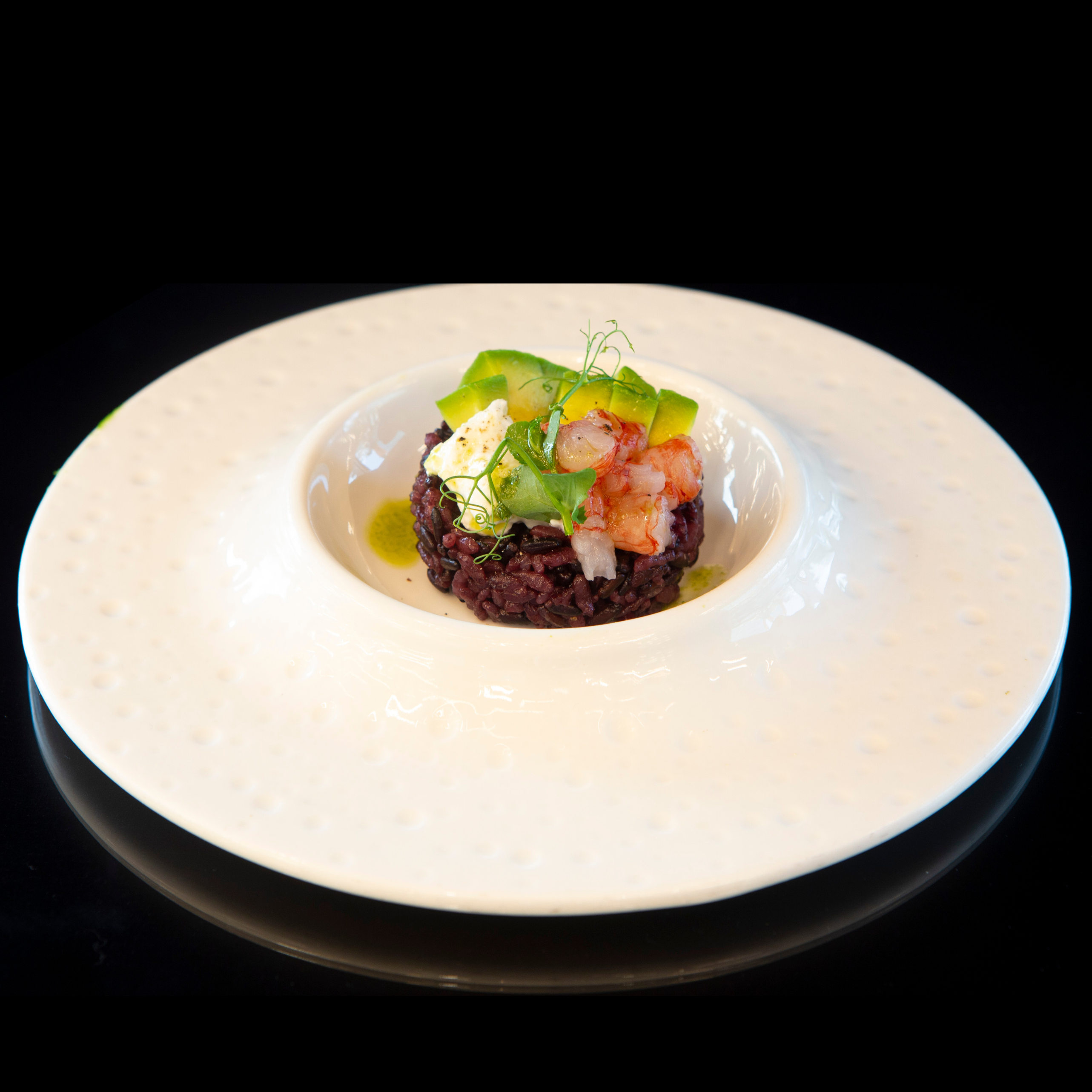 Riso venere, gambero rosso di Mazara, avocado, cuore di burrata, olio EVO, olio verde e basilico, sale e pepe, lime