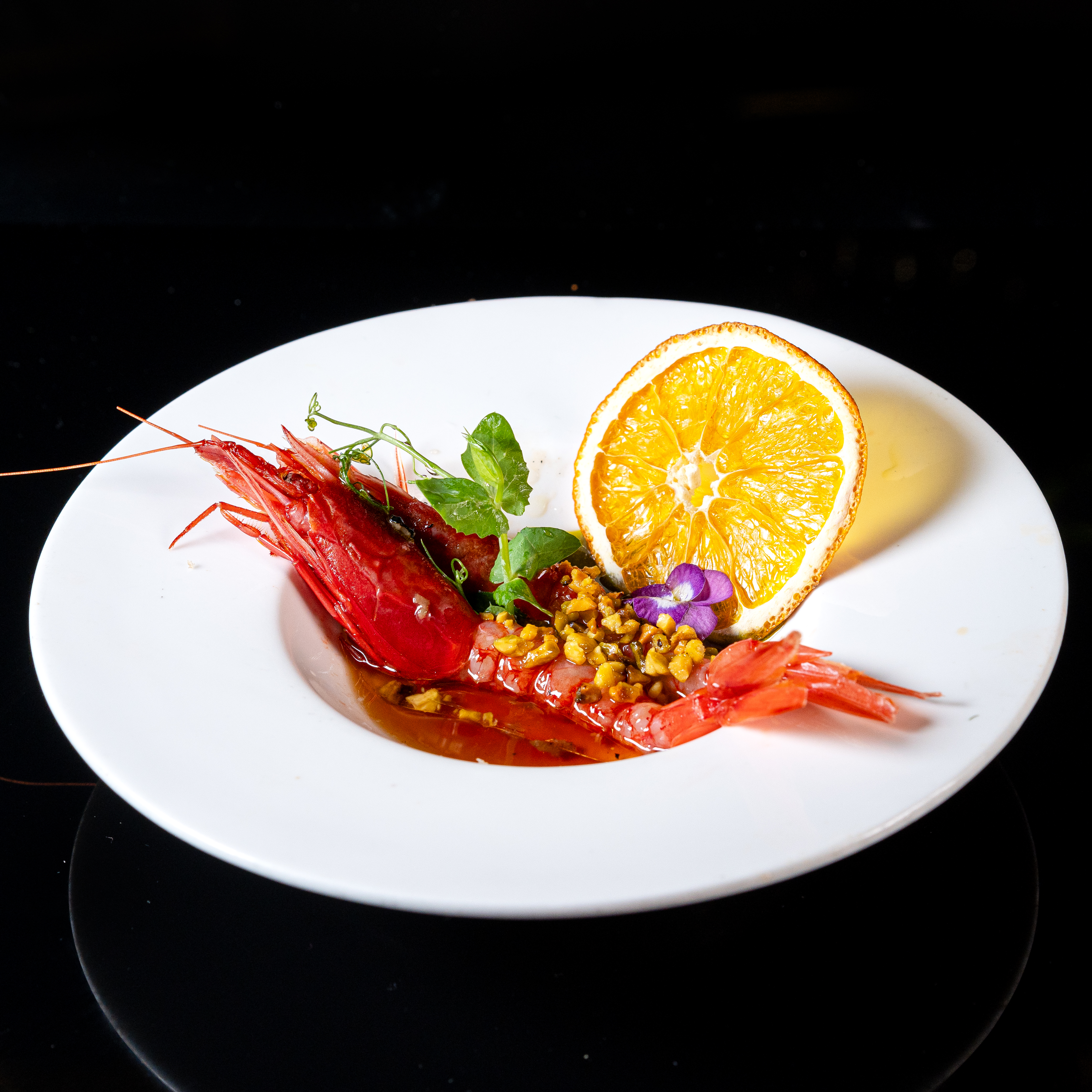 Sashimi di gambero rosso di Mazara, tinto nella salsa ponzu all'olio di prezzemolo e tartufato, con granelli di pistacchio