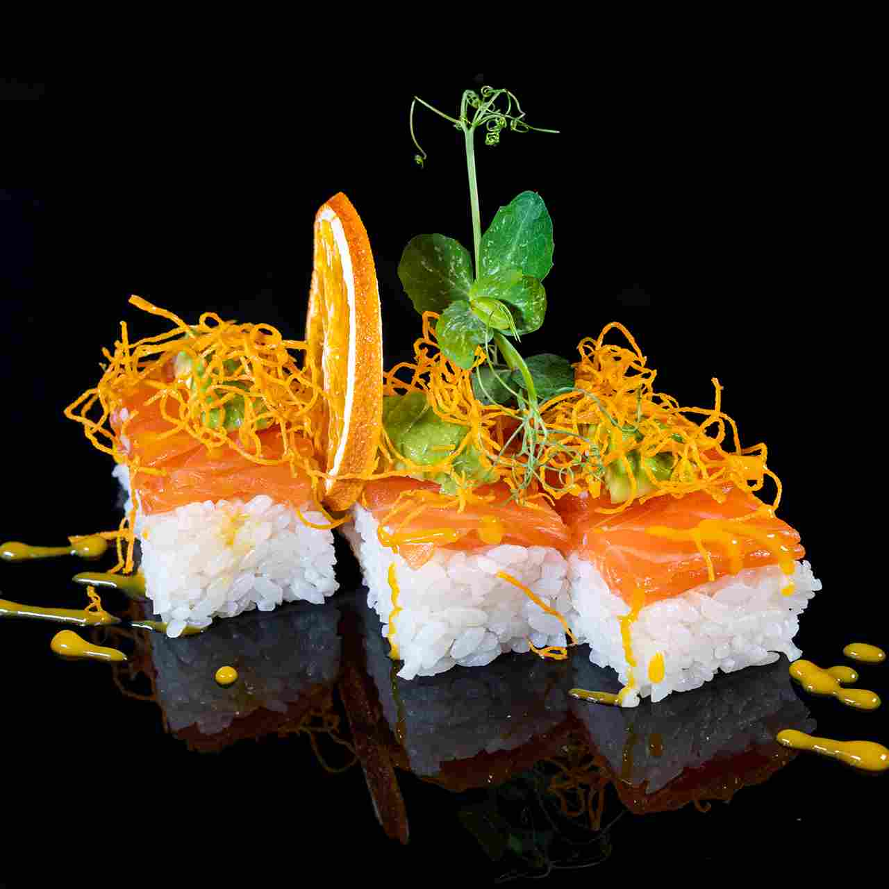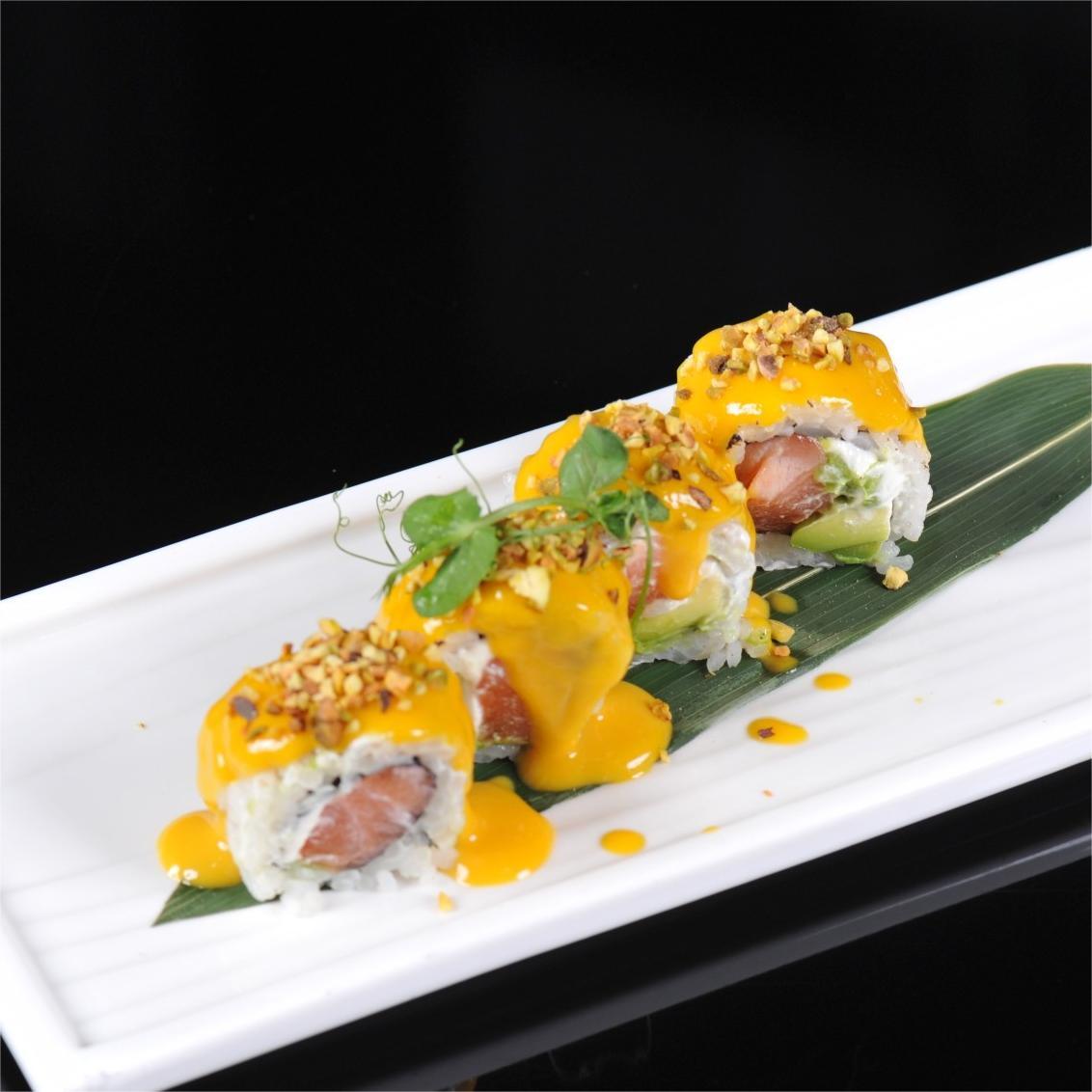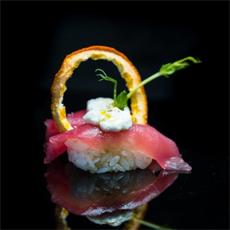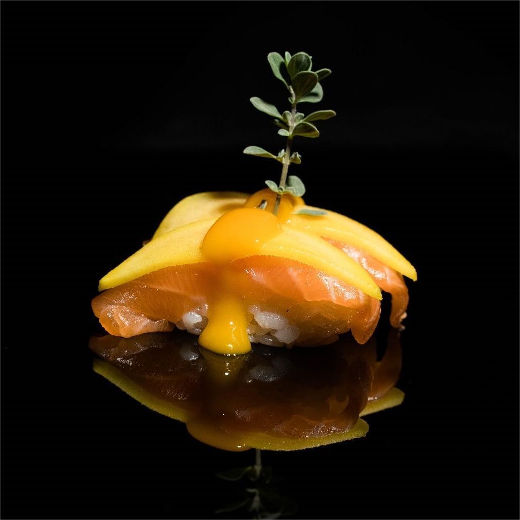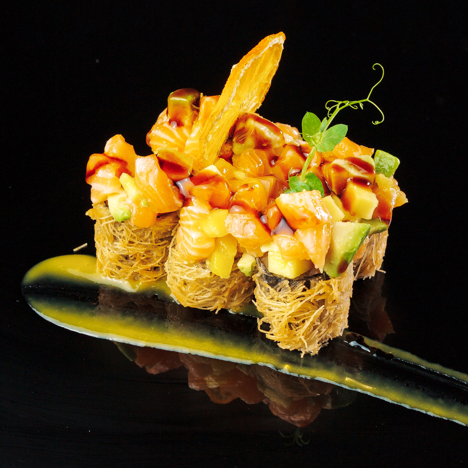 Un connubio di sapori: agrumi del ponzu, la ricchezza del sesamo e la cremosità del goma, con il tocco piccante del wasabi e la dolcezza esotica della frutta della passione.