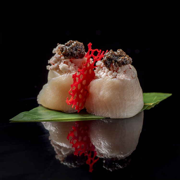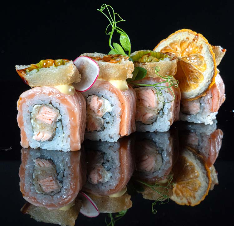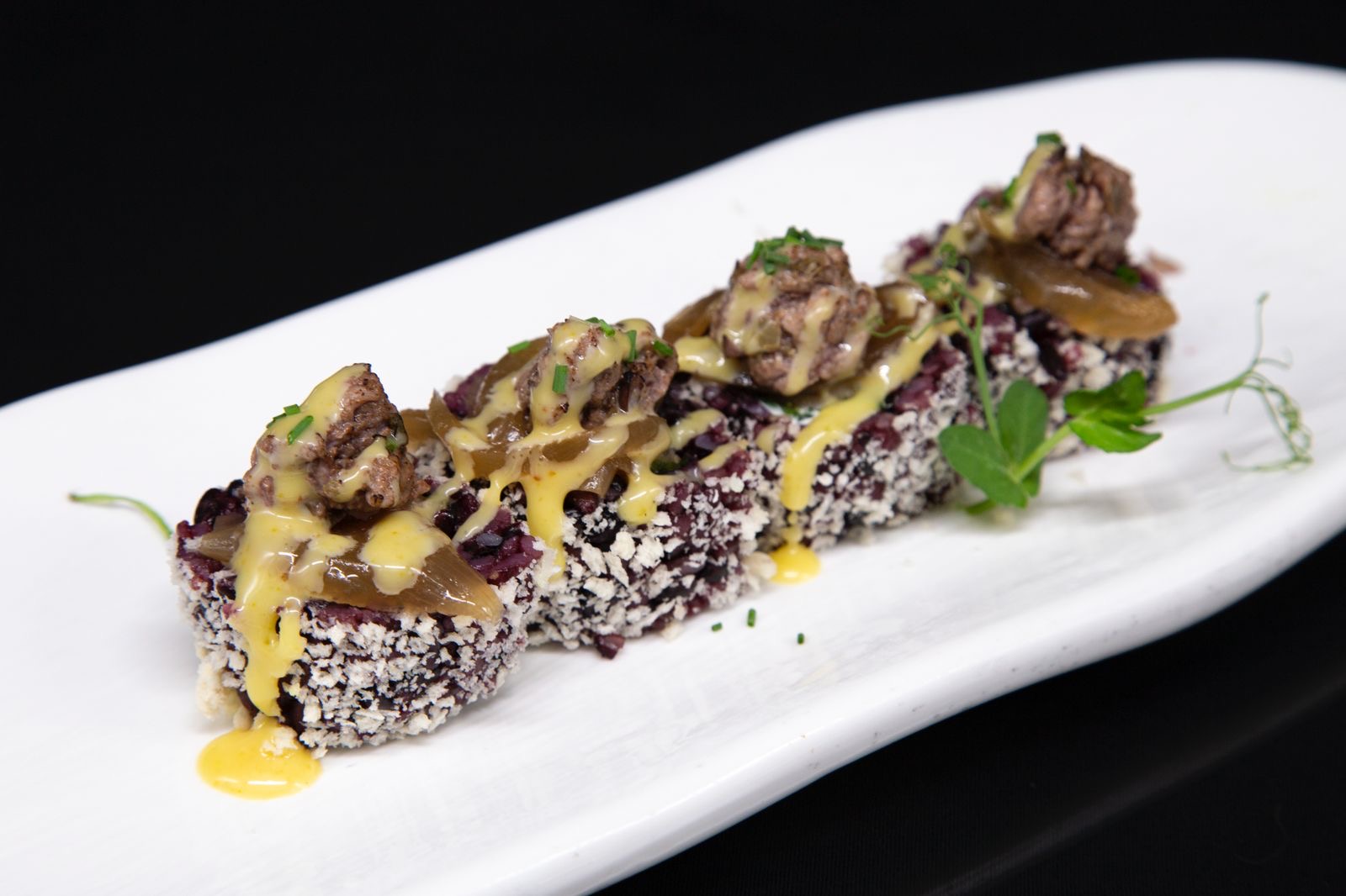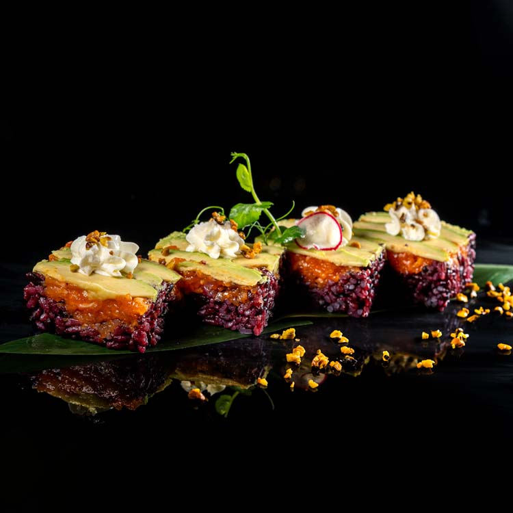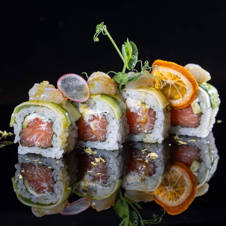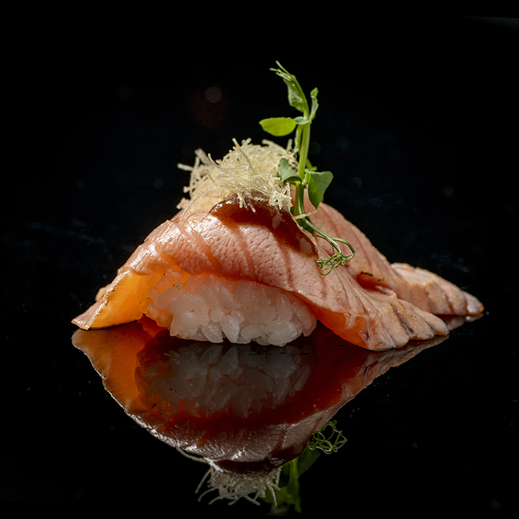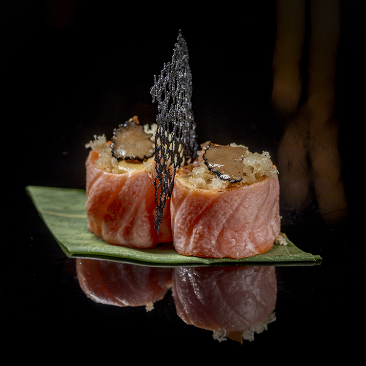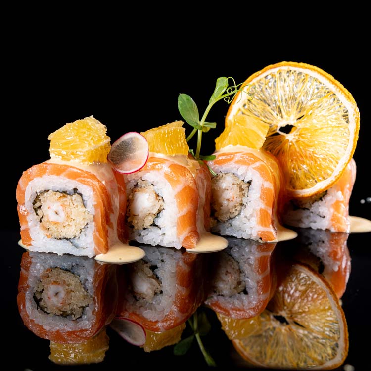 Un connubio di sapori: agrumi del ponzu, la ricchezza del sesamo e la cremosità del goma, con il tocco piccante del wasabi e la dolcezza esotica della frutta della passione.