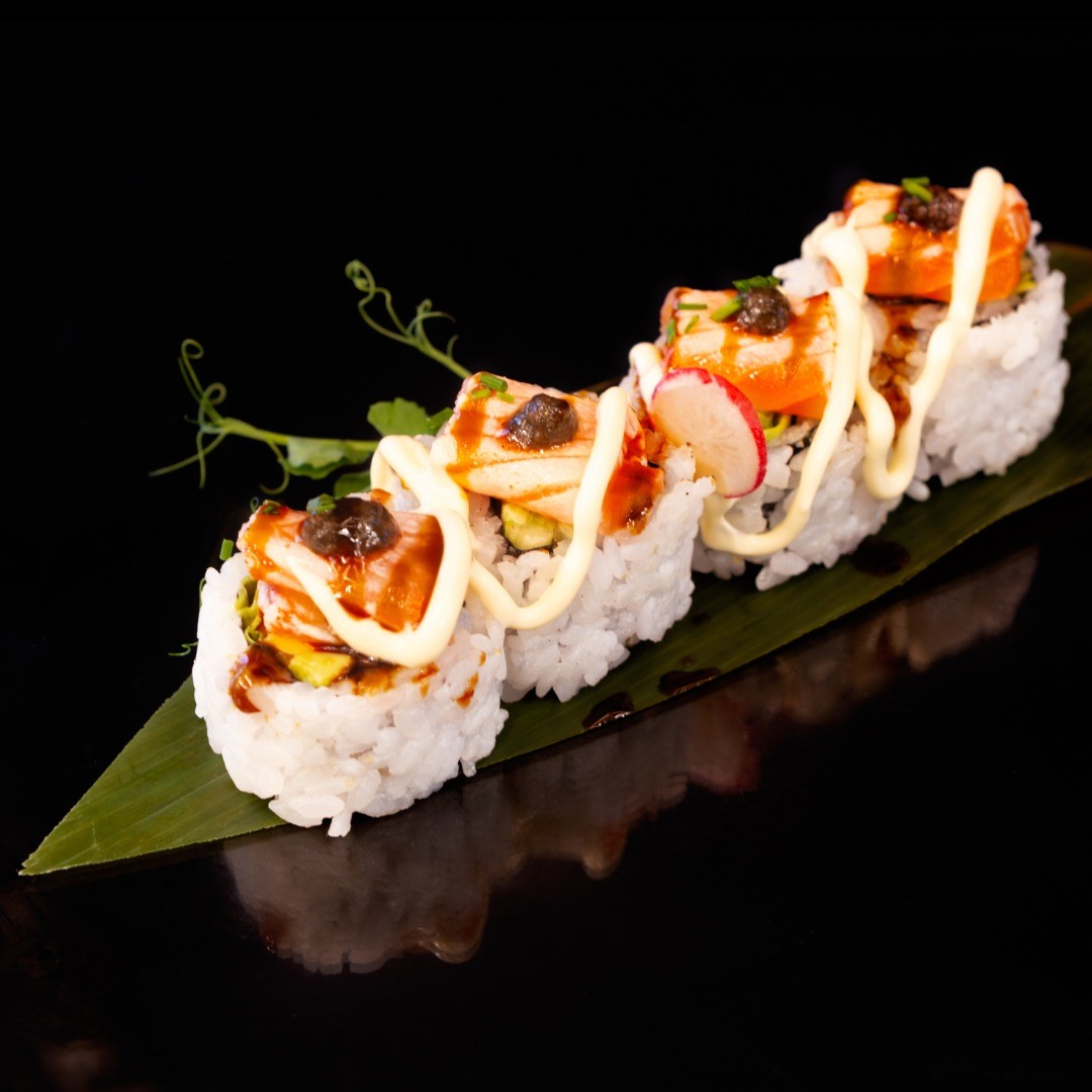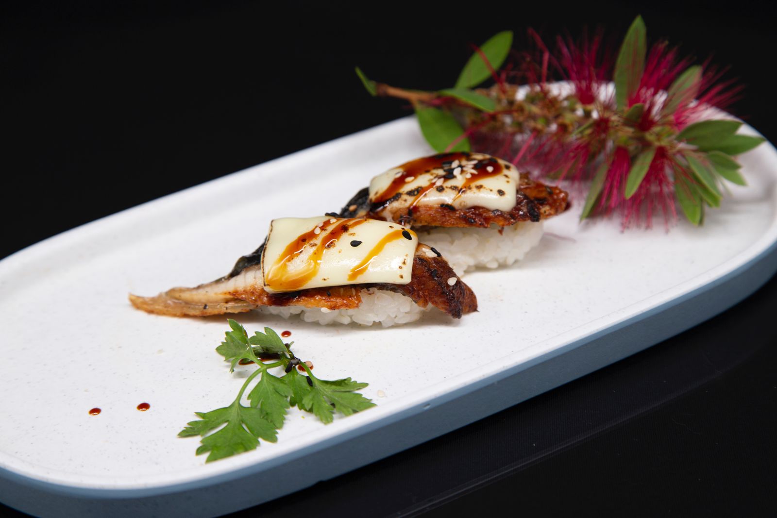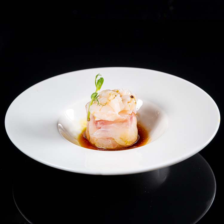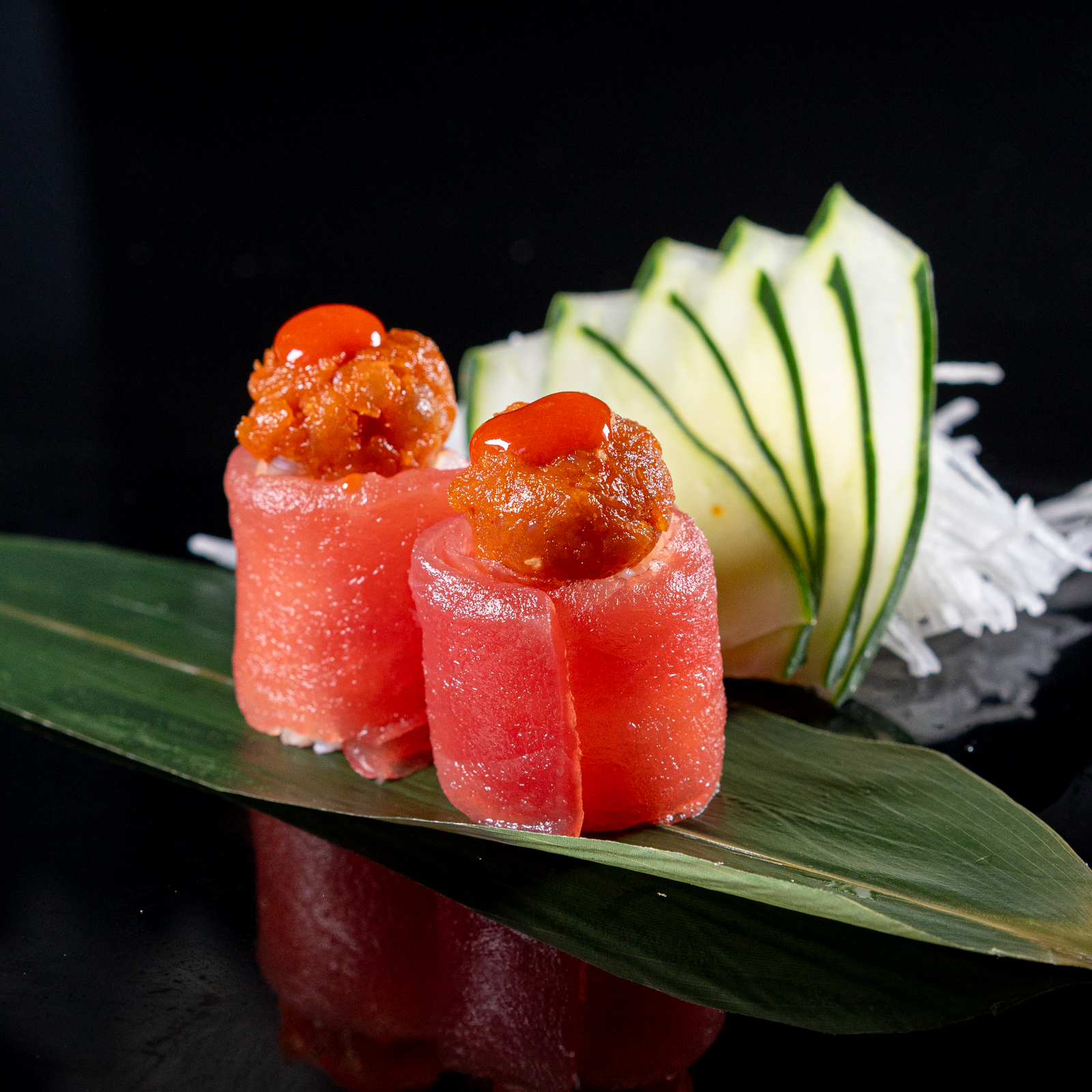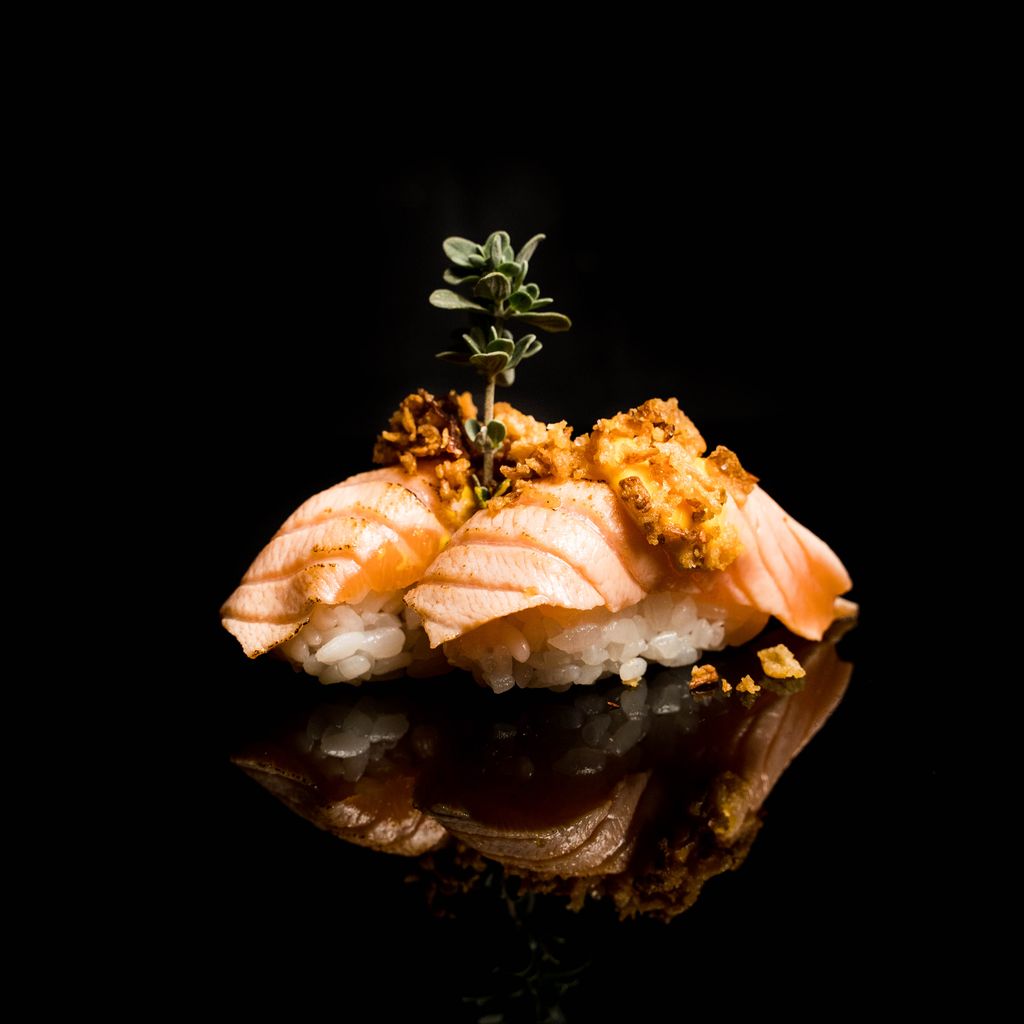 Un connubio di sapori: agrumi del ponzu, la ricchezza del sesamo e la cremosità del goma, con il tocco piccante del wasabi e la dolcezza esotica della frutta della passione.