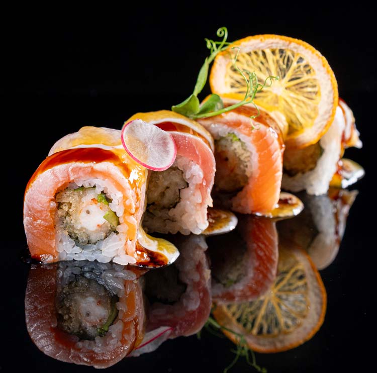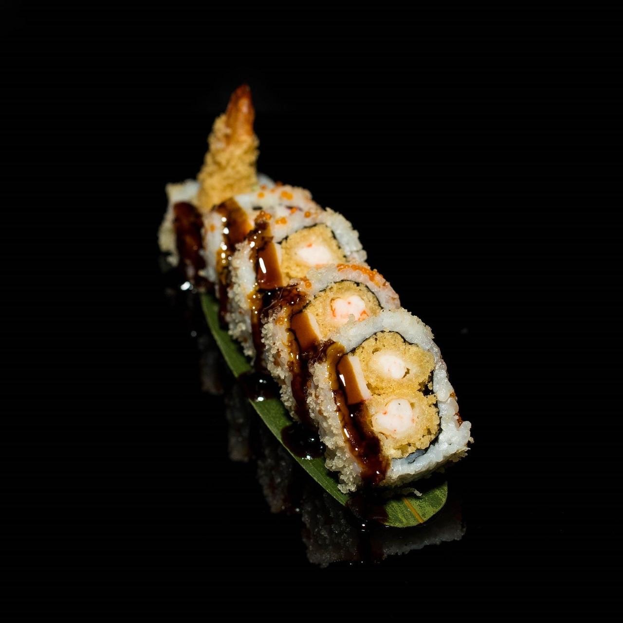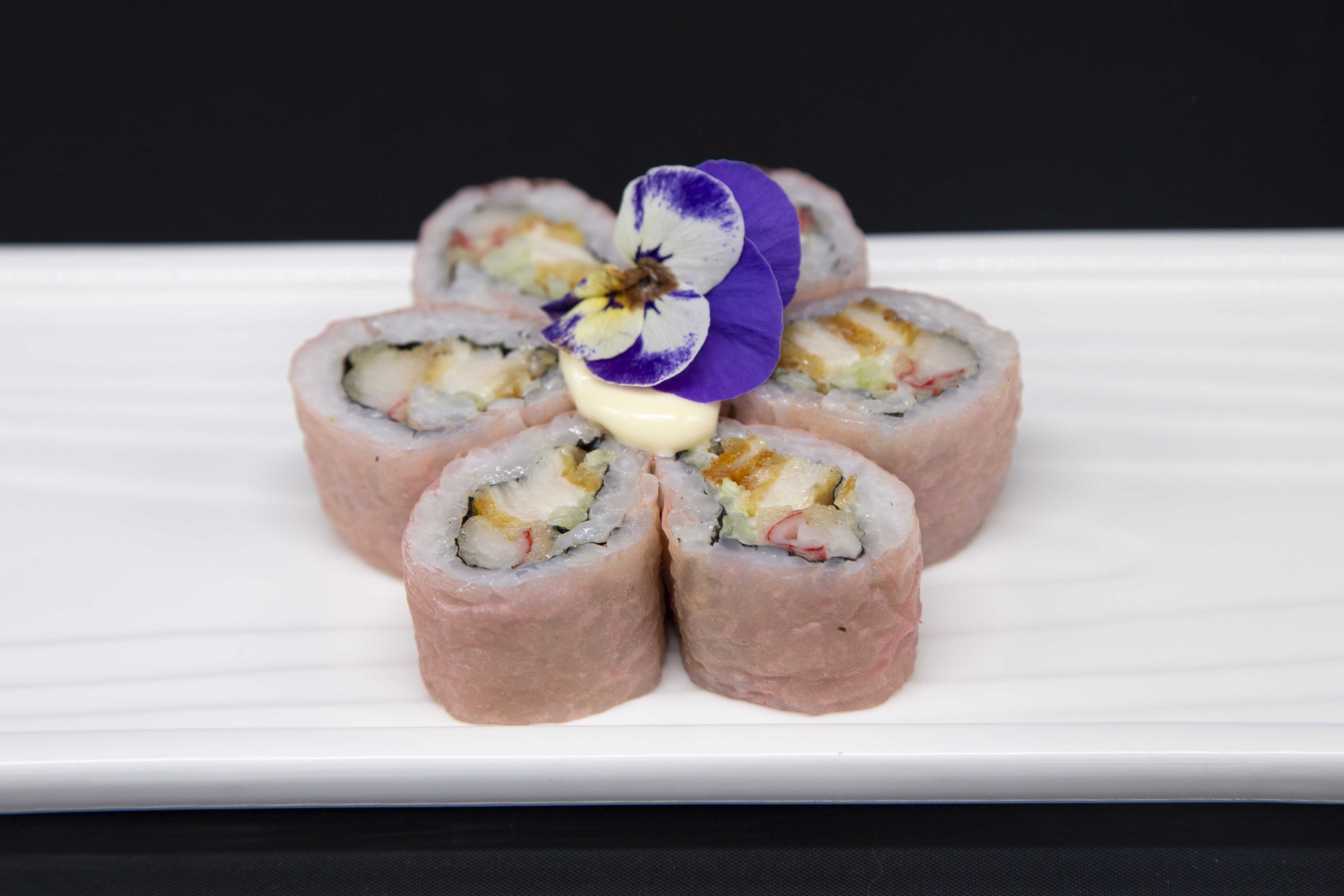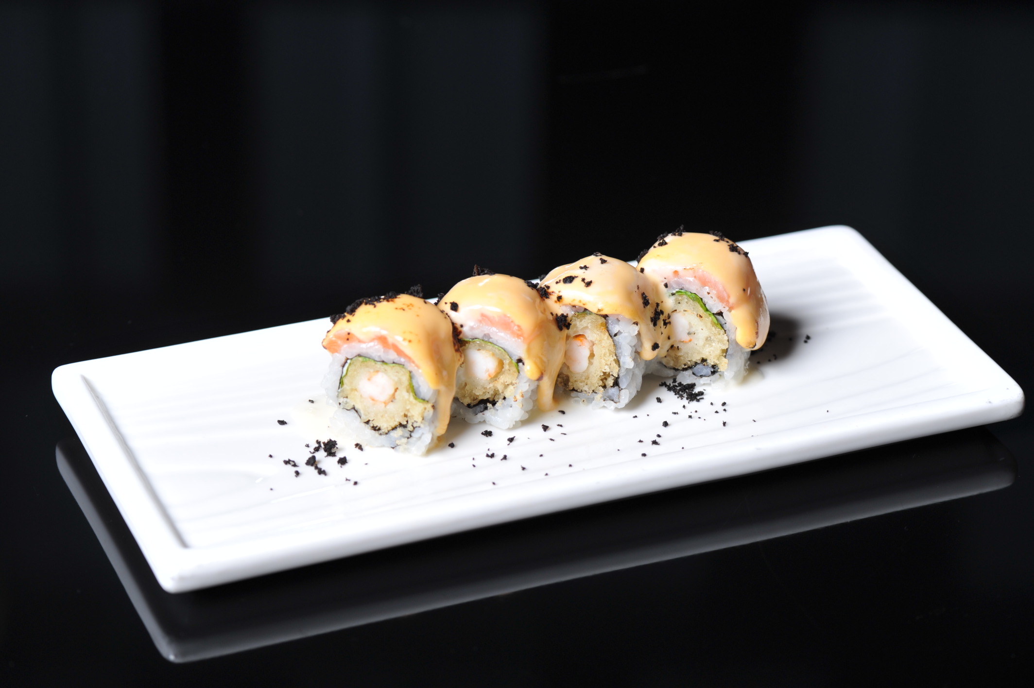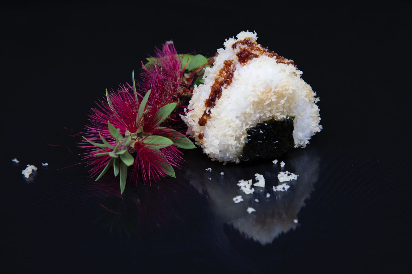 Un connubio di sapori: agrumi del ponzu, la ricchezza del sesamo e la cremosità del goma, con il tocco piccante del wasabi e la dolcezza esotica della frutta della passione.