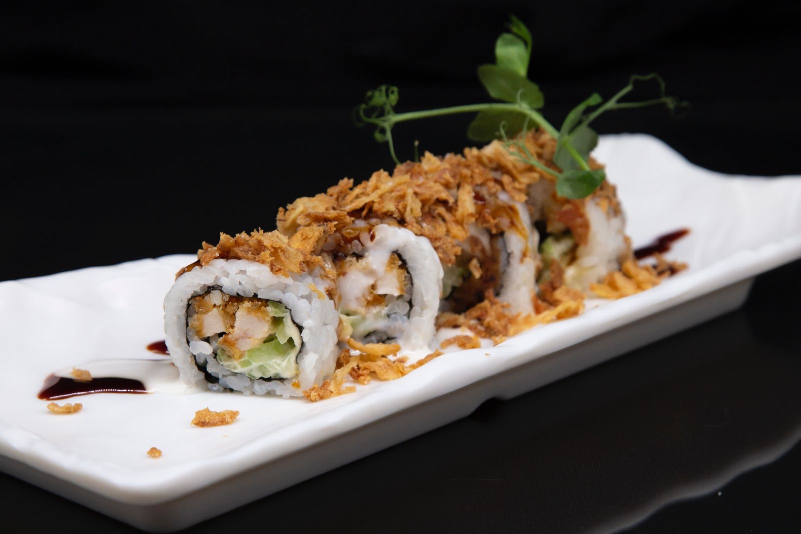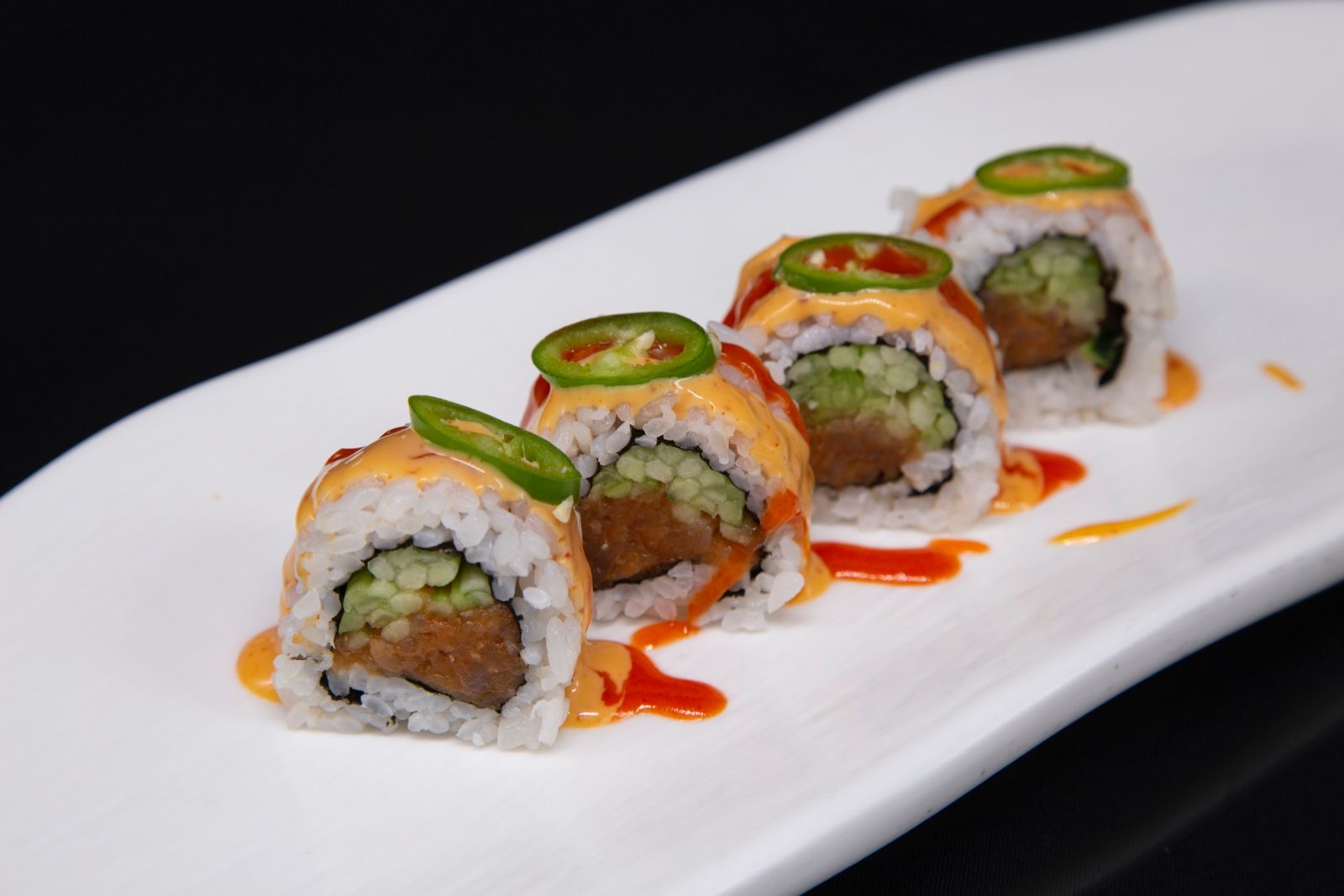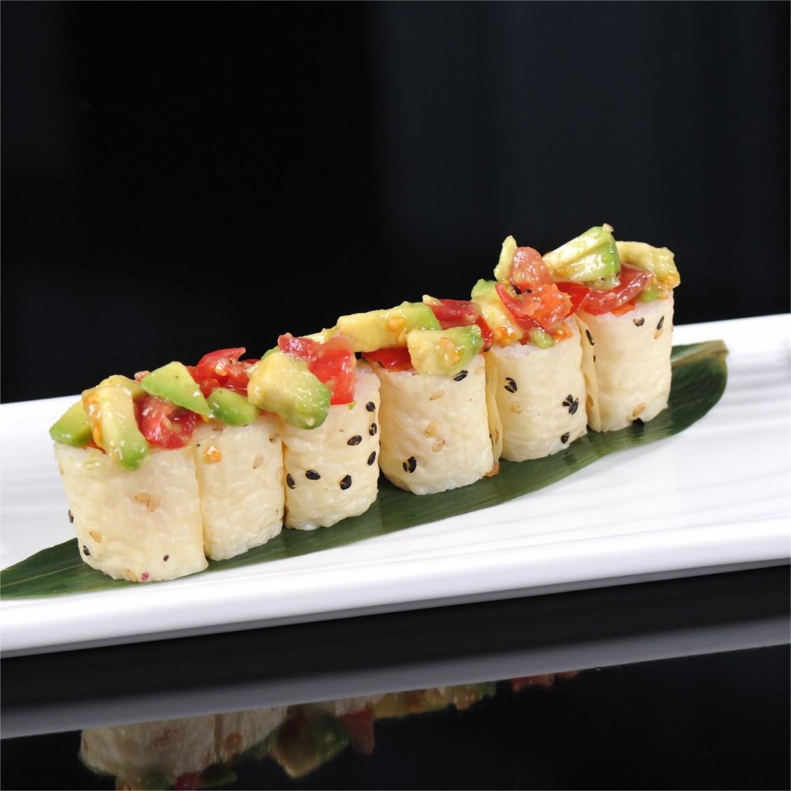 Petto di pollo grigliato, carote, edamame, avocado, mais, cetriolo, salsa cheese su riso da sushi selezionato.