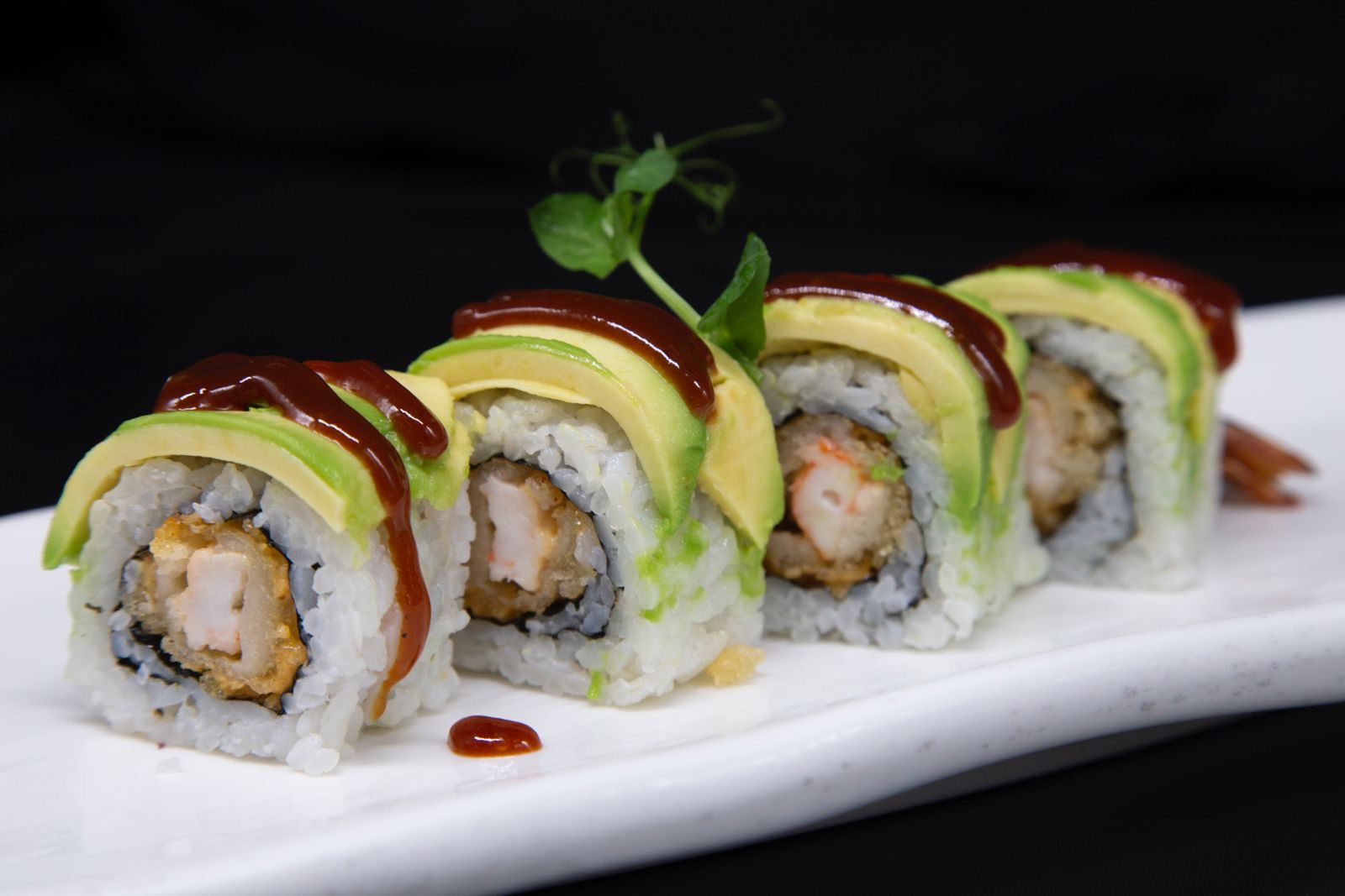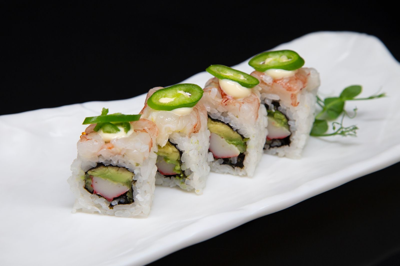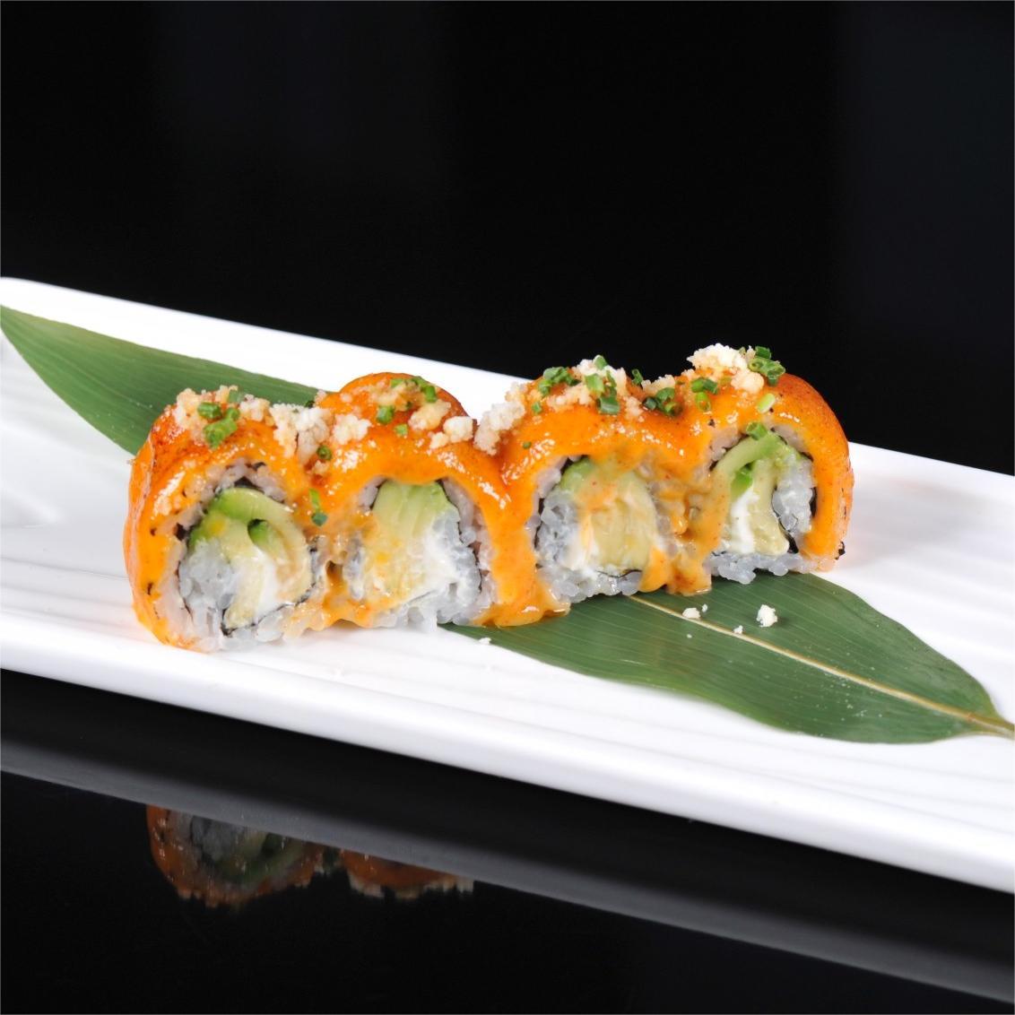 Petto di pollo grigliato, carote, edamame, avocado, mais, cetriolo, salsa cheese su riso da sushi selezionato.
