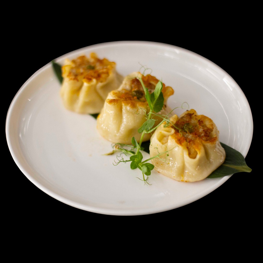 Sfoglia di soia fritta con ripieno di zucca, carote e gamberi