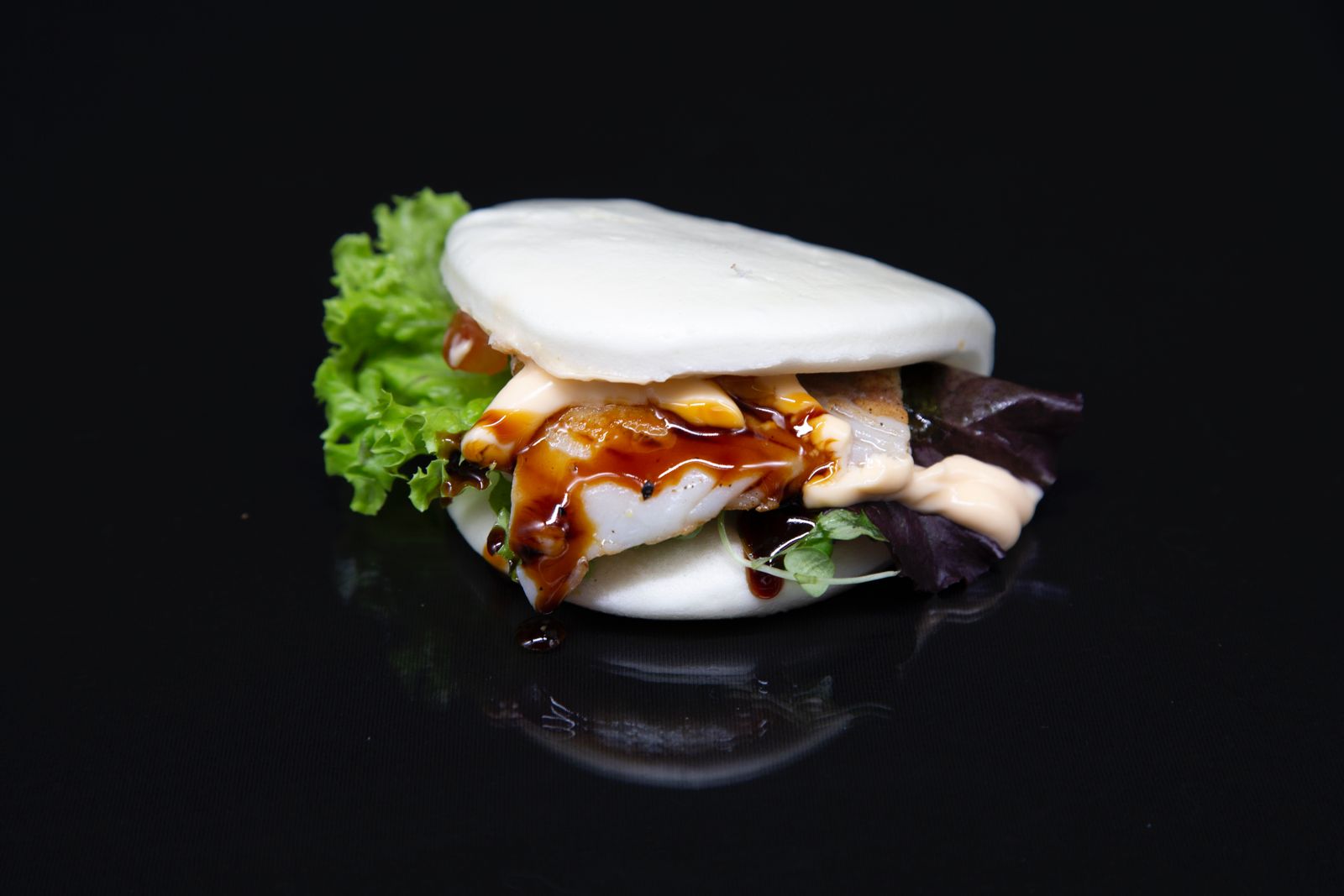 Pane al vapore ripieno di branzino alla piastra, salsa cheese e bbq, teriyaki e insalata