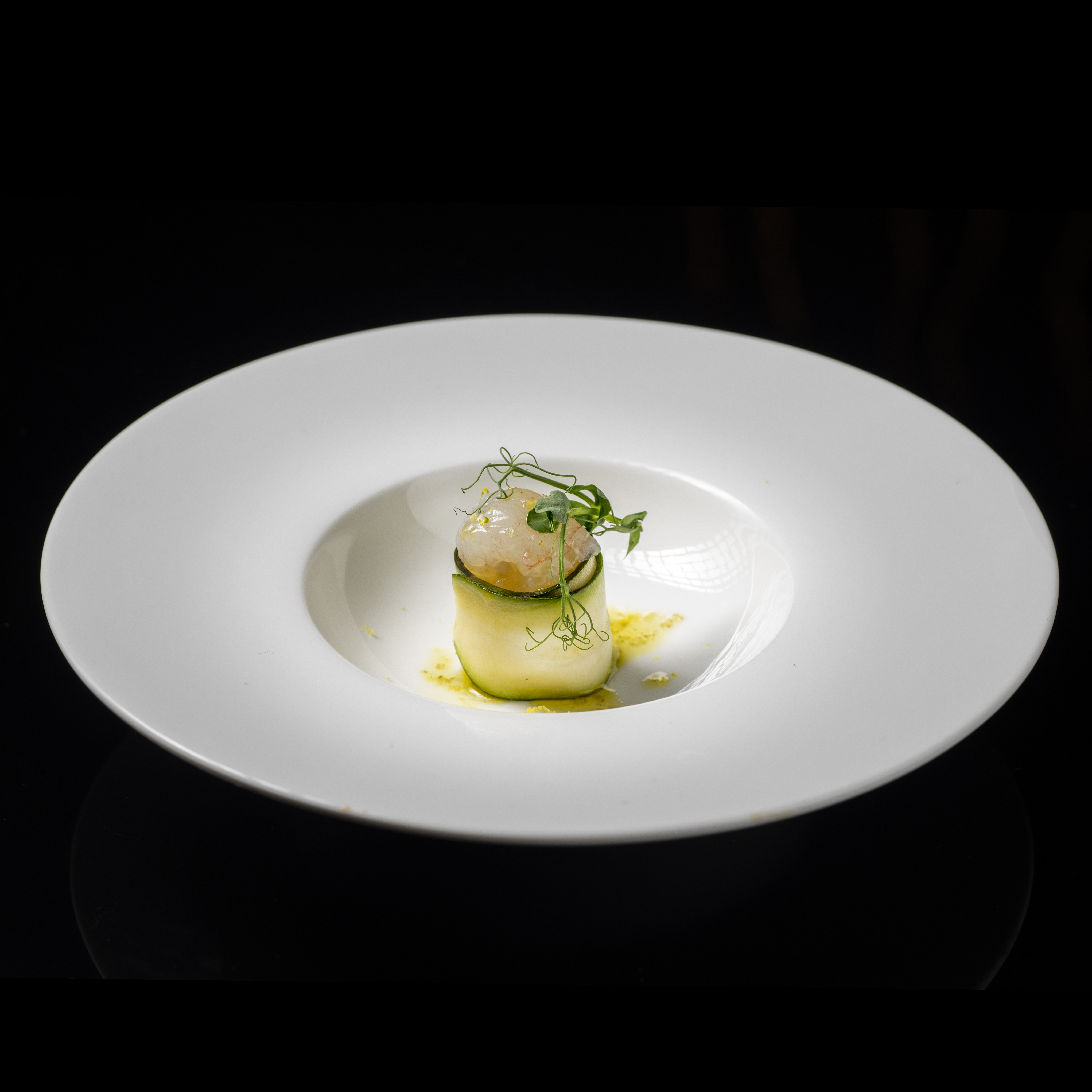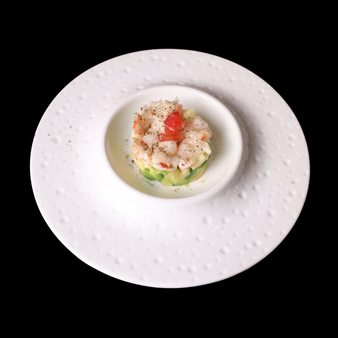 Tartare di gambero marinato, avocado, mango, pomodoro, sale e pepe e olio EVO