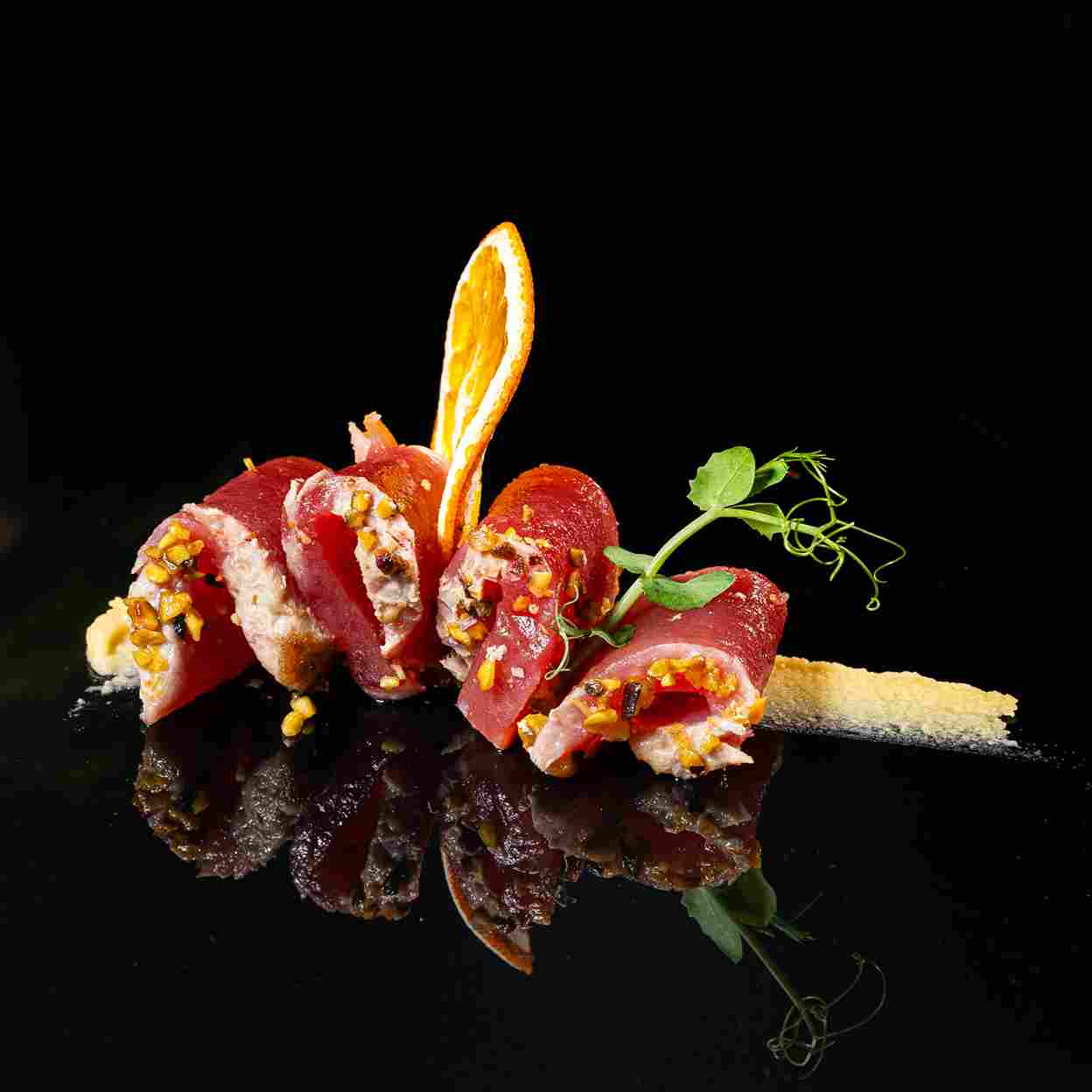 Tonno scottato impreziosito con una croccante crosta di pistacchio tostato, accompagnato con la salsa goma dressing e tonno piccante del wasabi