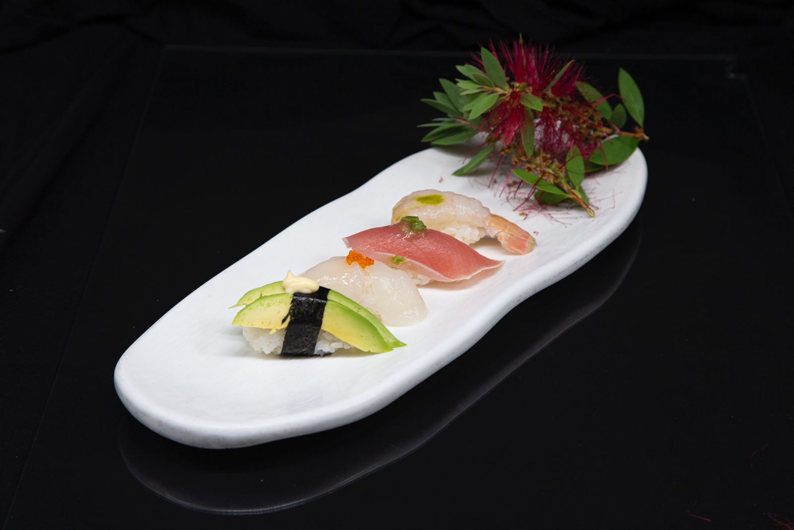 3 sashimi di salmone, 3 sashimi di tonno, 3 sashimi di branzino, 1 gambero rosso di Mazara, crema di burrata, estratto di basilico all'oriente