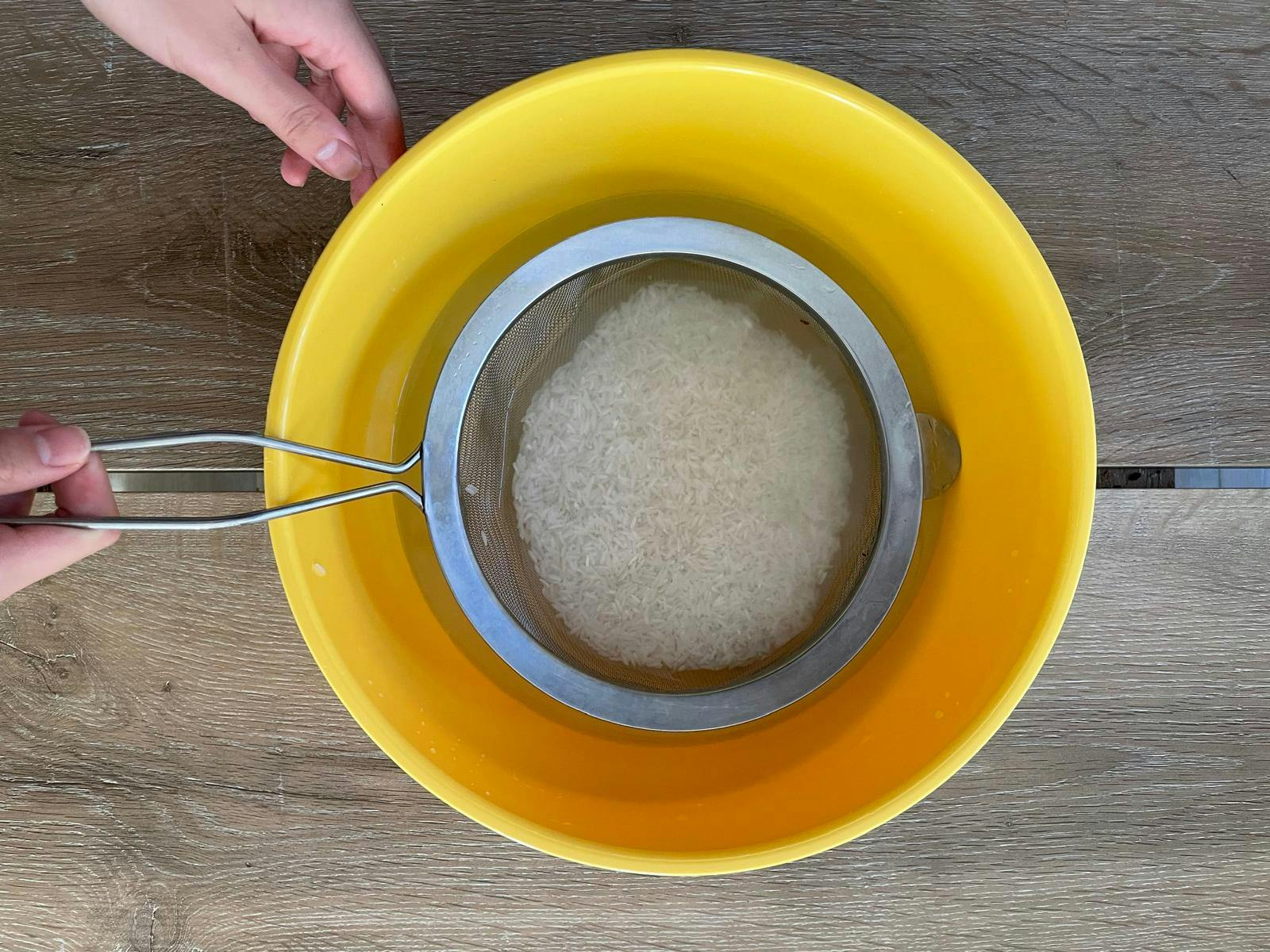 Lavare 100 g di riso sotto acqua corrente fino a quando l'acqua diventa limpida.