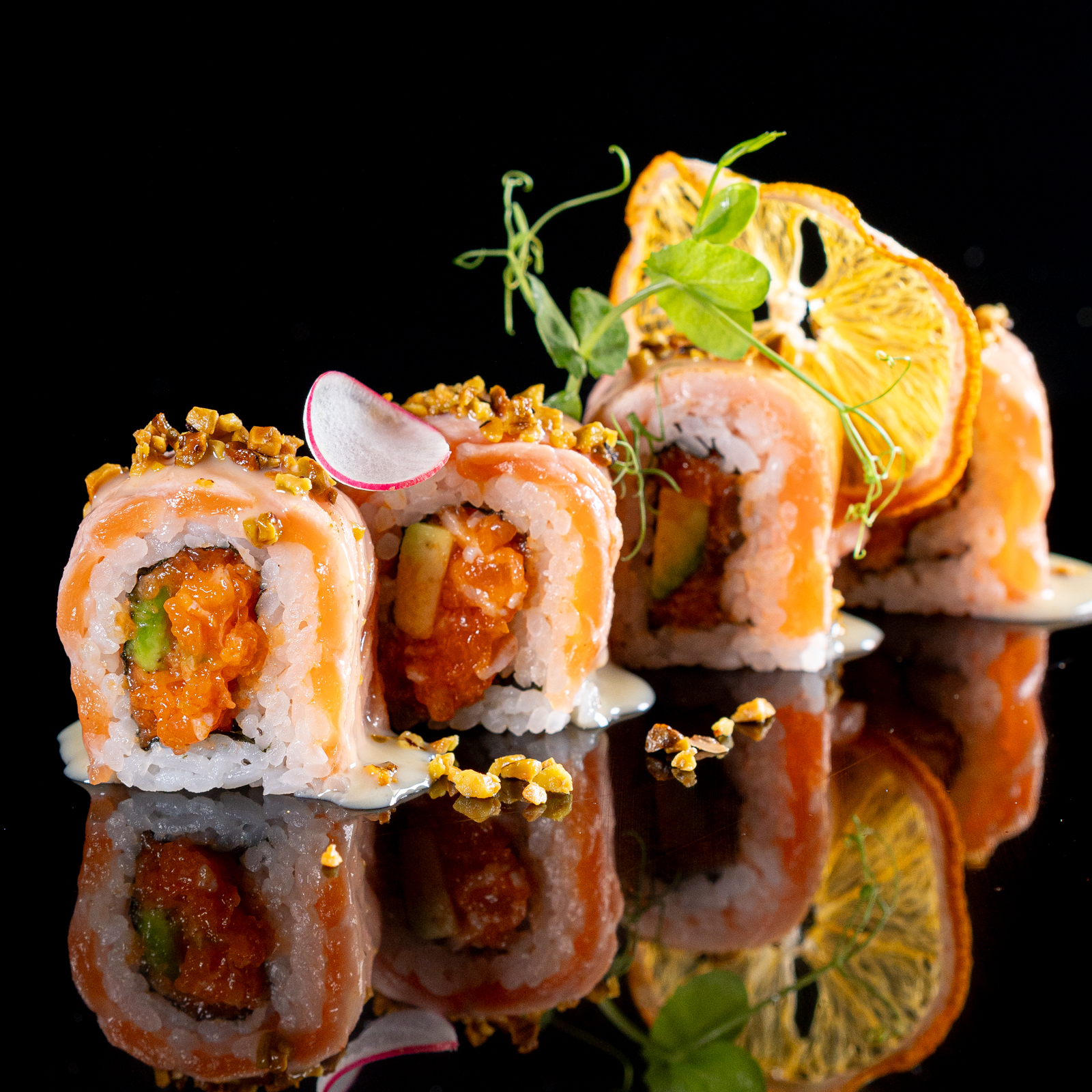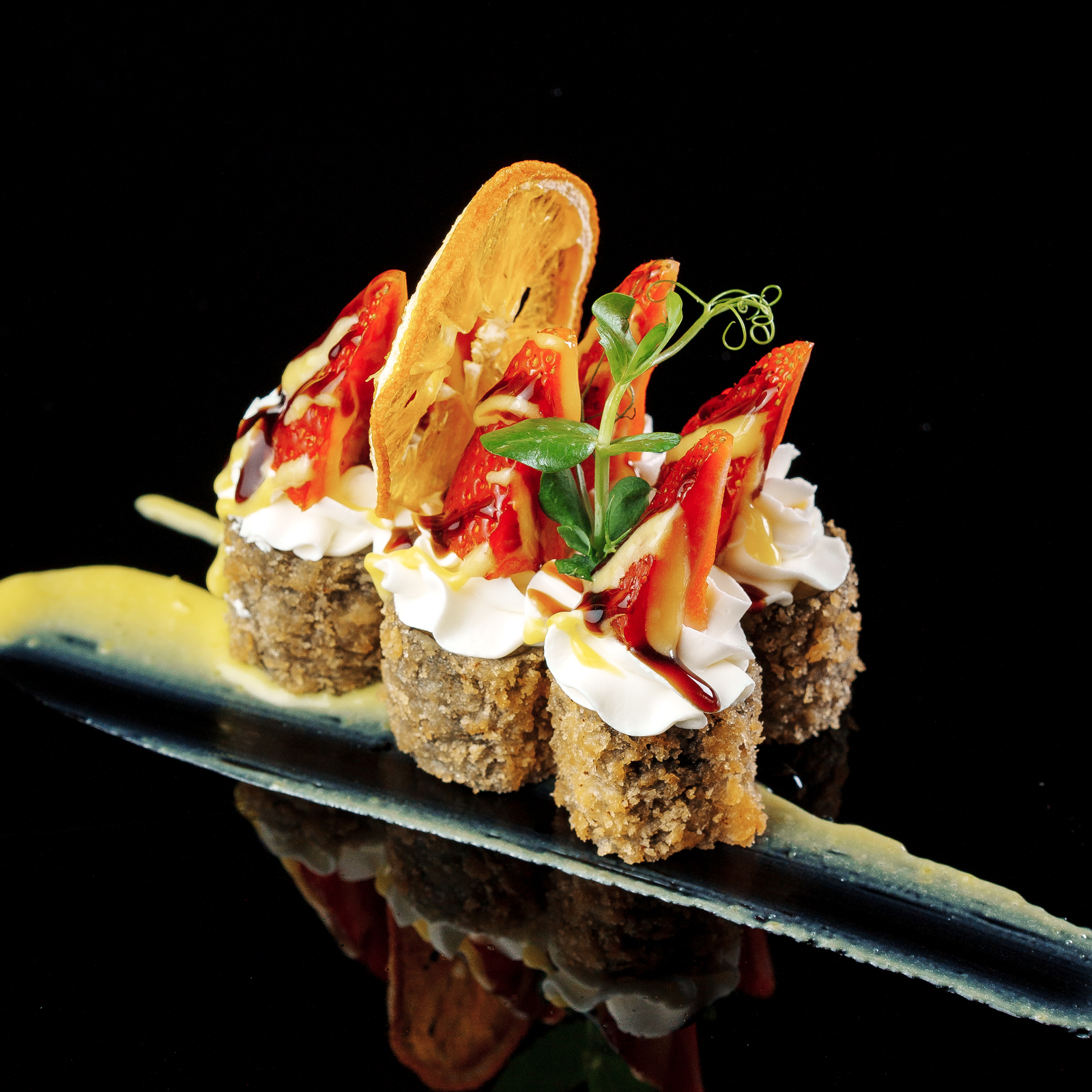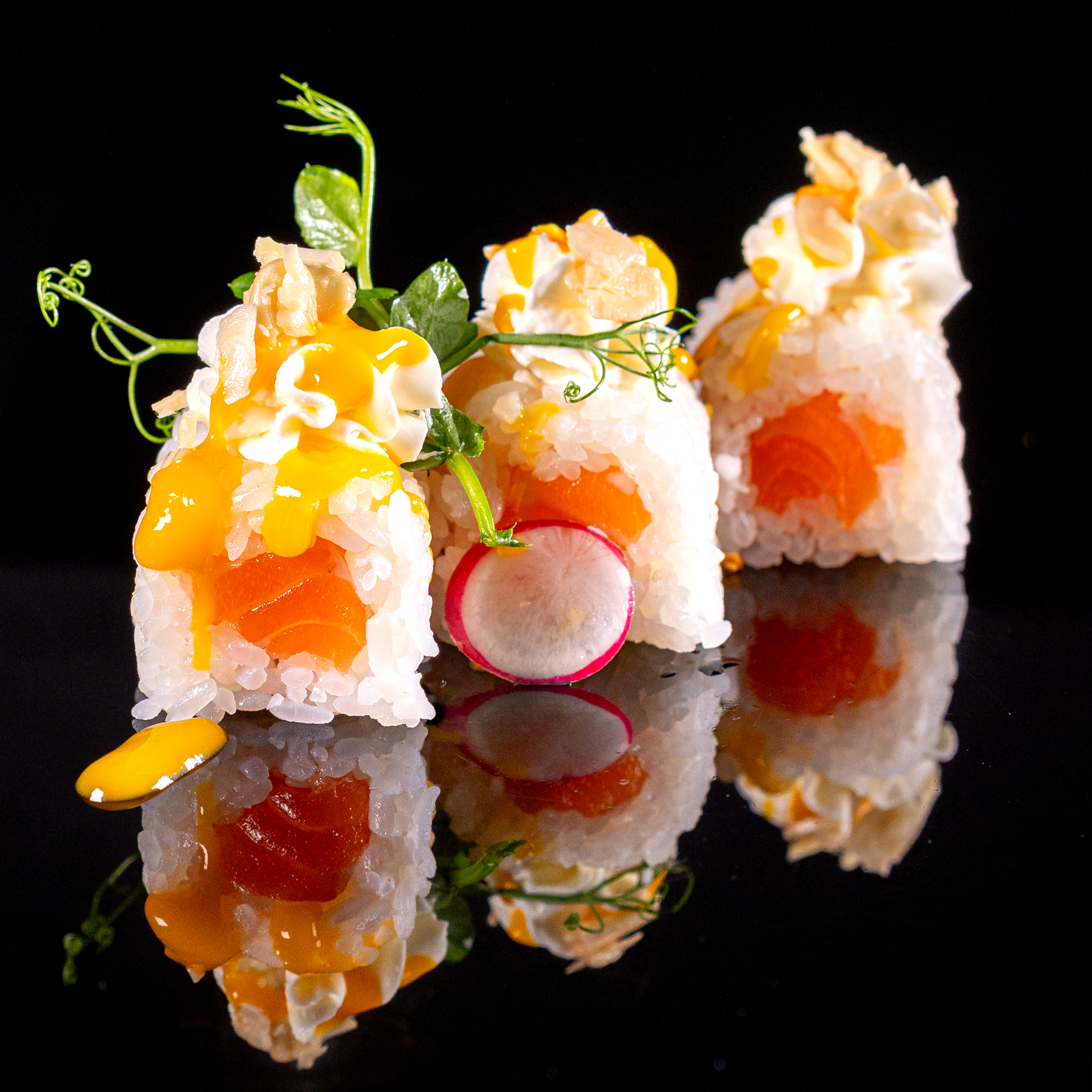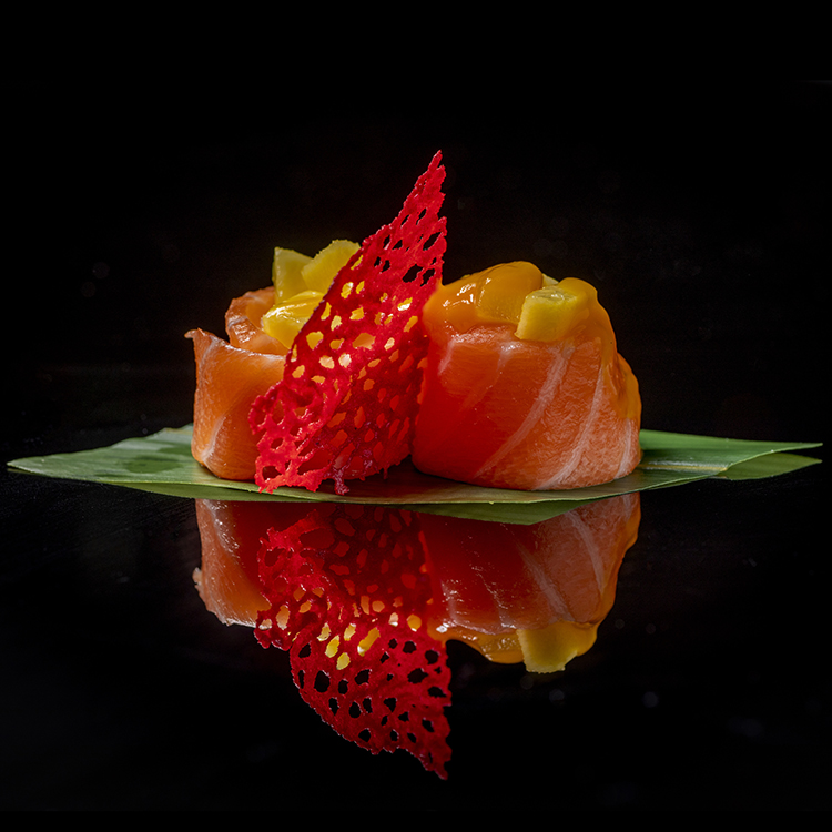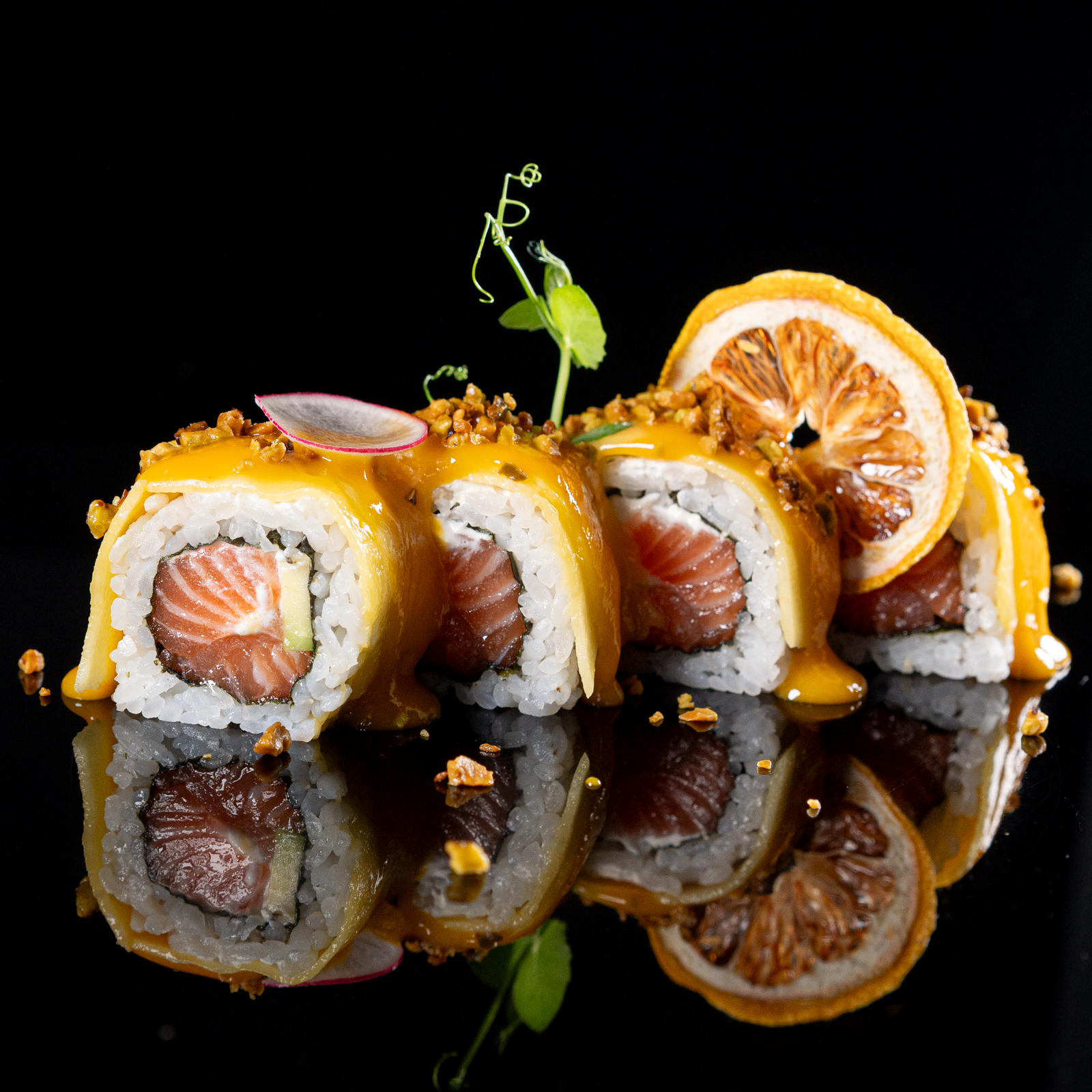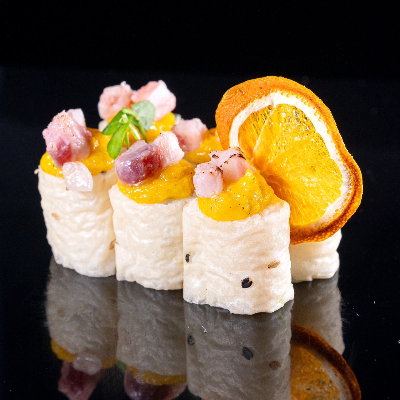 Un connubio di sapori: agrumi del ponzu, la ricchezza del sesamo e la cremosità del goma, con il tocco piccante del wasabi e la dolcezza esotica della frutta della passione.