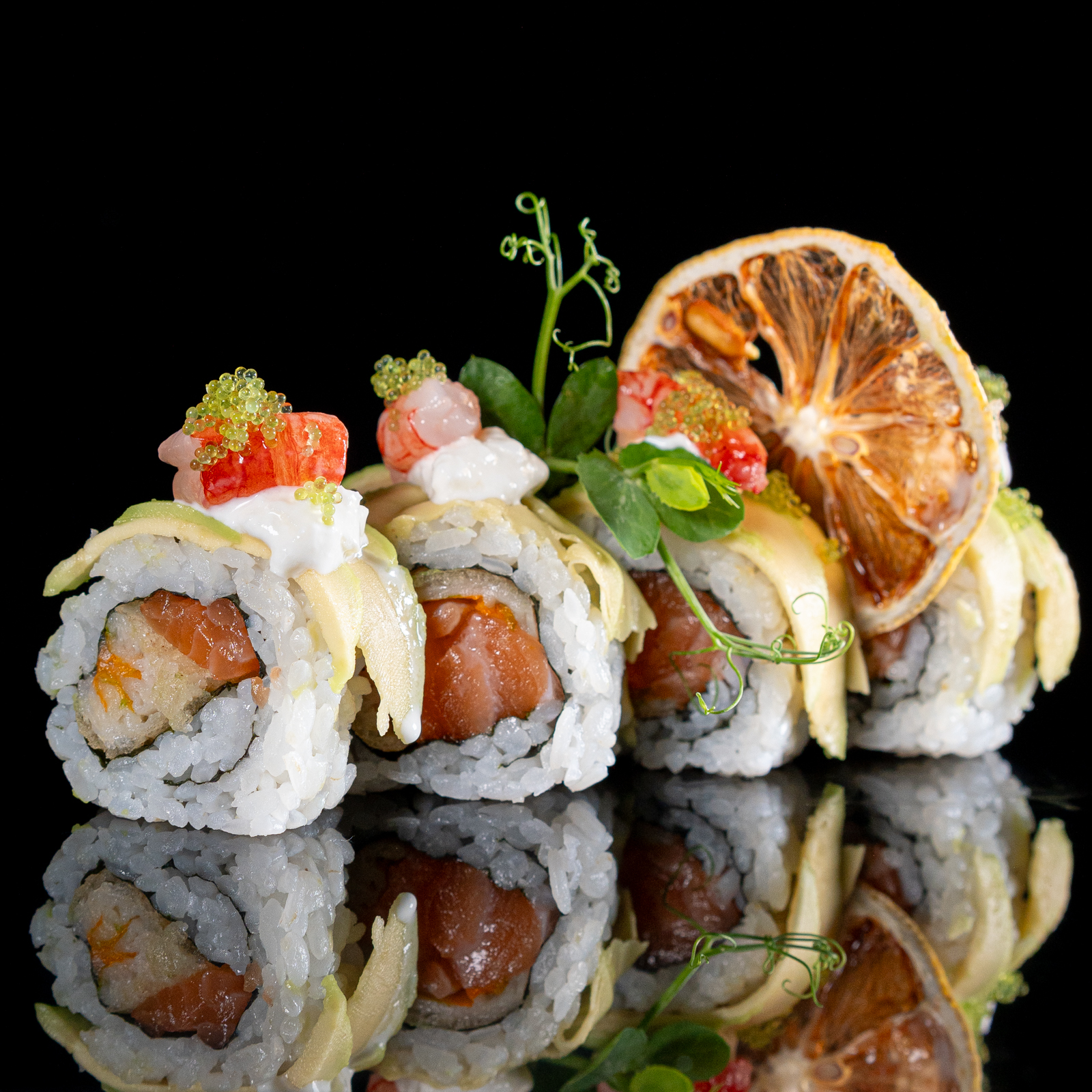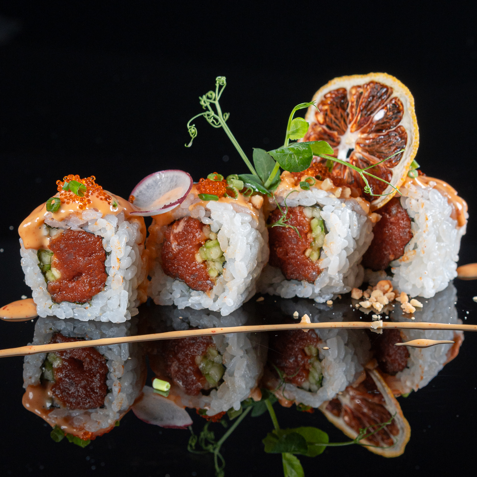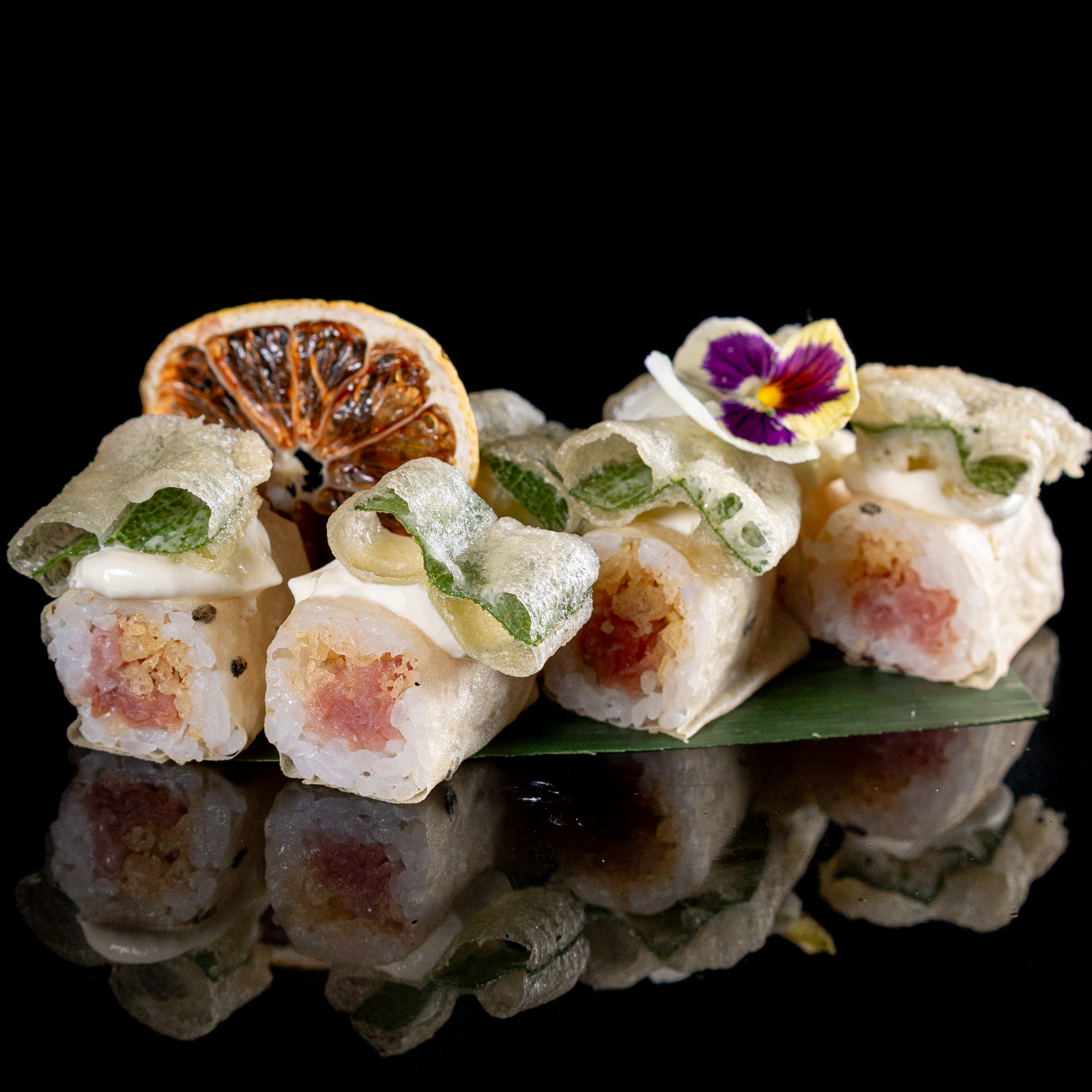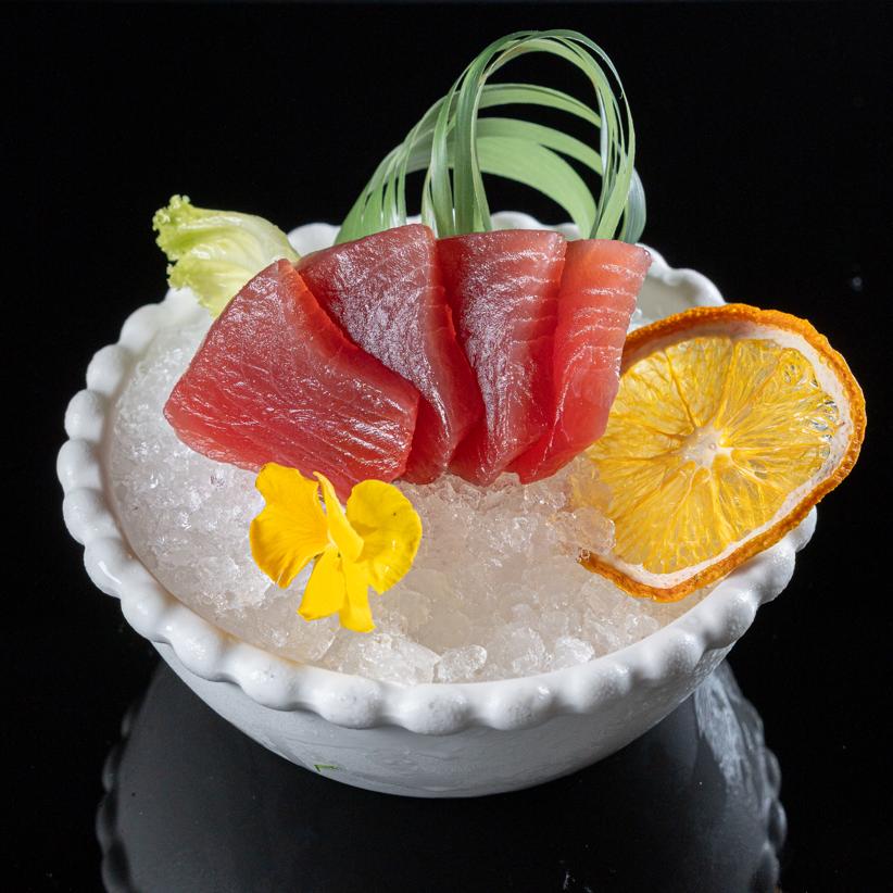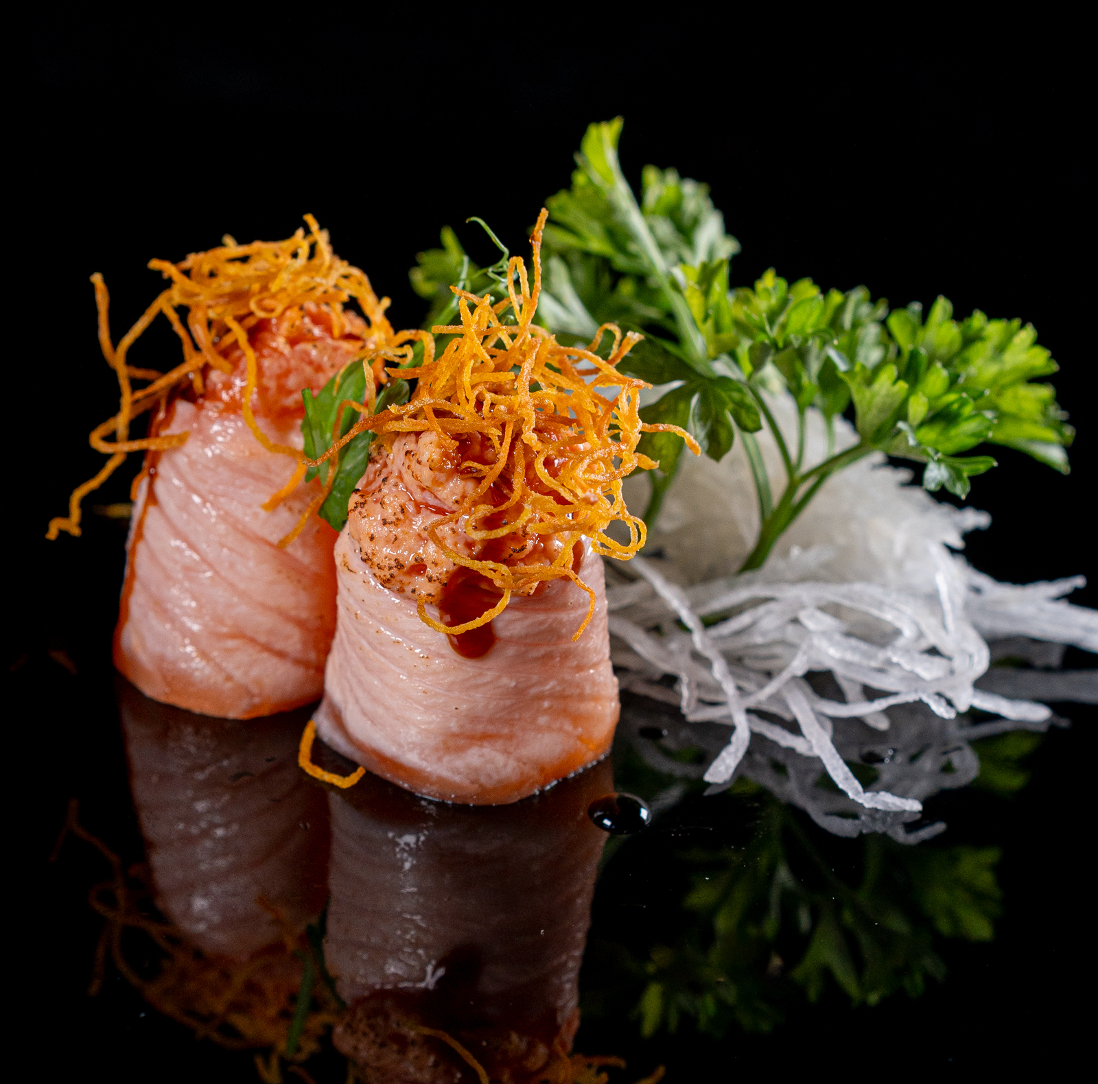Un connubio di sapori: agrumi del ponzu, la ricchezza del sesamo e la cremosità del goma, con il tocco piccante del wasabi e la dolcezza esotica della frutta della passione.