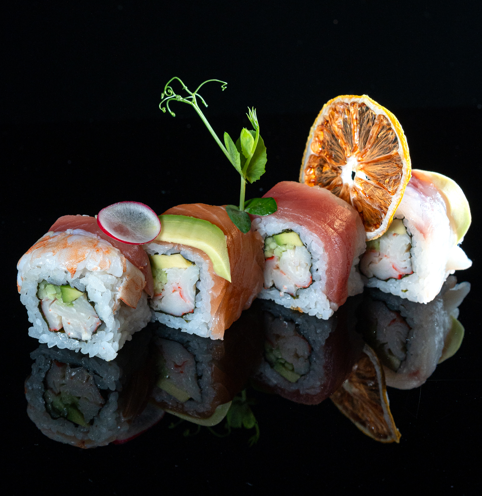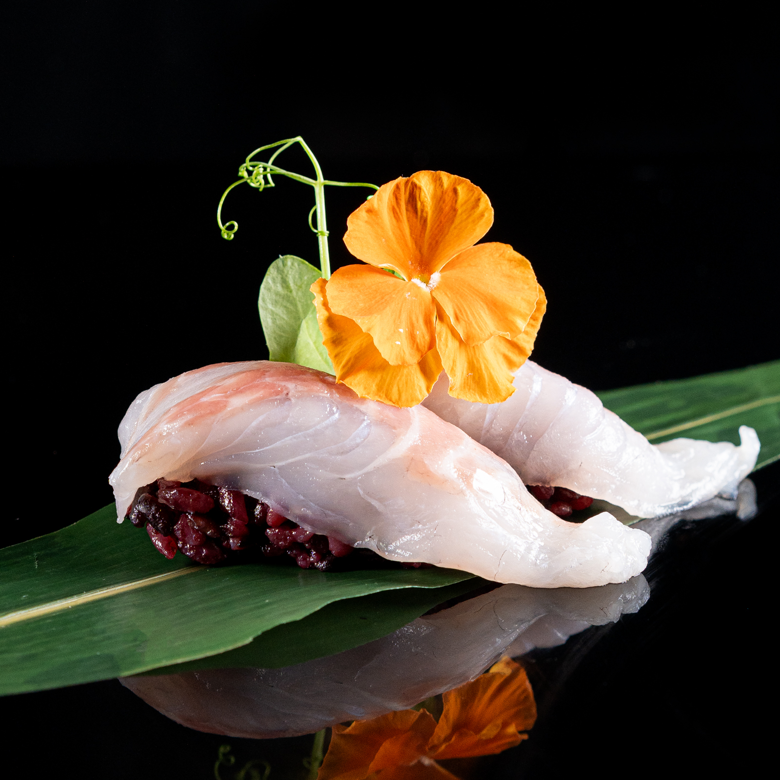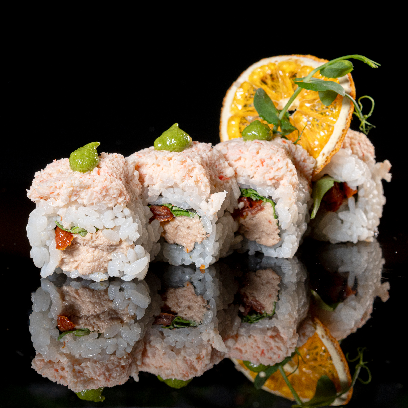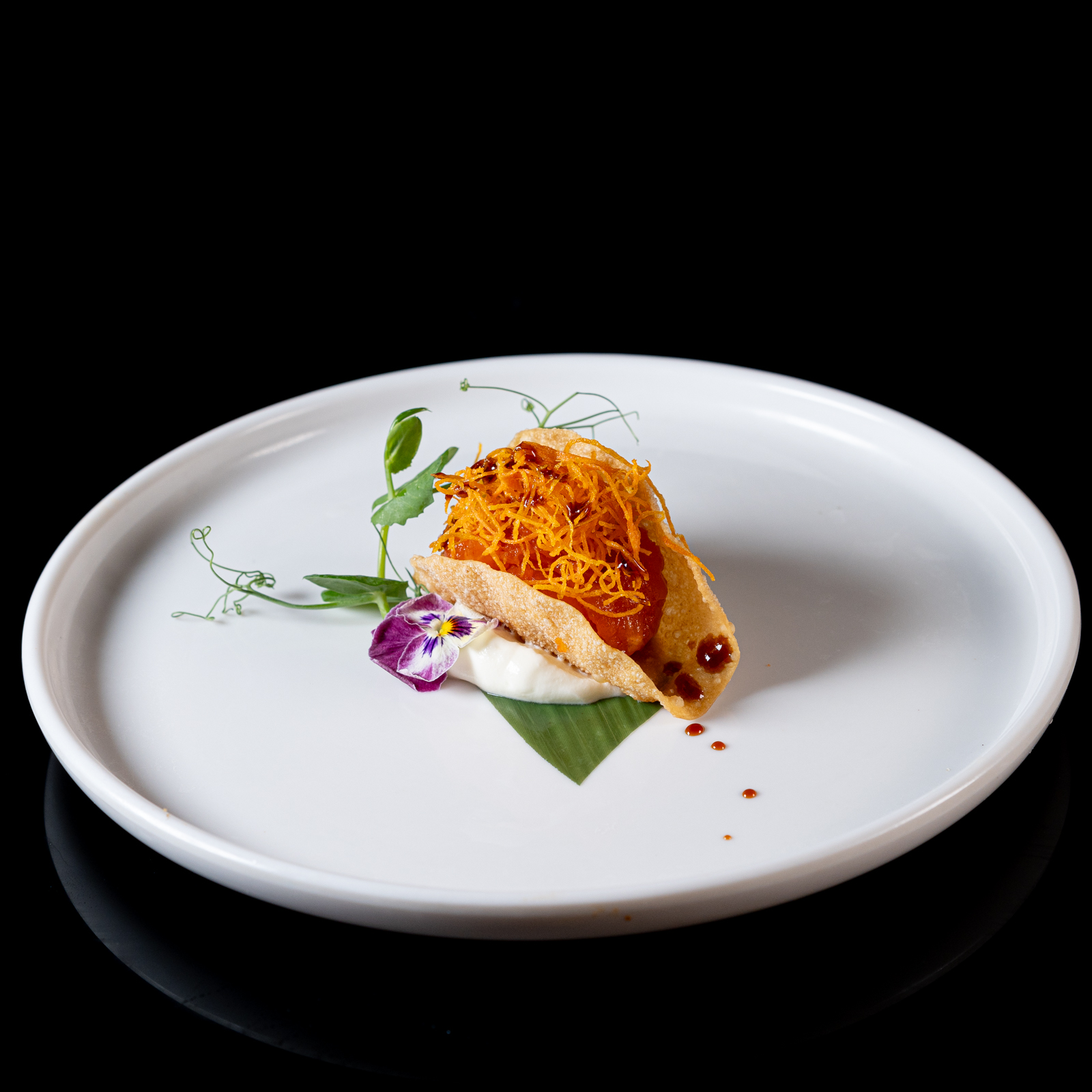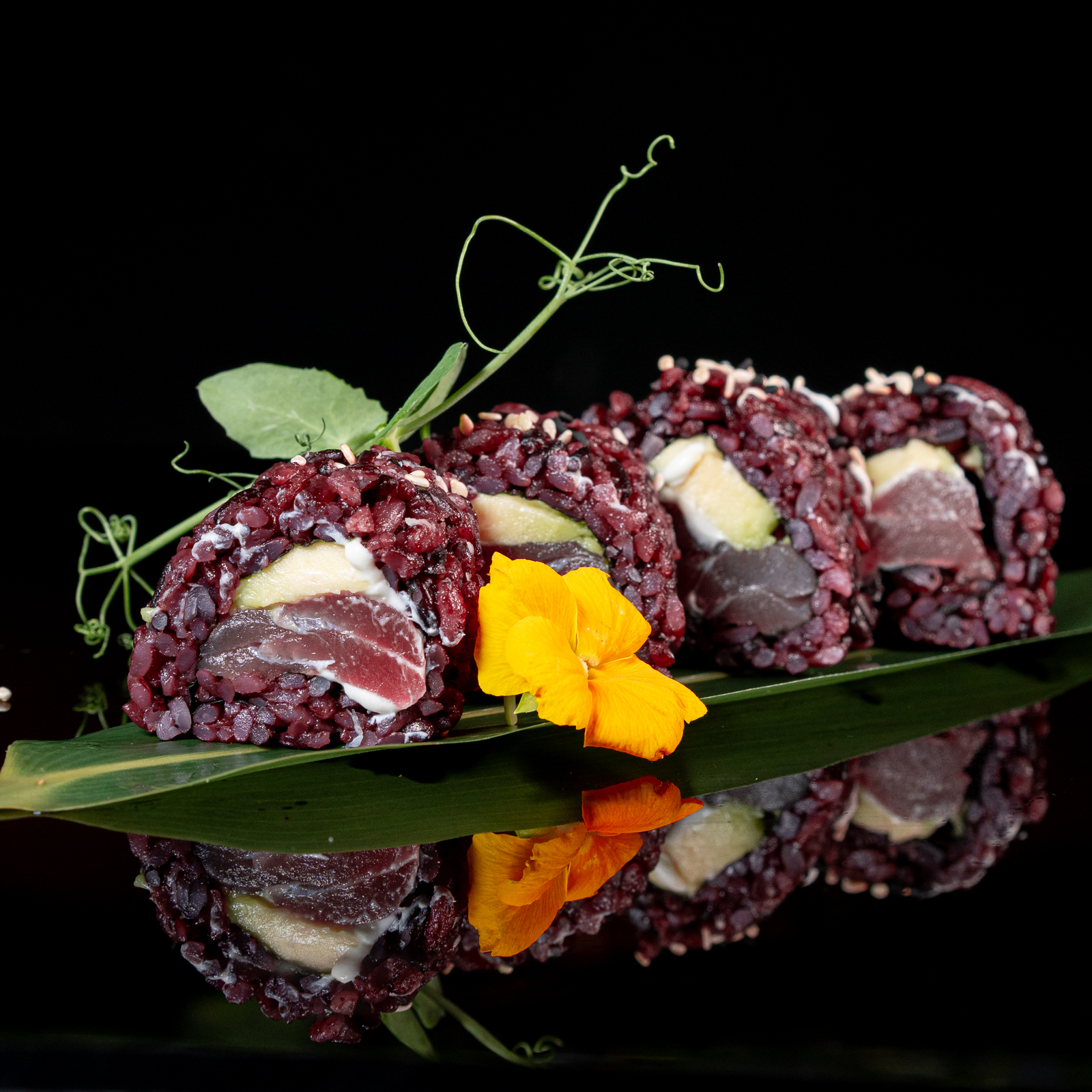 Un connubio di sapori: agrumi del ponzu, la ricchezza del sesamo e la cremosità del goma, con il tocco piccante del wasabi e la dolcezza esotica della frutta della passione.