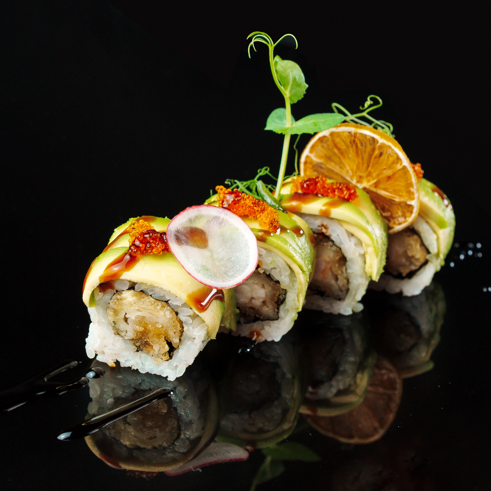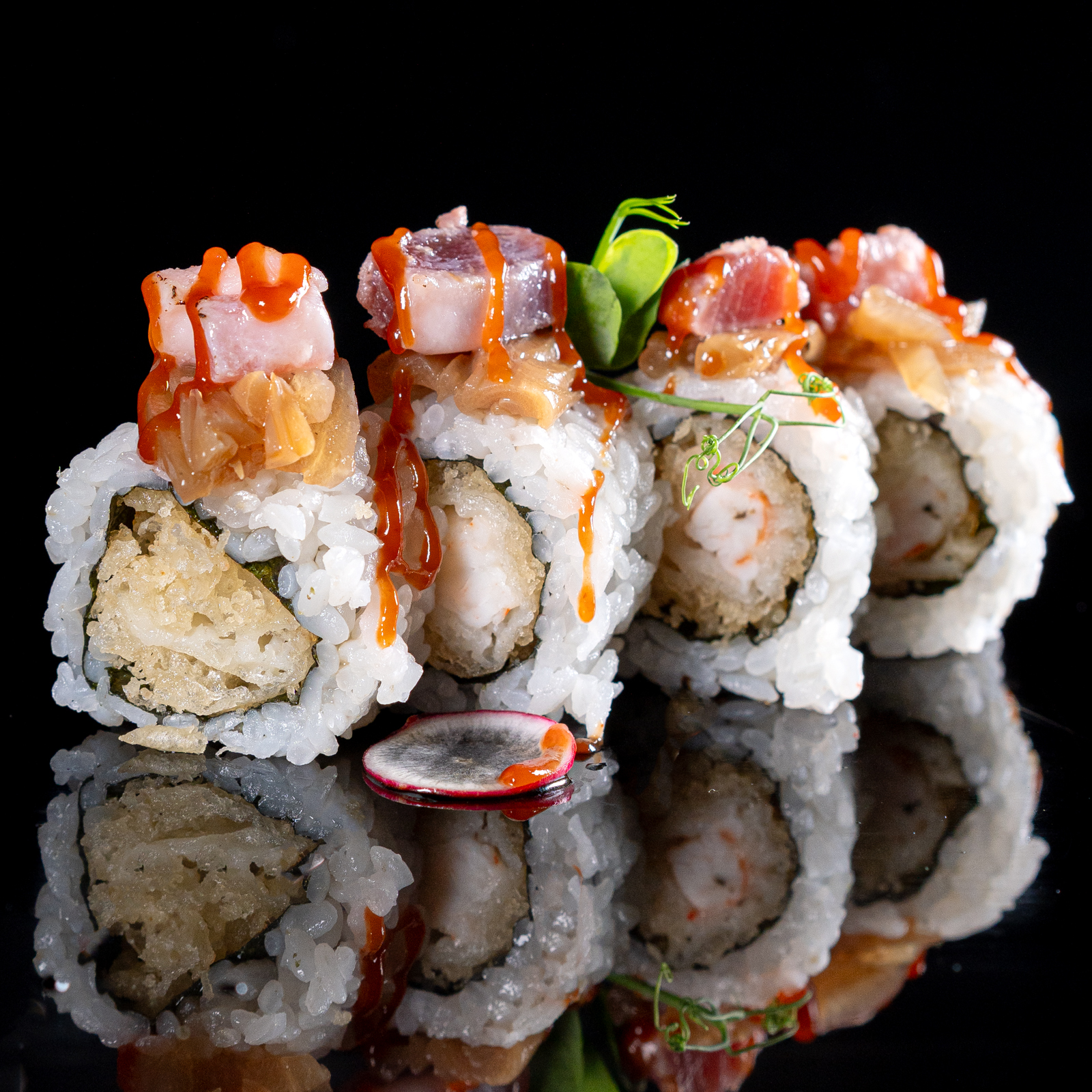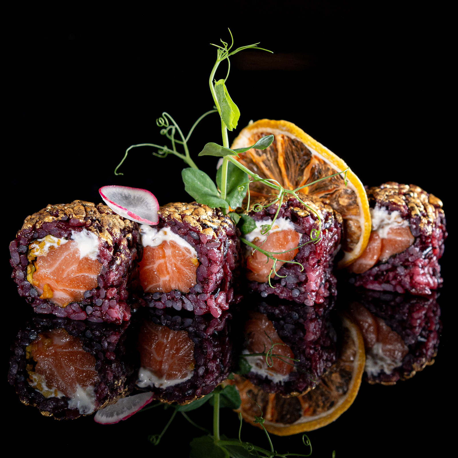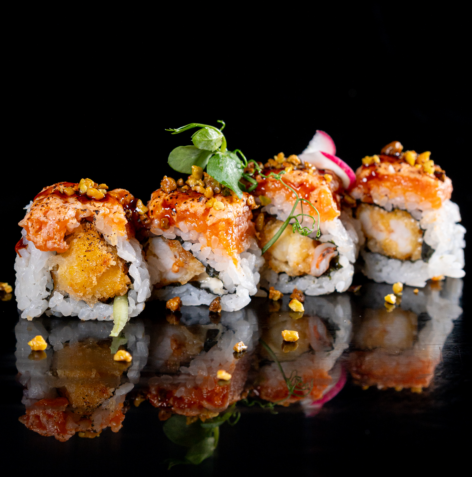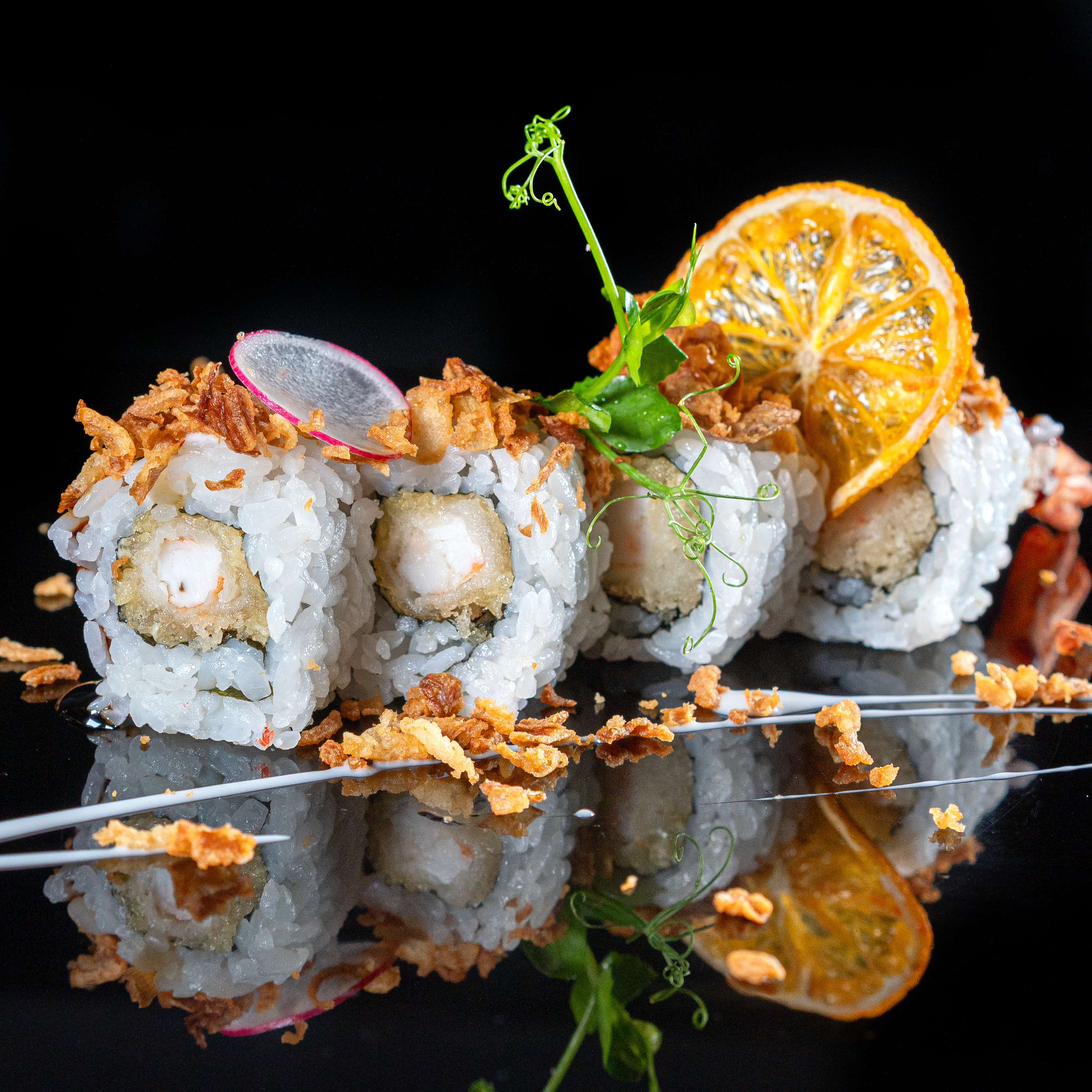 Un connubio di sapori: agrumi del ponzu, la ricchezza del sesamo e la cremosità del goma, con il tocco piccante del wasabi e la dolcezza esotica della frutta della passione.