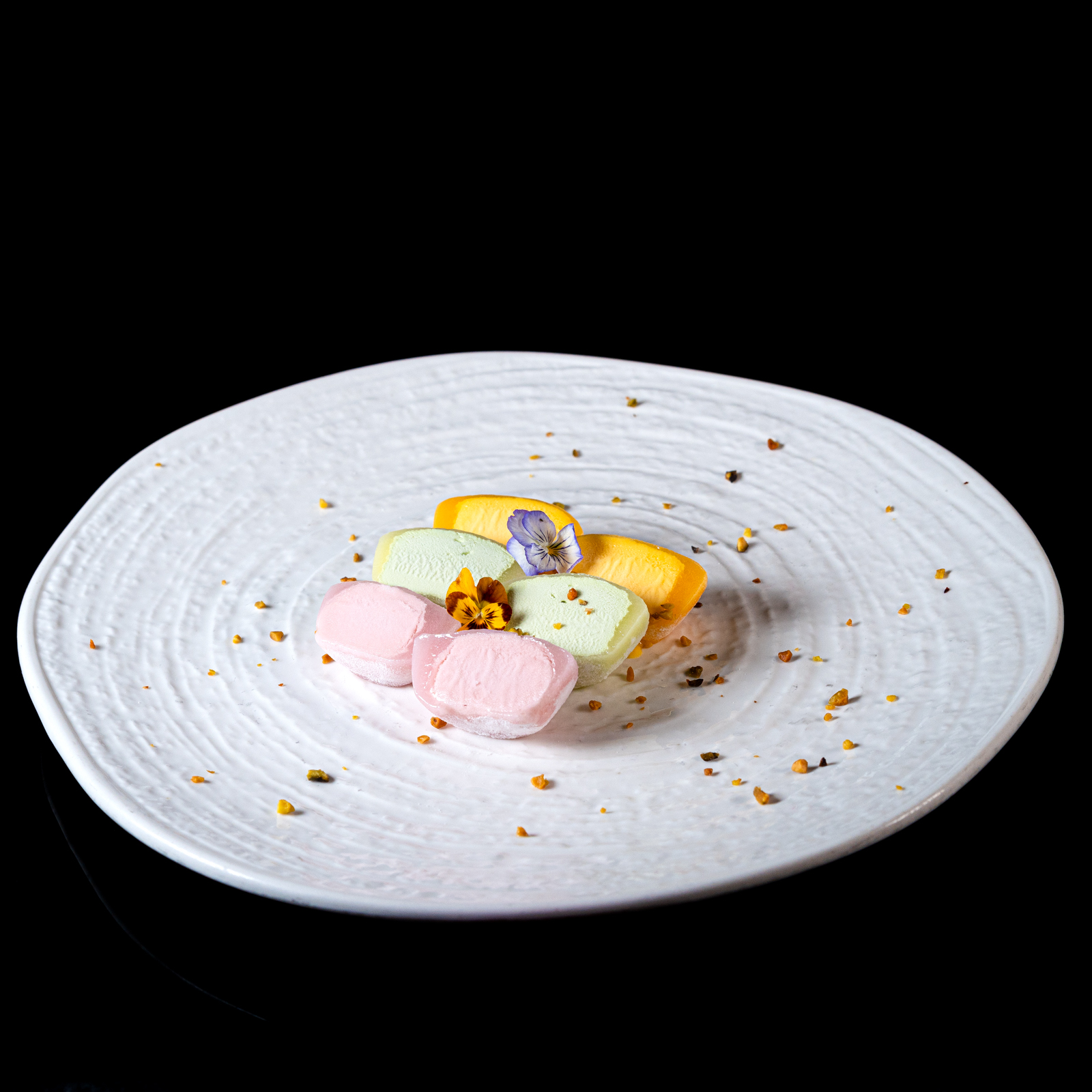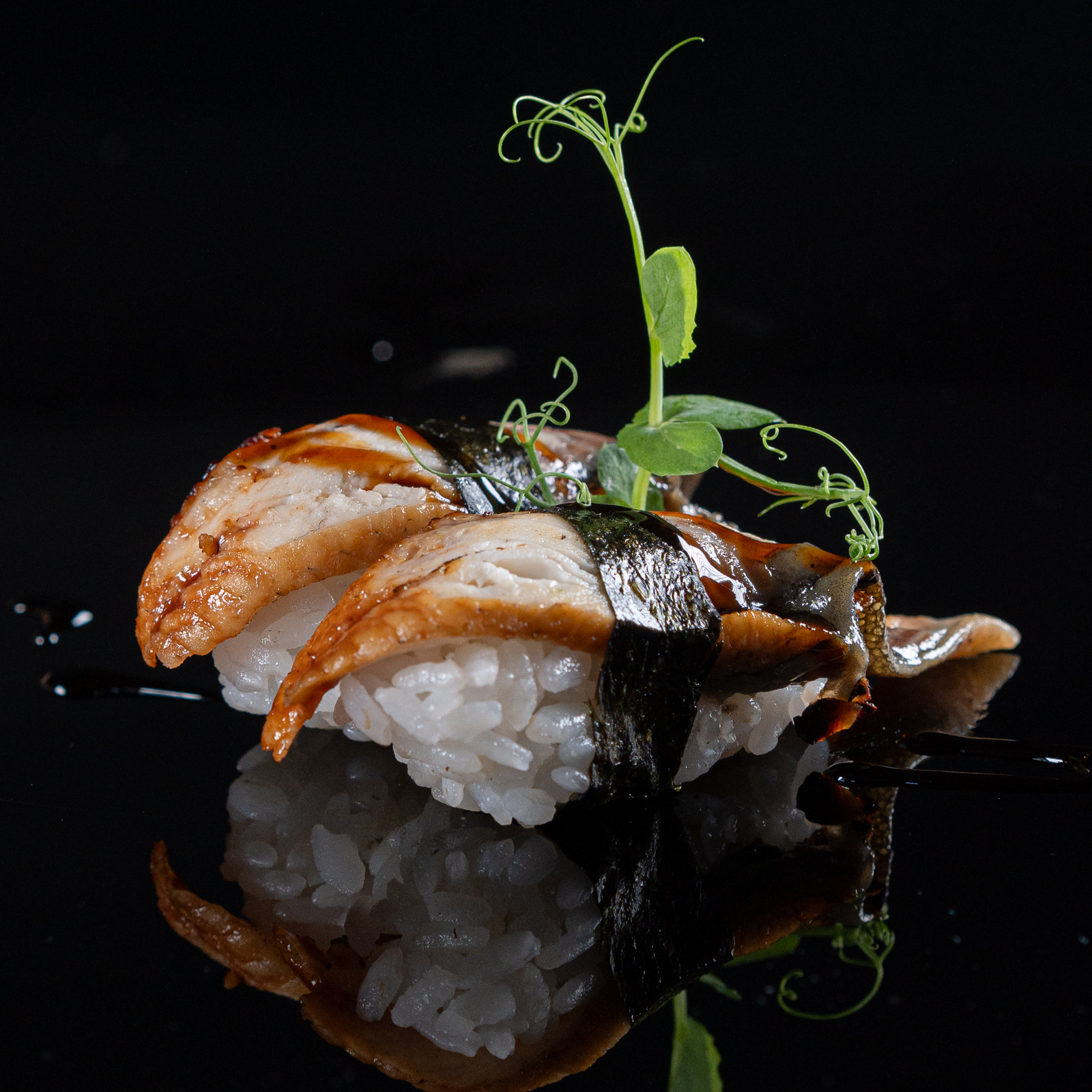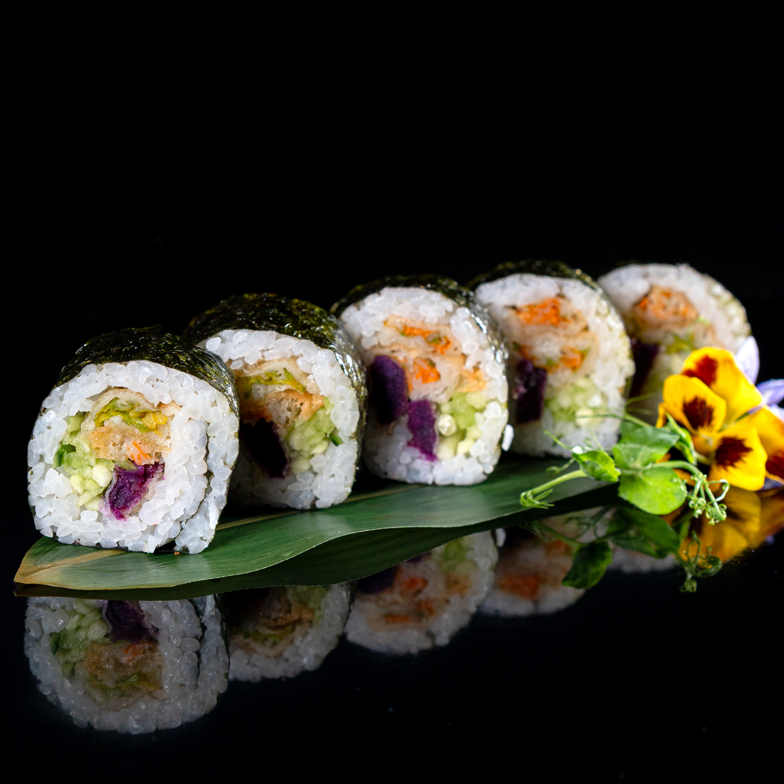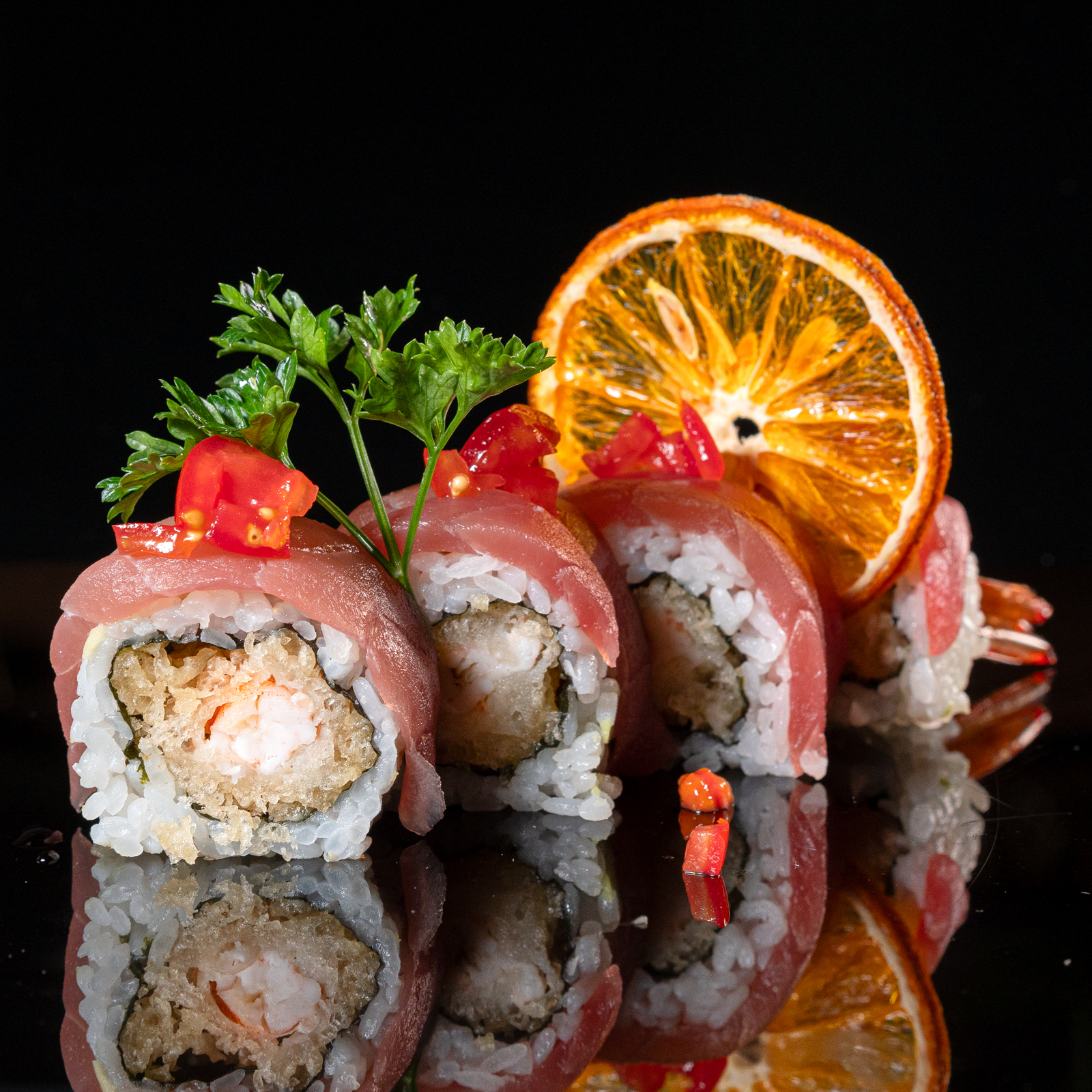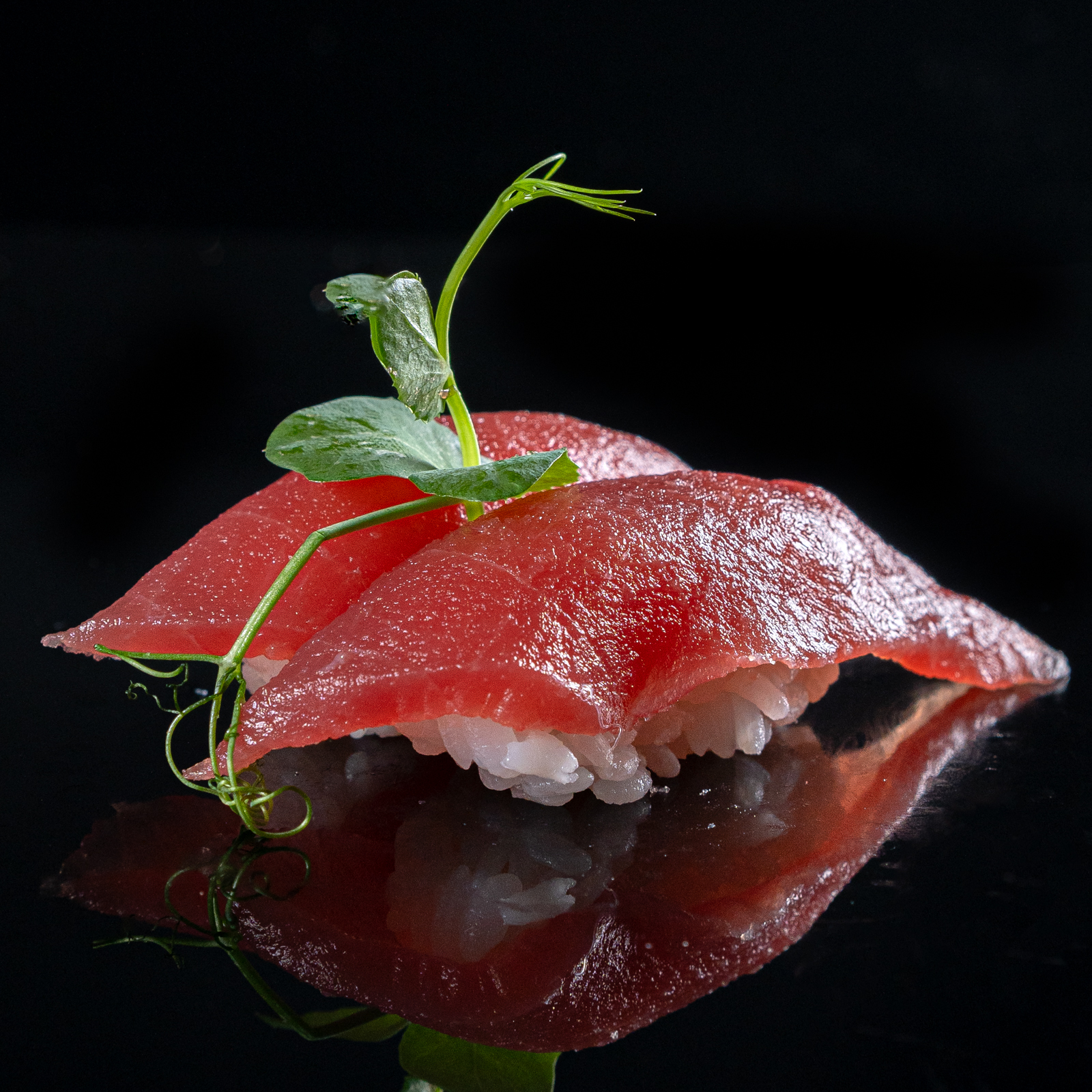 Un connubio di sapori: agrumi del ponzu, la ricchezza del sesamo e la cremosità del goma, con il tocco piccante del wasabi e la dolcezza esotica della frutta della passione.