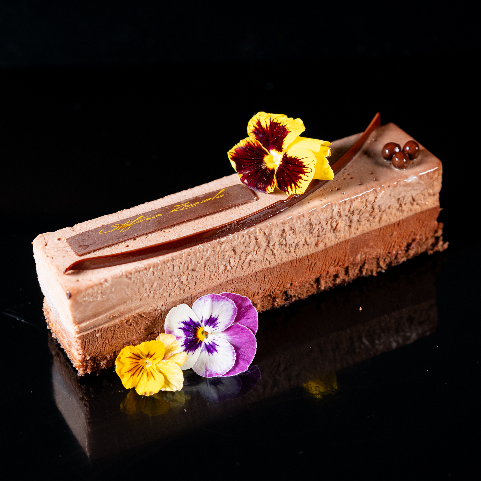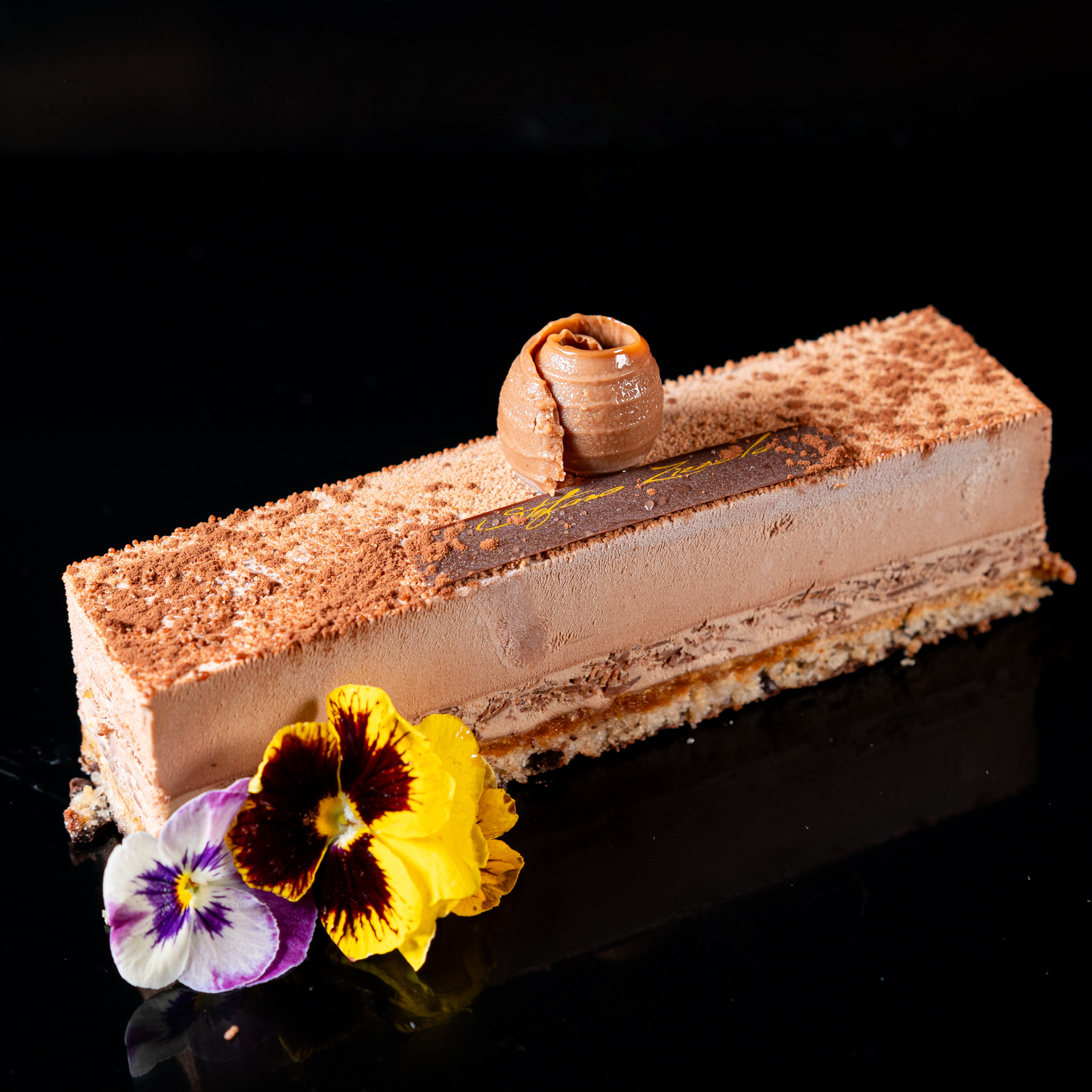 mousse al cioccolato fondente grand cru 70% cacao, bavarese alle nocciole pralinate e sfogli sottili di cioccolato fondente su biscotto morbido al cioccolato e nocciole con cereali