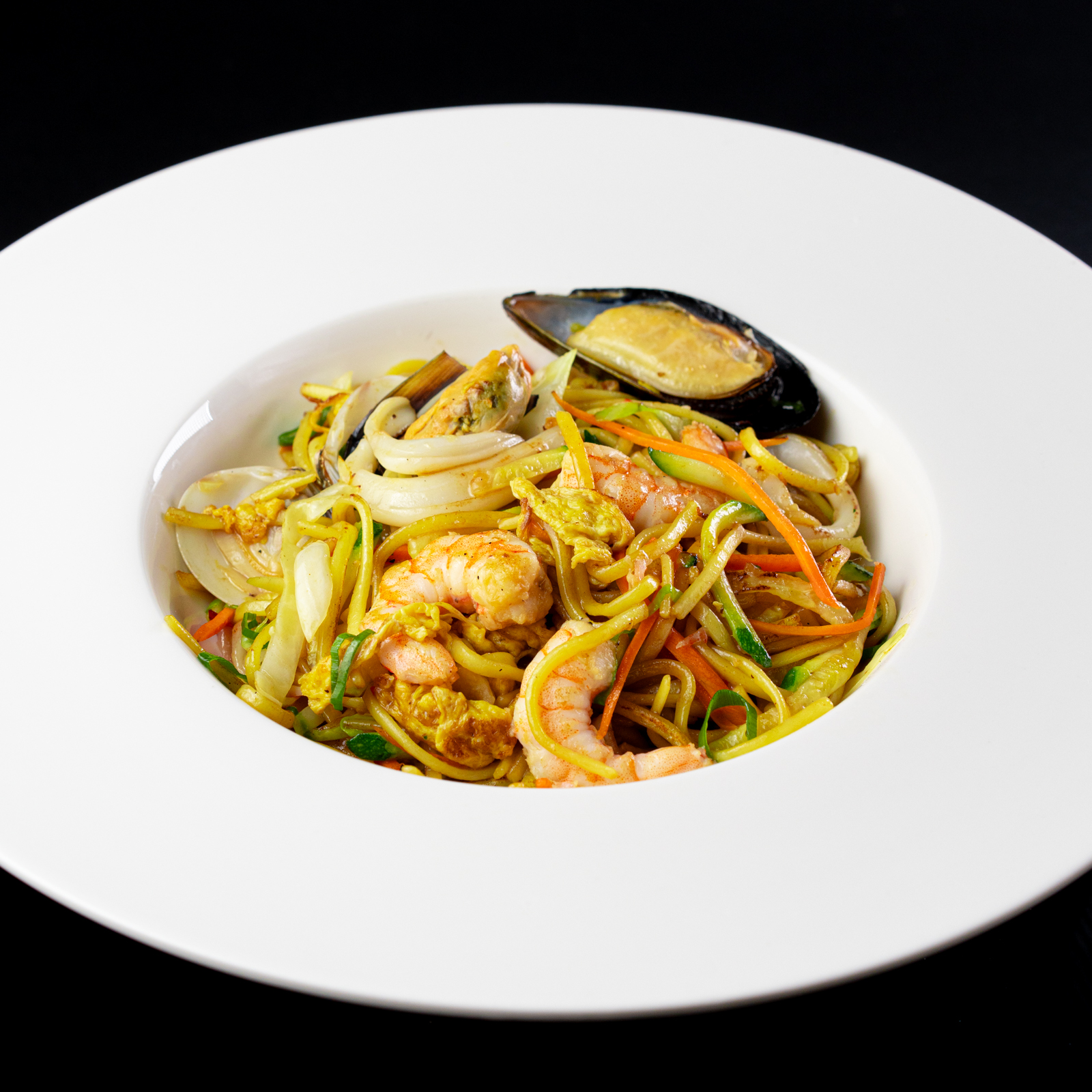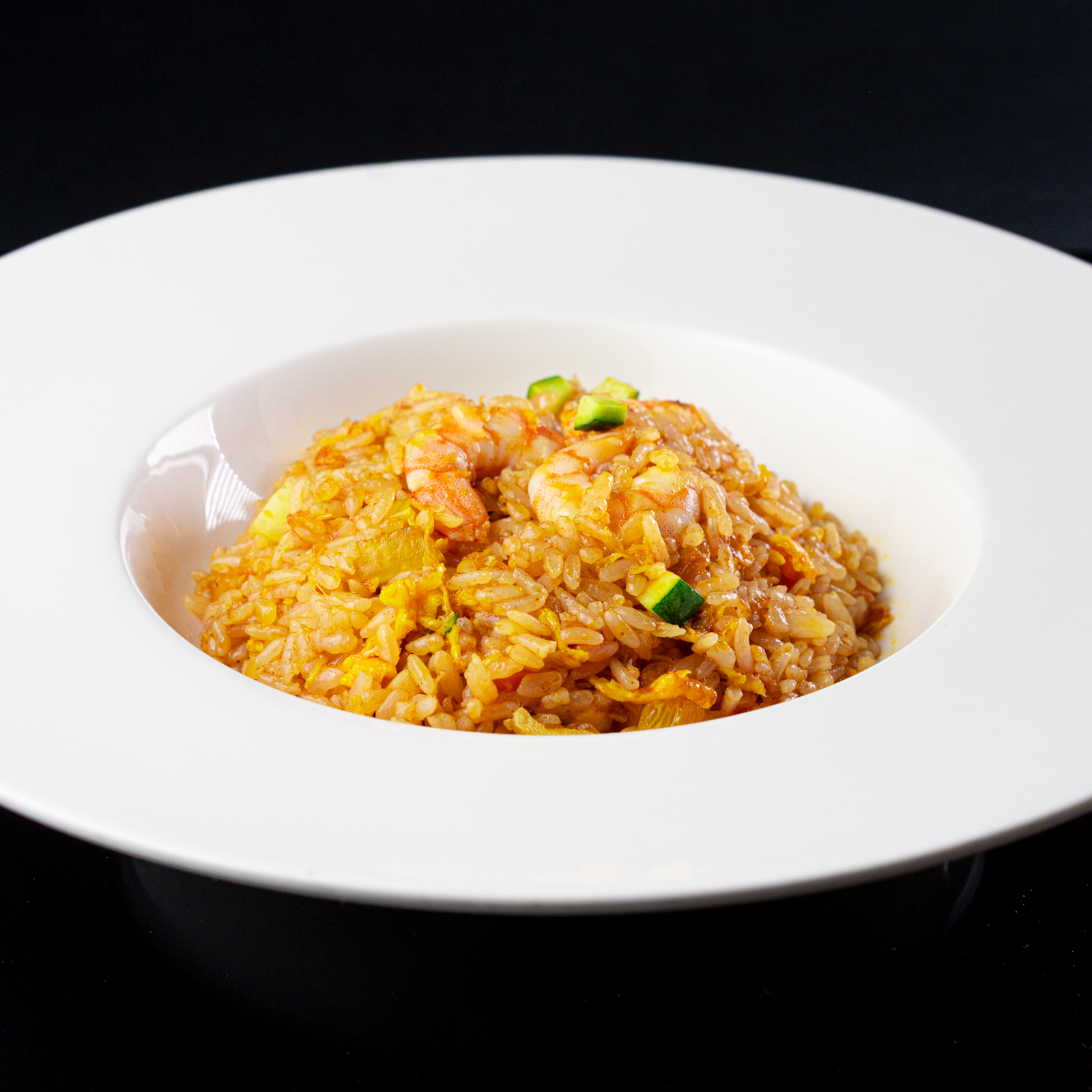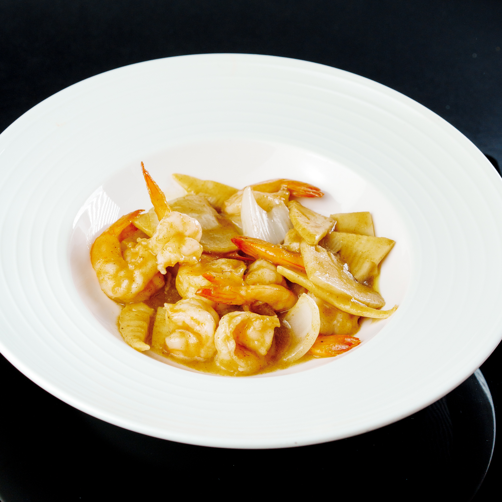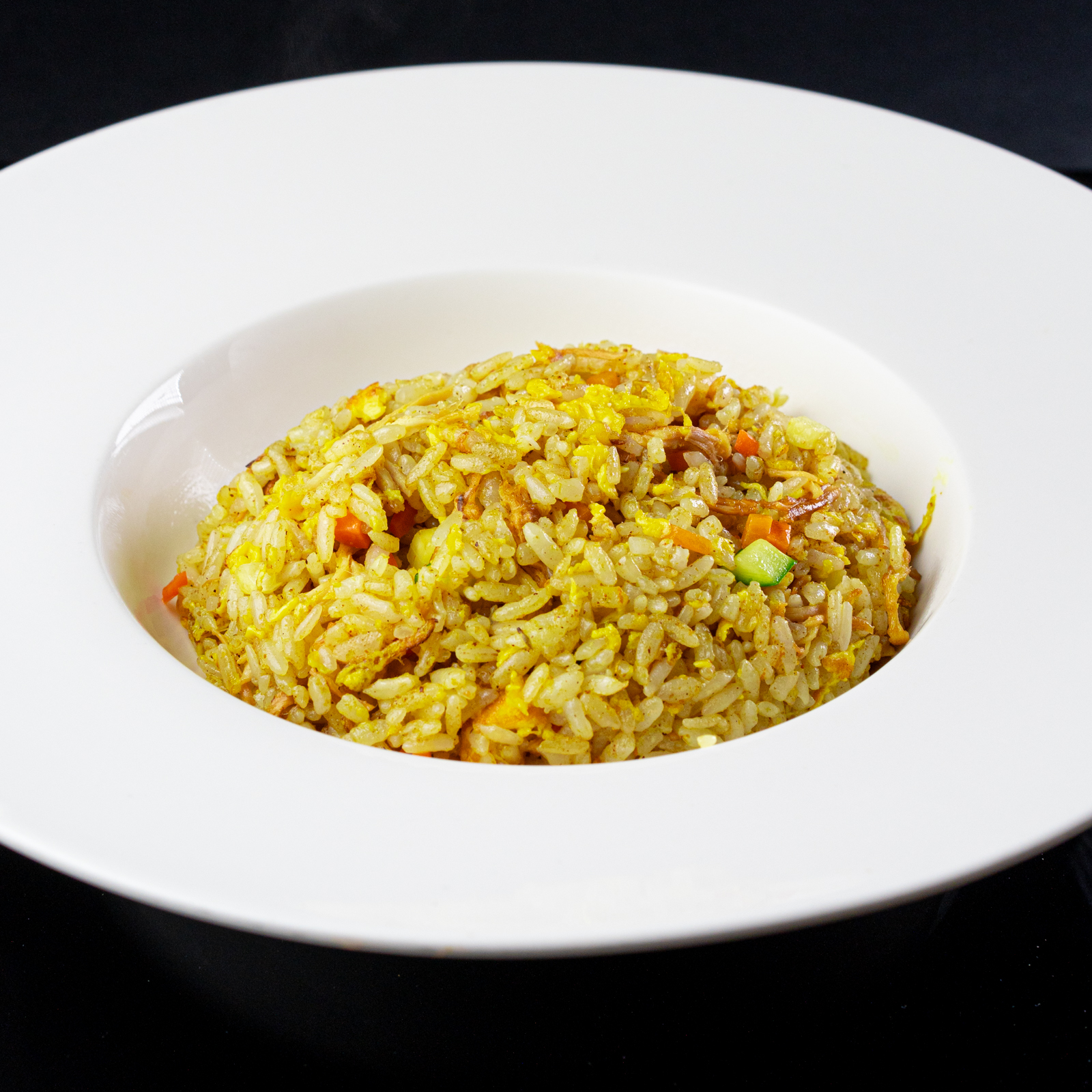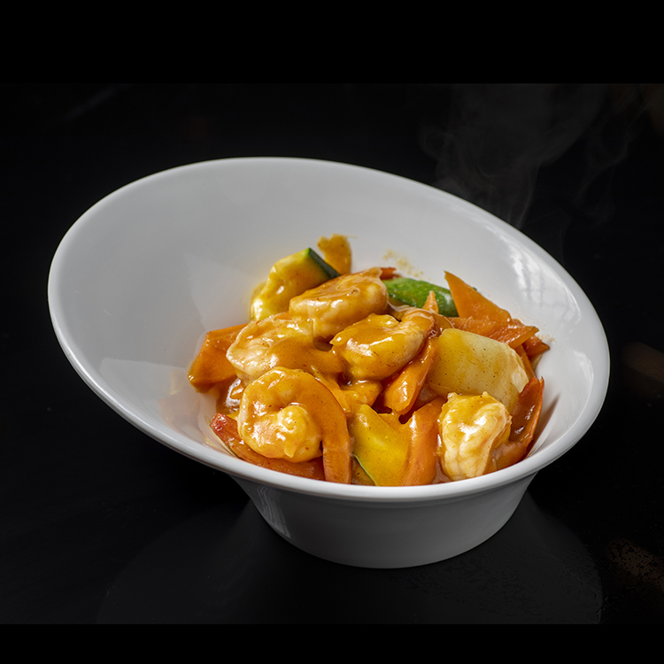 Riso bianco saltato con verdure miste, gamberi al latte di cocco e salsa curry