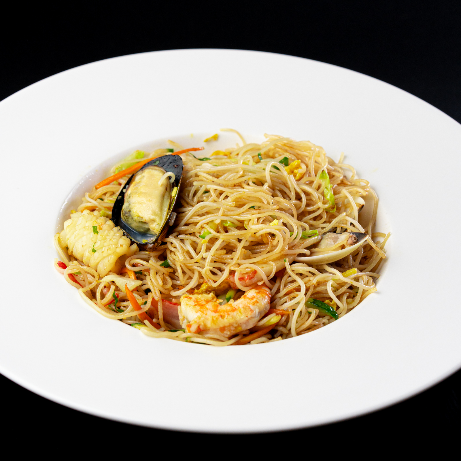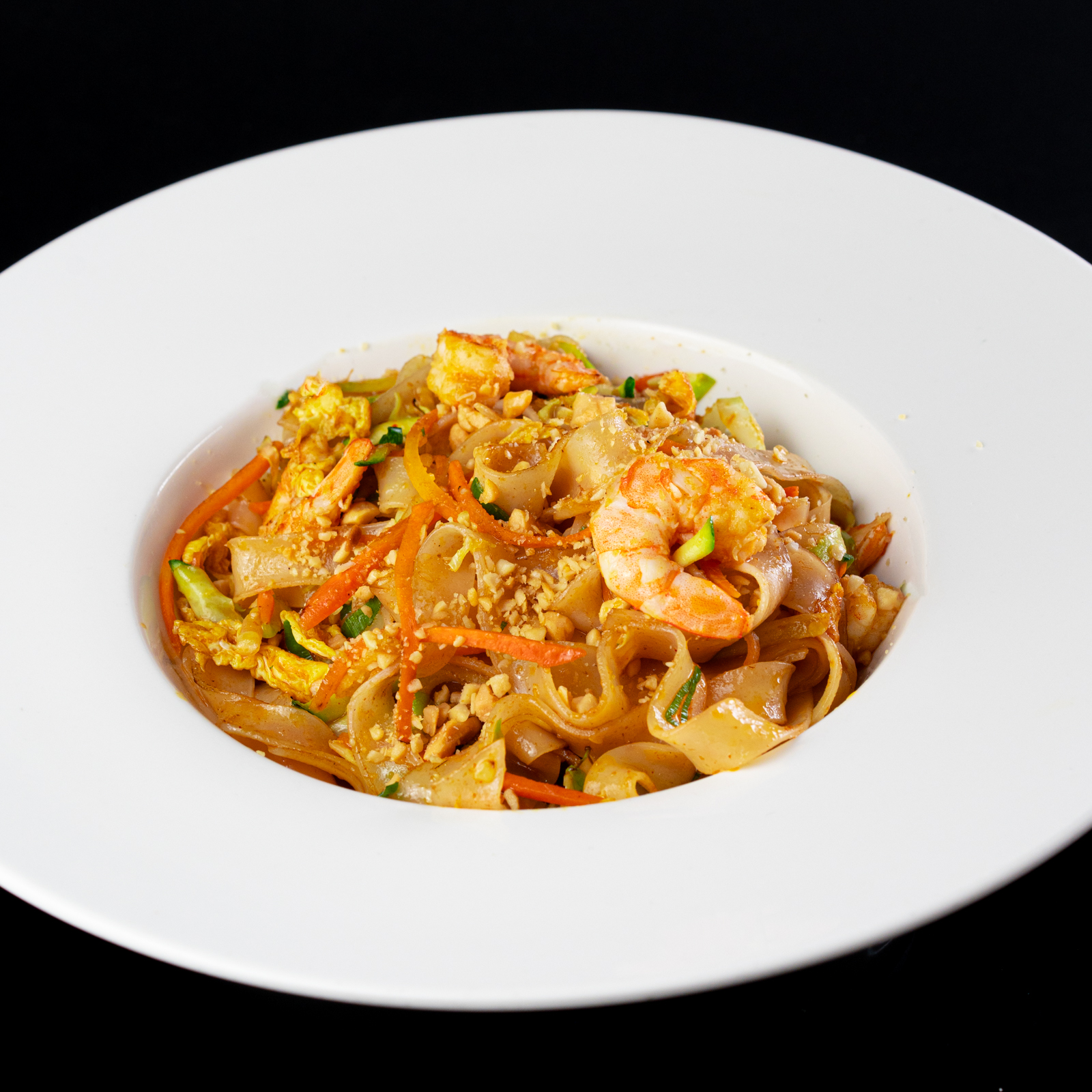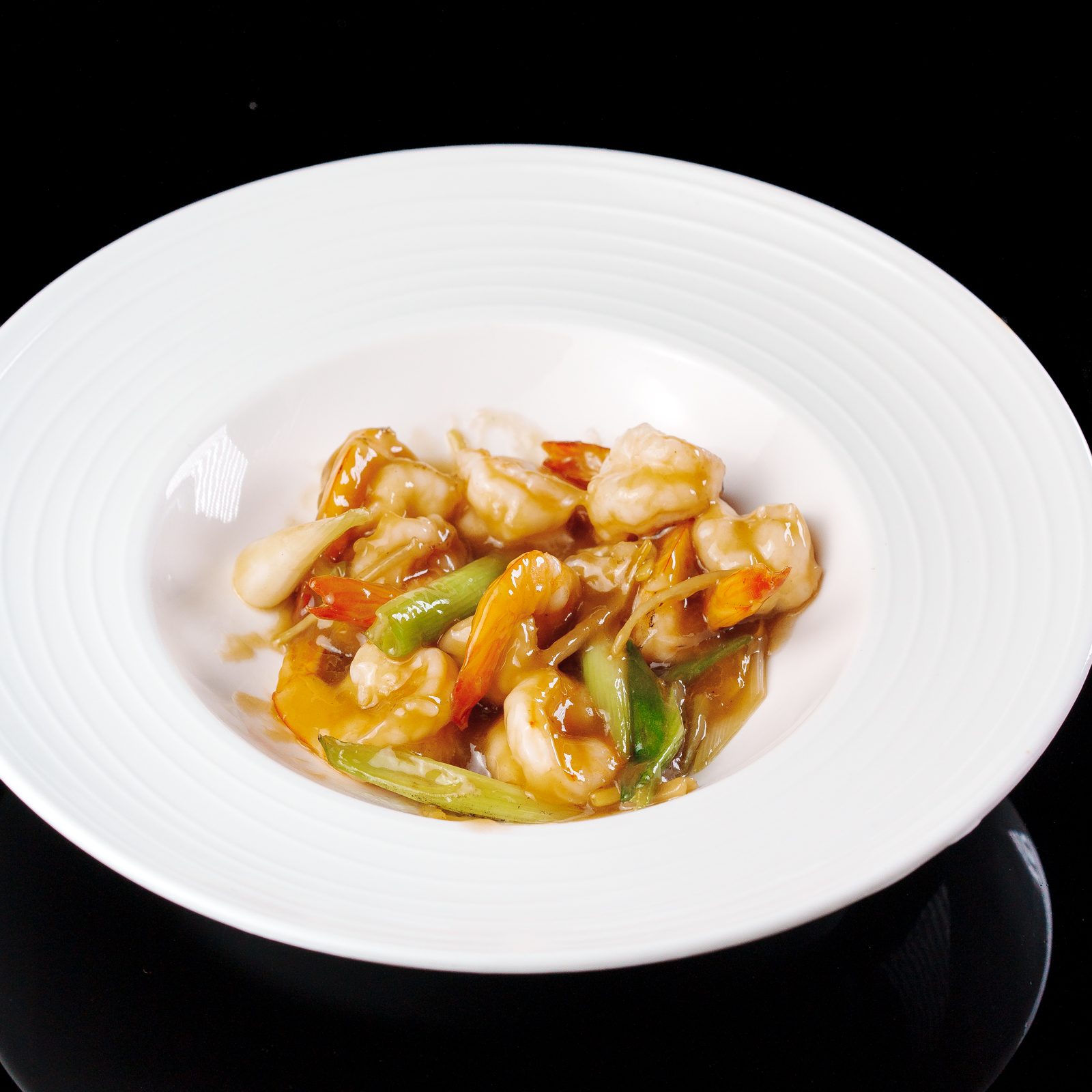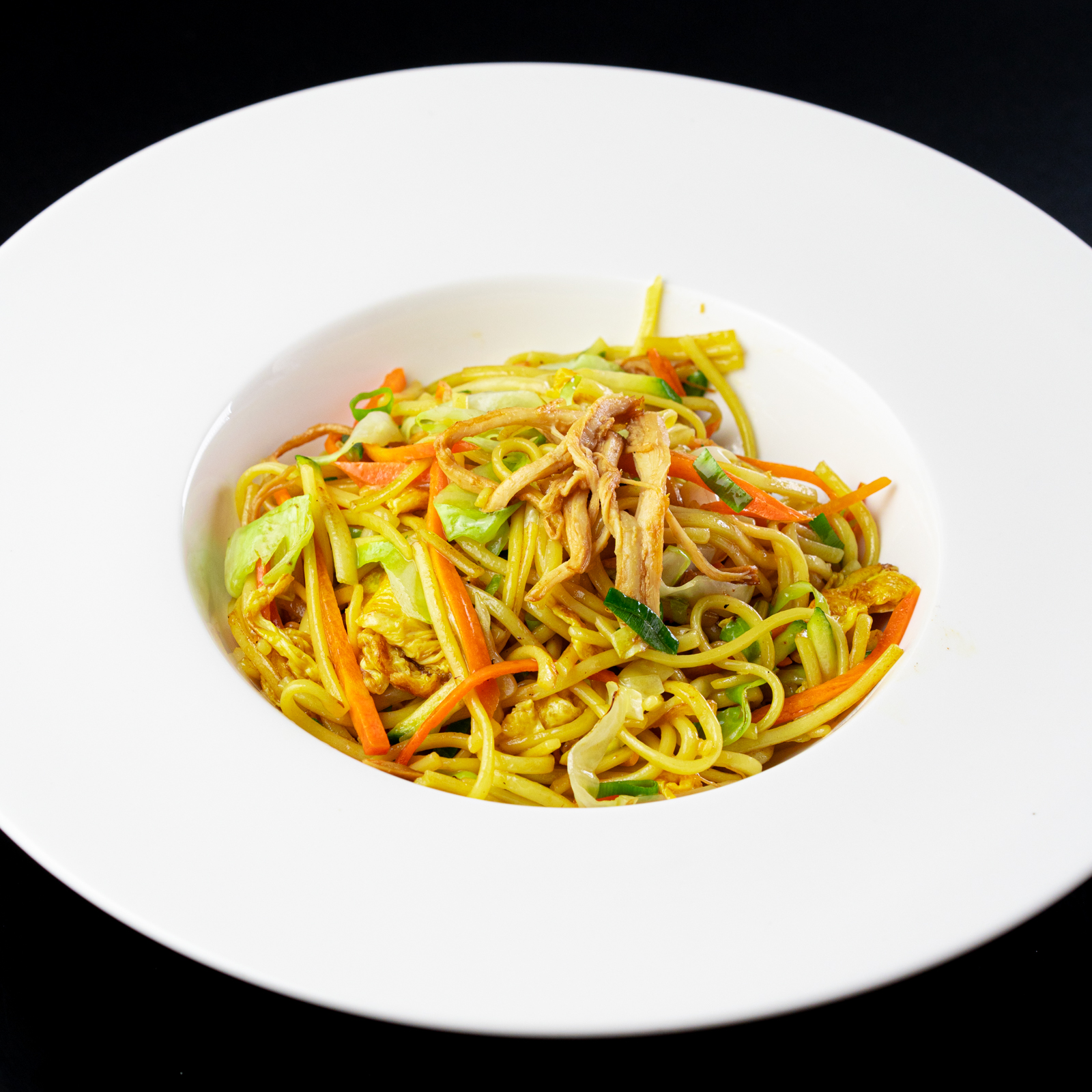 Riso bianco saltato con verdure miste, gamberi al latte di cocco e salsa curry