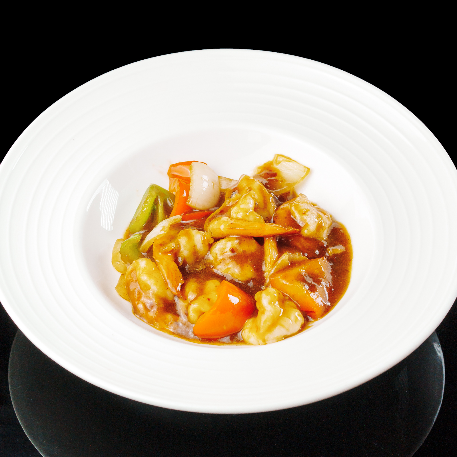 bocconcino di carne fritto mantenendo la croccantezza, saltato con verdure e salsa agrodolce fatto in casa