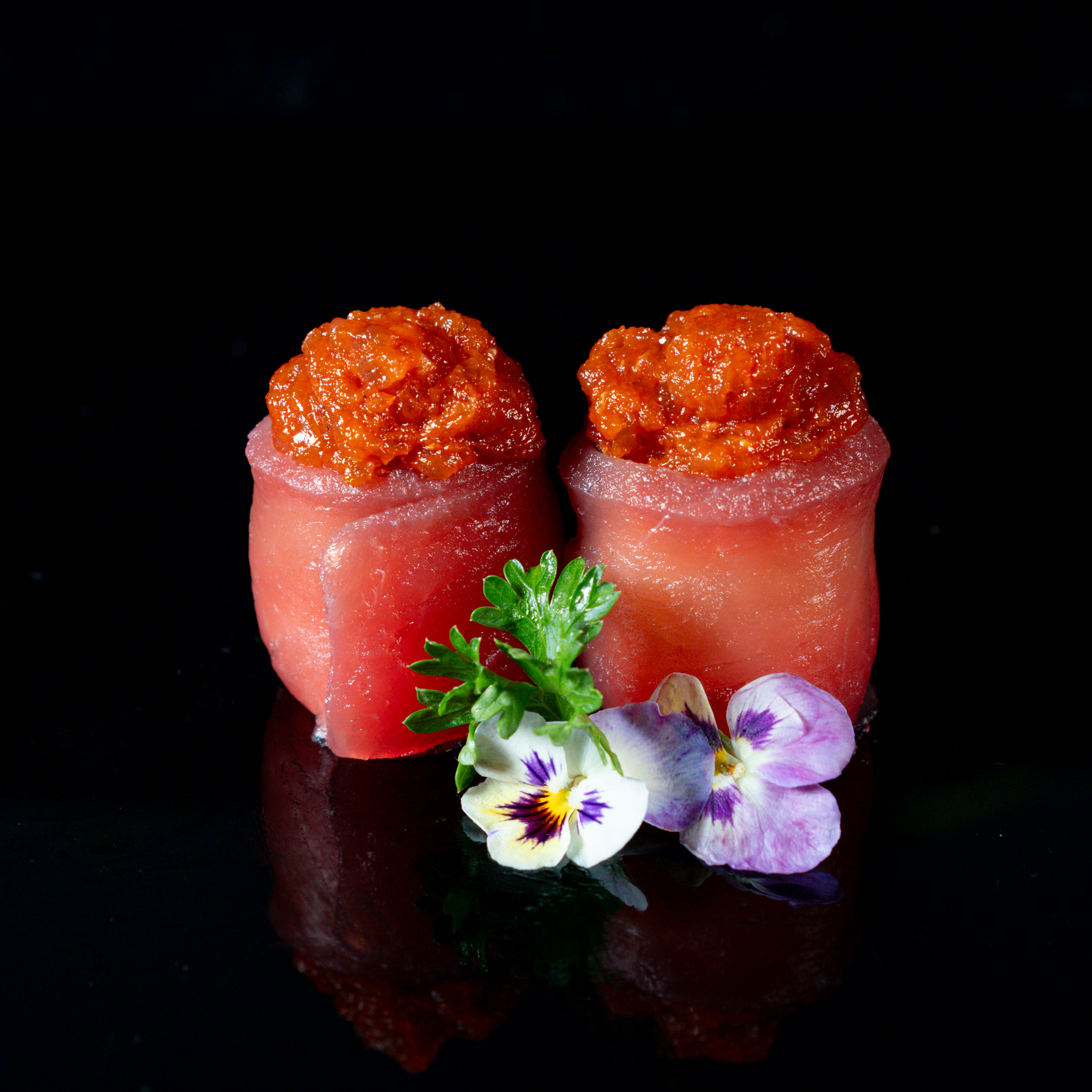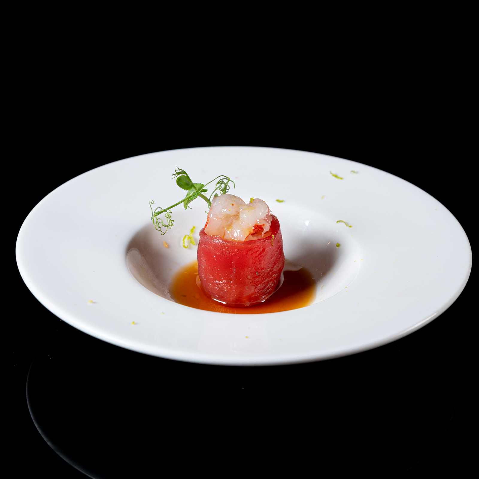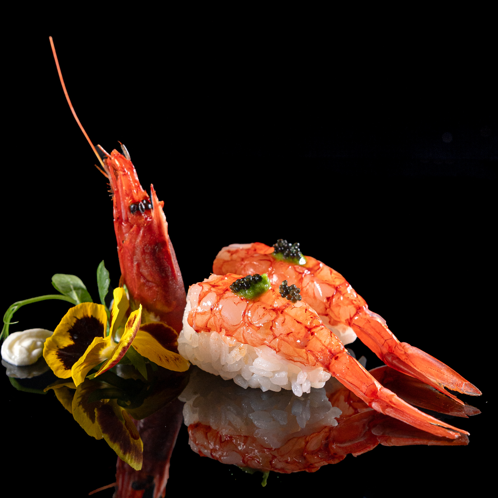 Gambero mazara, salsa rucola, tobiko nero. GLUTEN FREE. Specificare nell'ordine se si è celiaci.
