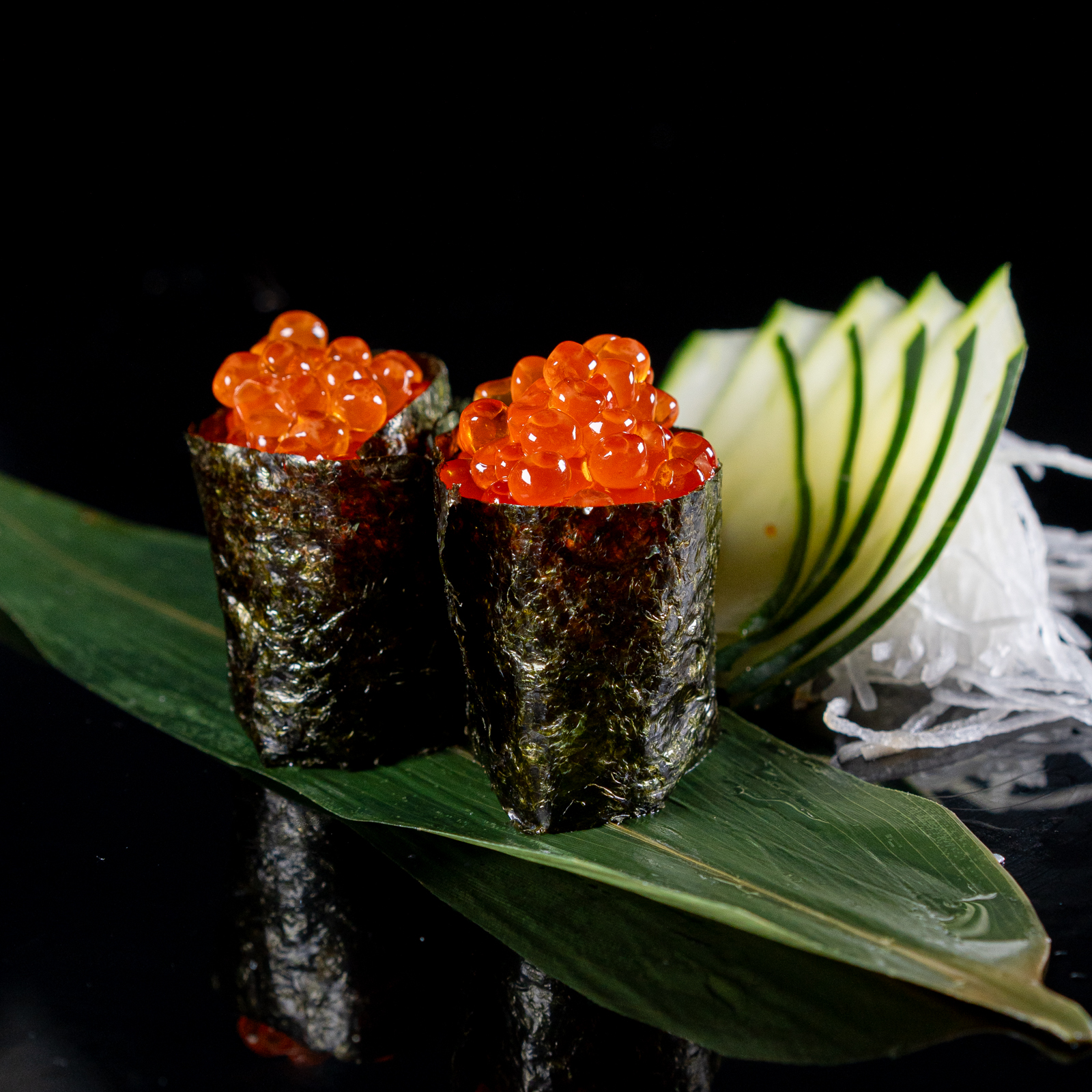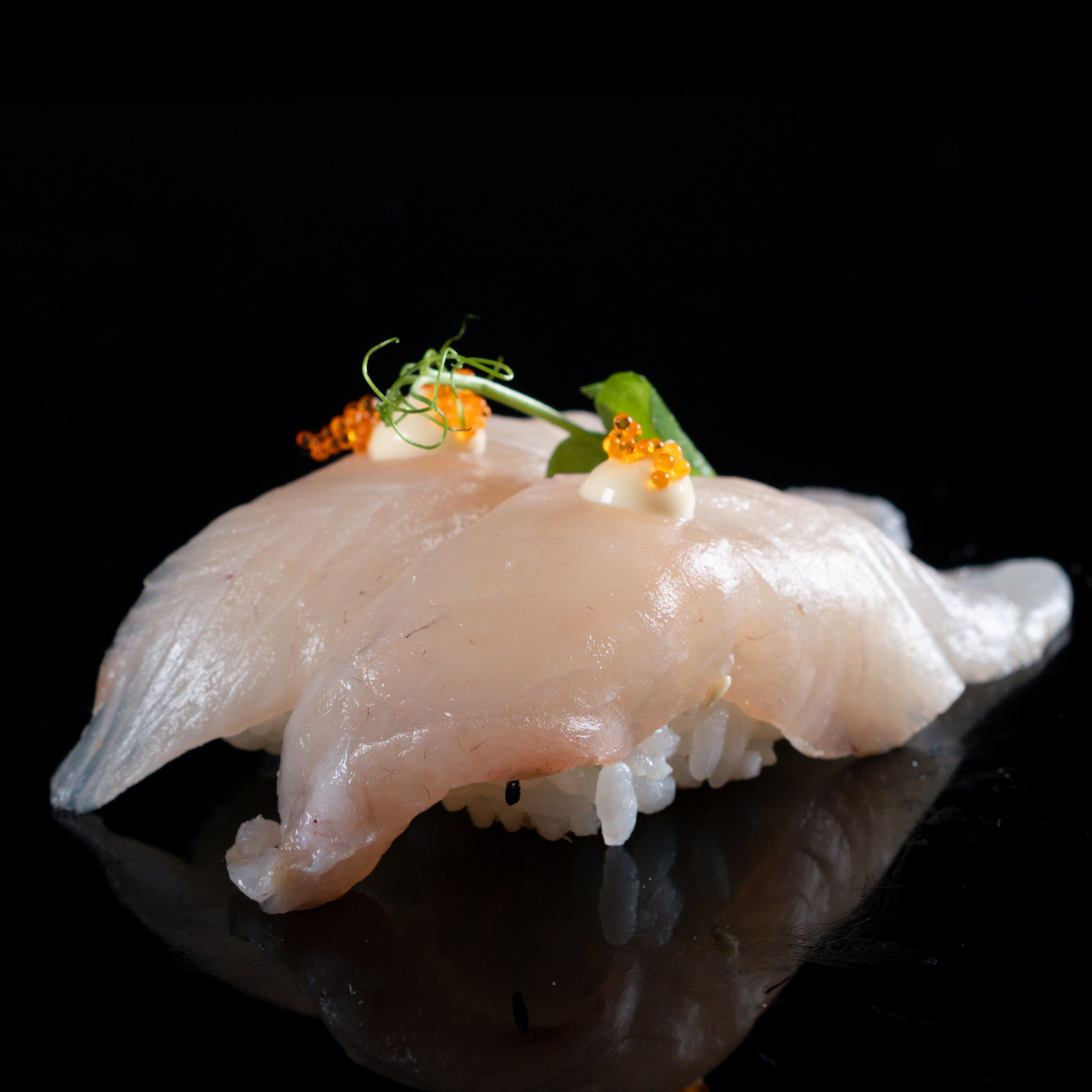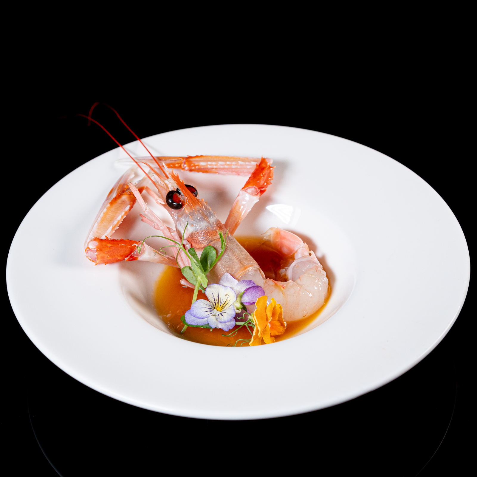 Gambero mazara, salsa rucola, tobiko nero. GLUTEN FREE. Specificare nell'ordine se si è celiaci.
