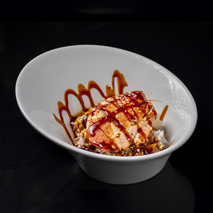 Riso, tartare di salmone, ikura, scaglie di mandorle, salsa teriyaki. questo piatto puoi essere oridinato anche da persone celiaci, specificando nella notazione senza salsa teriyaki