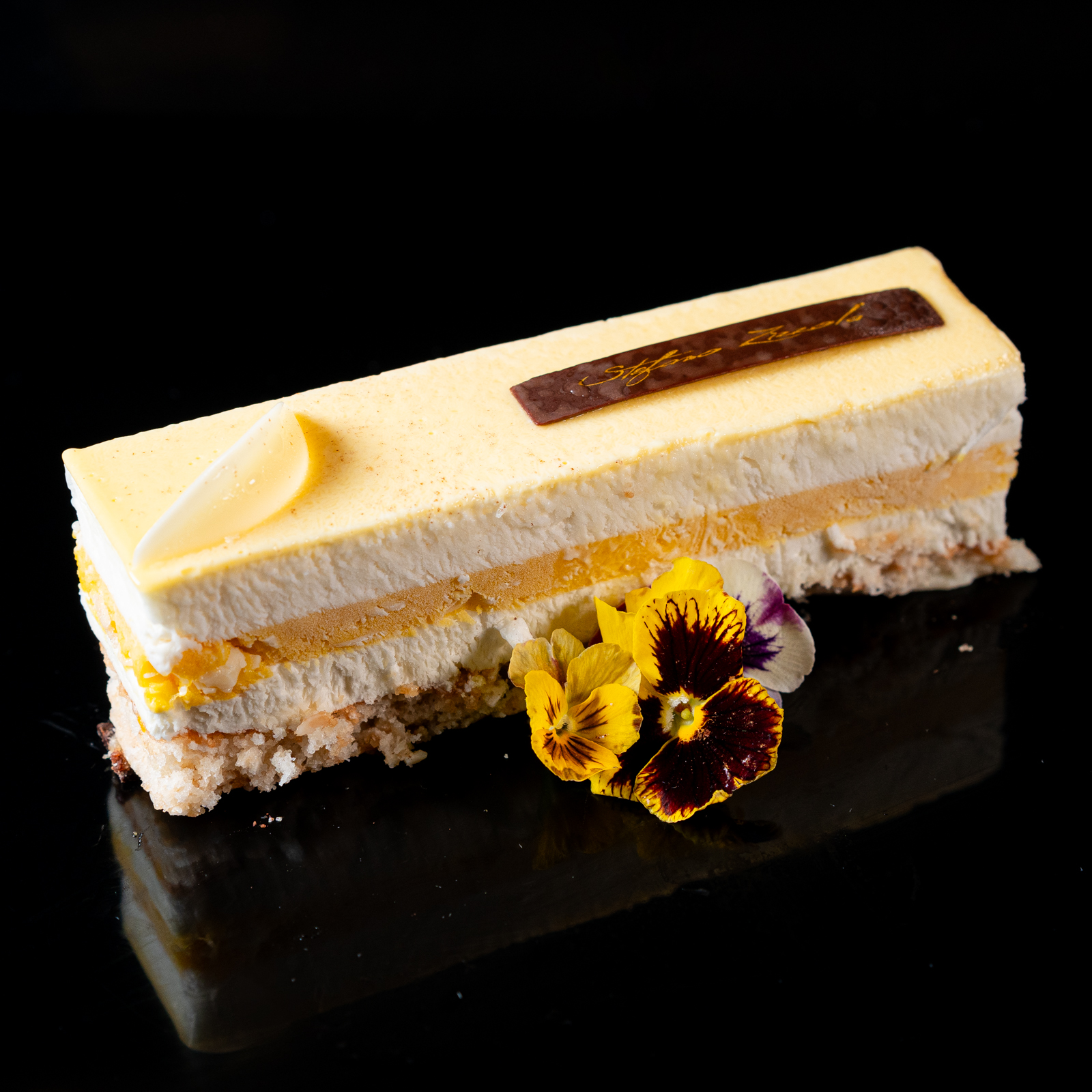 Morbida meringa al cocco, cremoso al frutto della passione, sfoglie di cioccolato bianco e mousse al cocco.