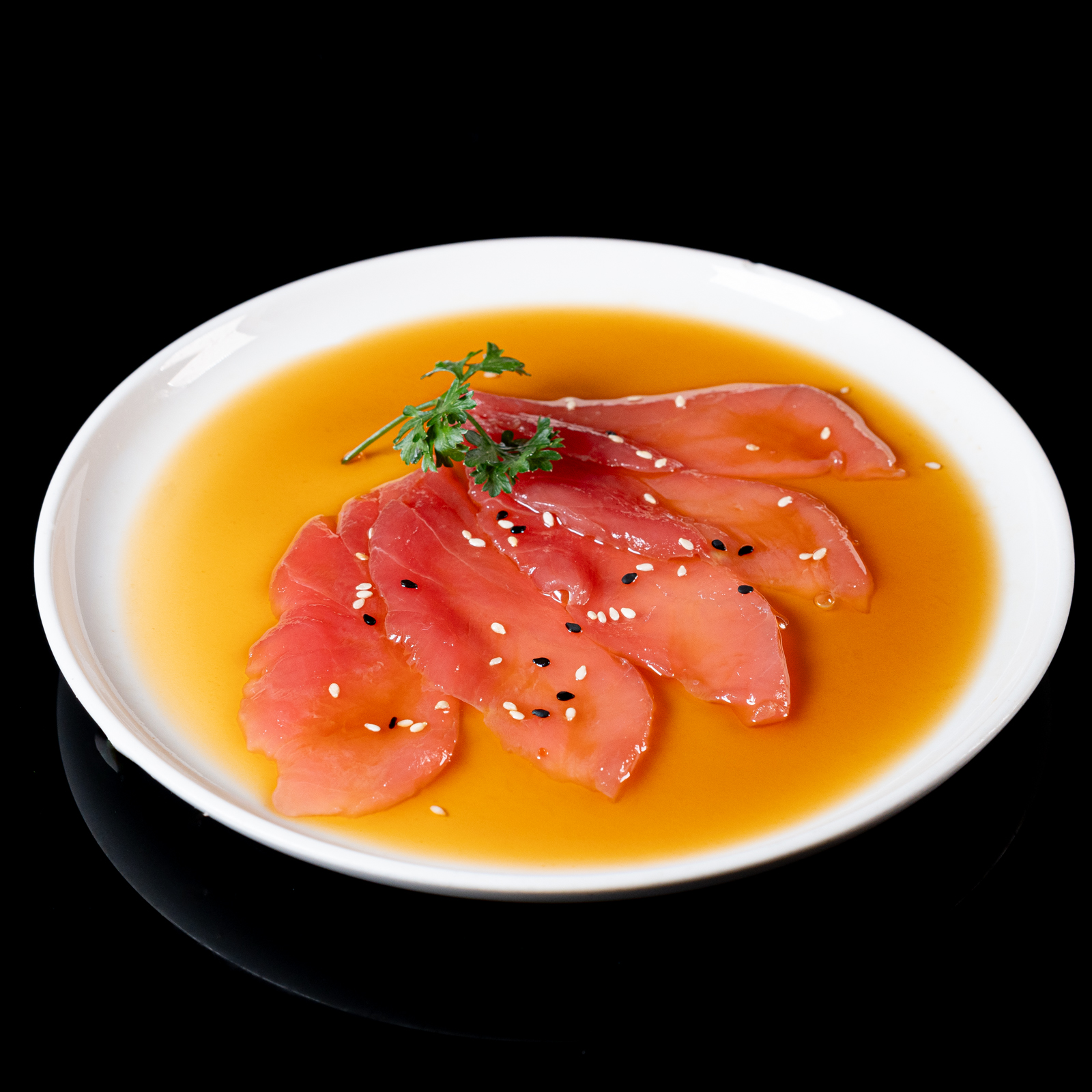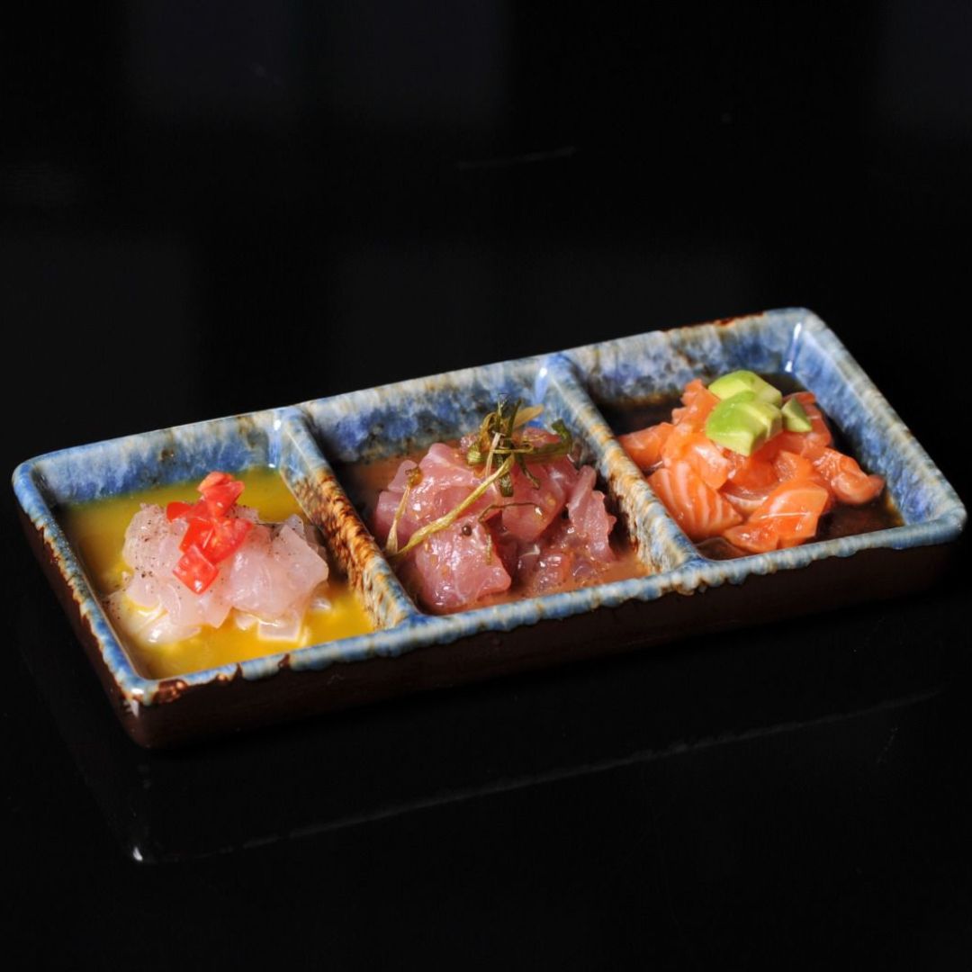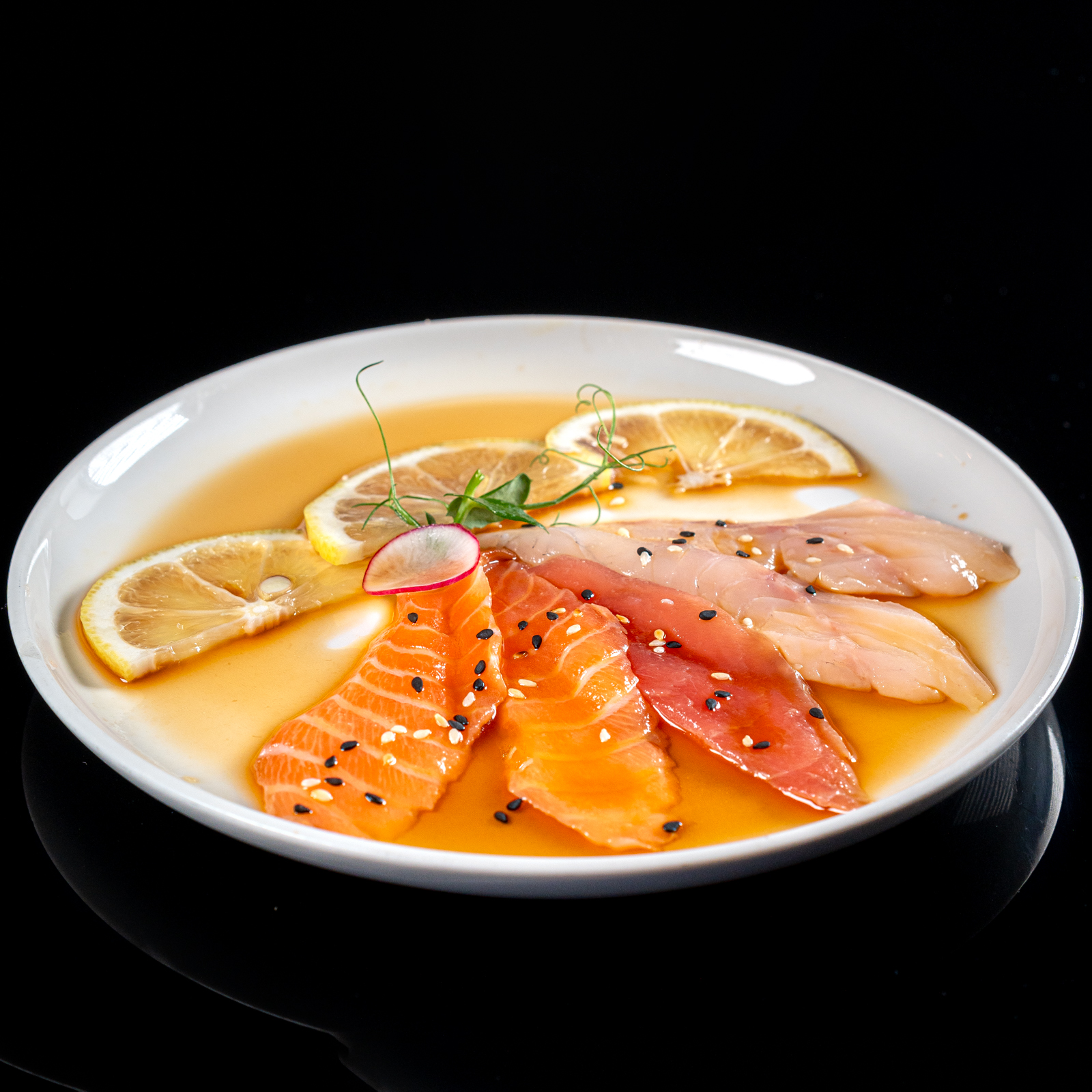 Carpaccio di salmone, branzino, tonno, salsa ponzu, sesamo