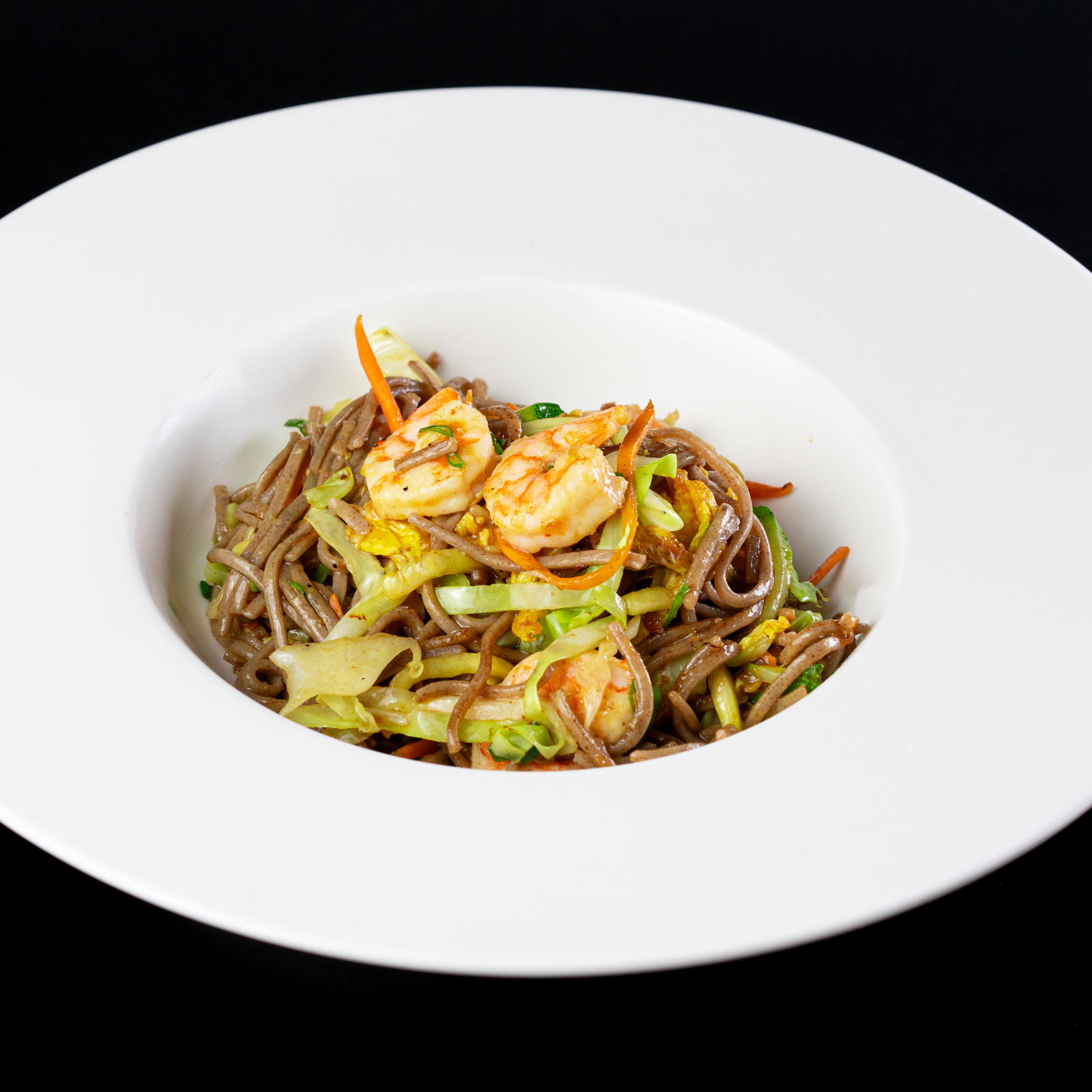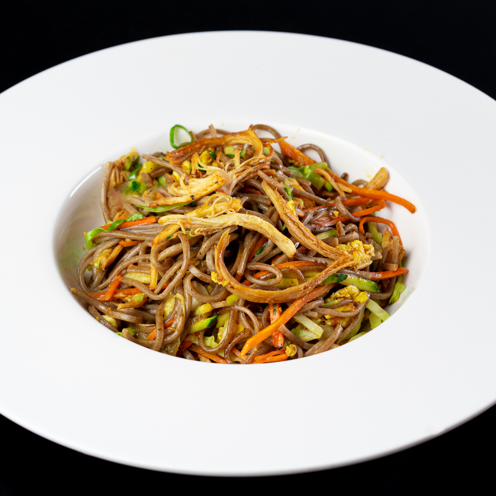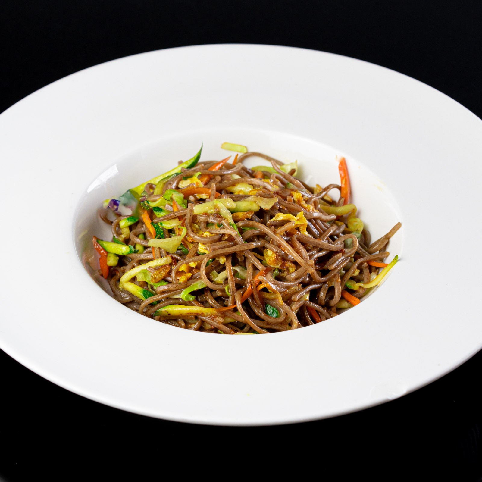 Noodles, cipollotto, surimi naruto, verdure, bocconcino di manzo saltato, uovo sodo