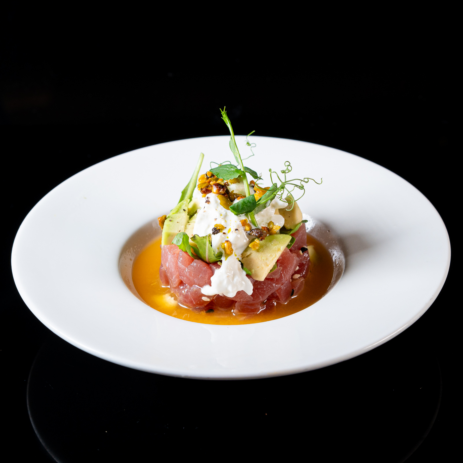 Tonno, avocado, rucola fresca, stracciatella burrata, granelli di pistacchio, profumo di agrumi, sale, pepe, olio evo. GLUTEN FREE. Specificare nell'ordine se si è celiaci.