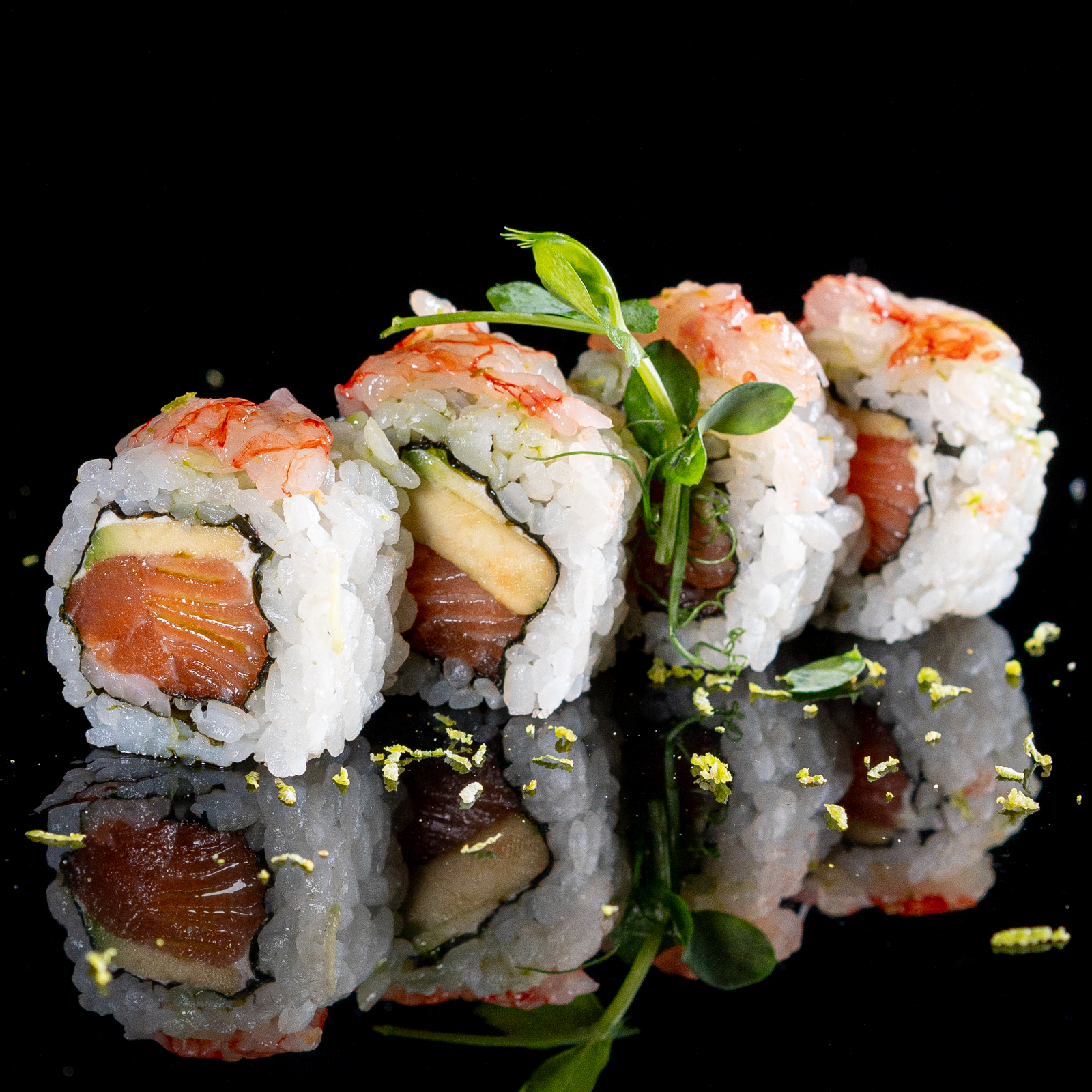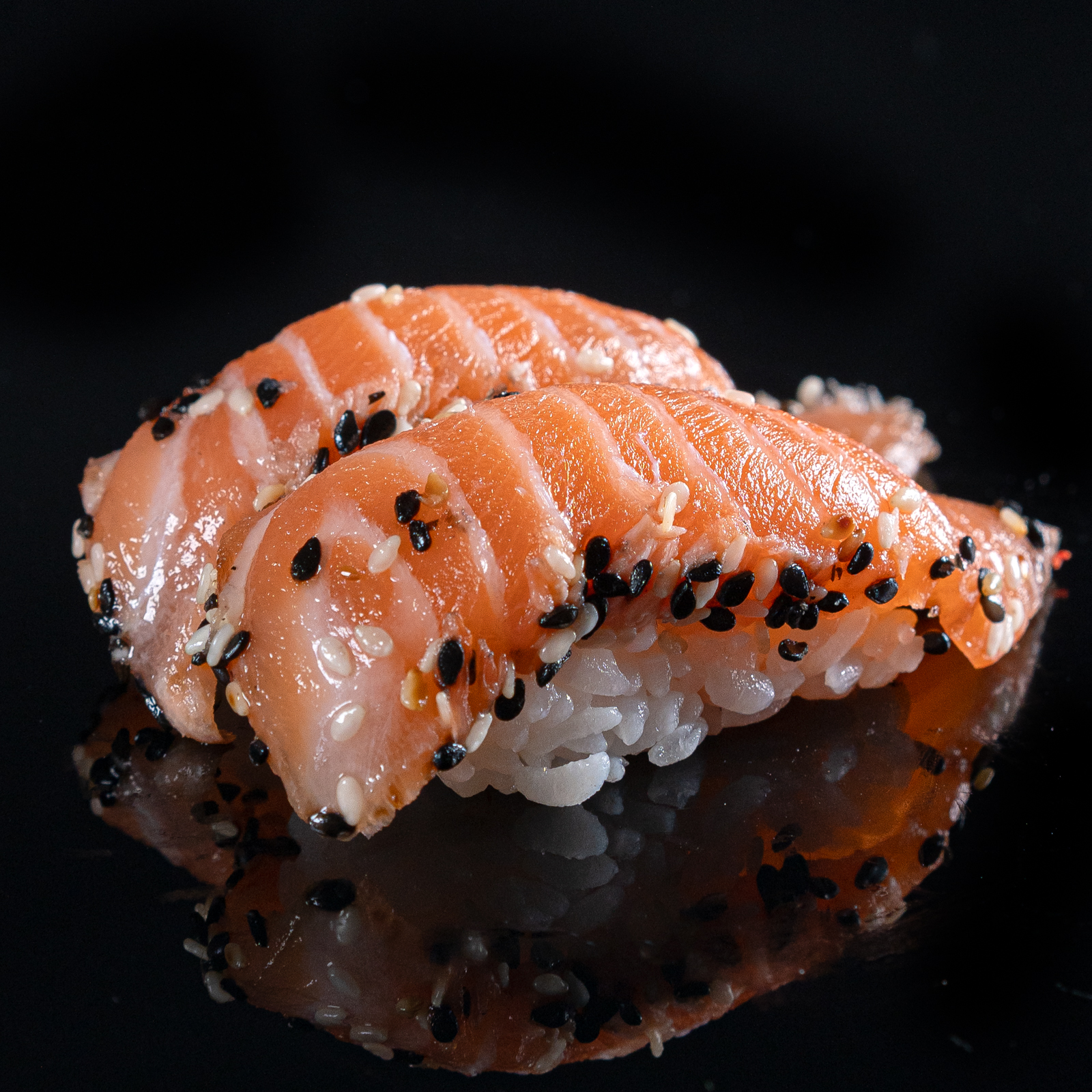Fettine di salmone, avocado, sesamo, teriyaki. GLUTEN FREE. Specificare nell'ordine se si è celiaci.